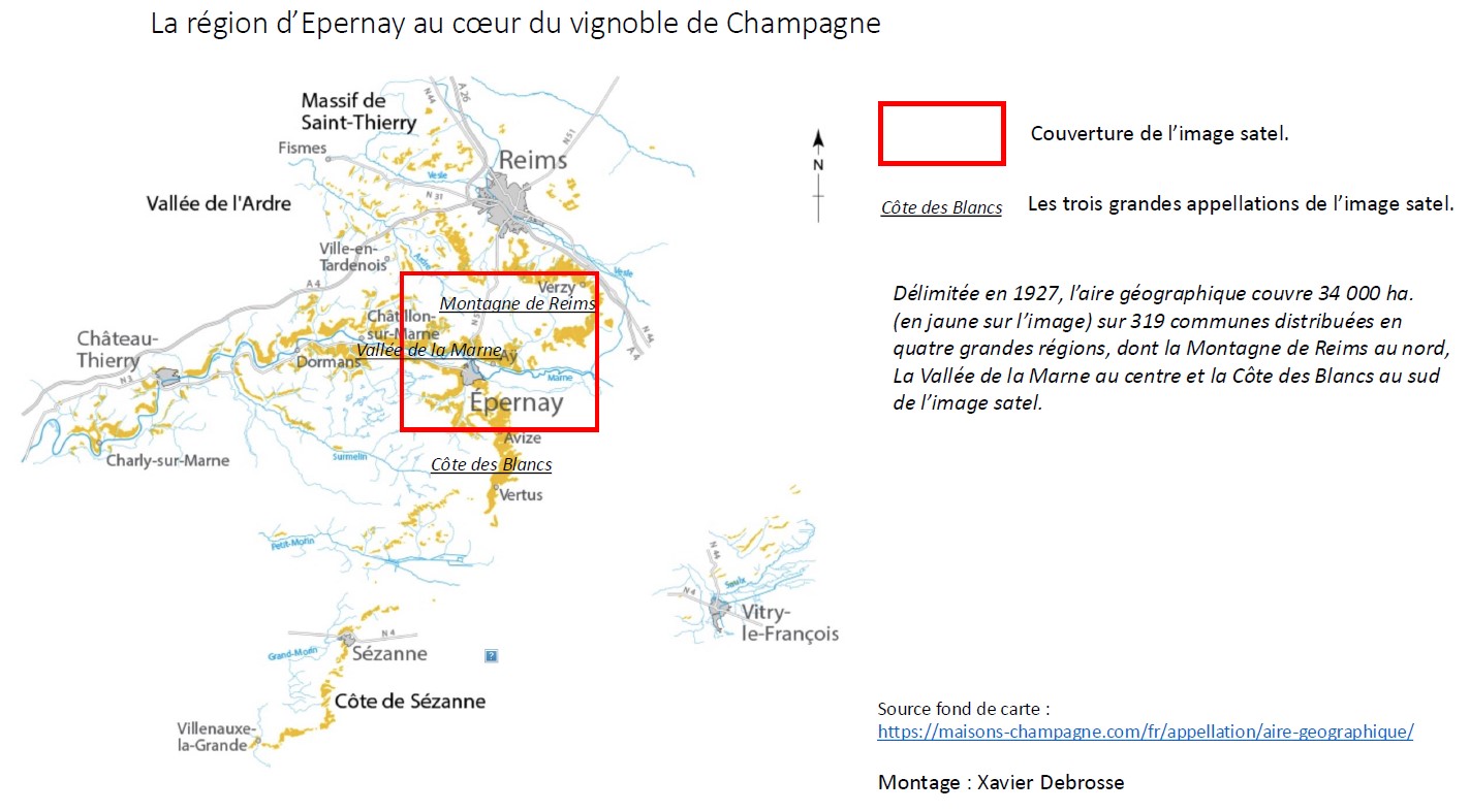 Cependant, le cadrage proposé est loin de représenter l’ensemble du vignoble de Champagne. Les 30 000 hectares de vignes nécessaires à sa production s’étirent le long de toute la côte d’Île-de-France, y compris dans les départements voisins, de l’Aube à l’Aisne. Des coteaux viticoles se trouvent aussi sur la côte de Champagne (en Haute-Marne et dans le sud-est de la Marne), à plus de 100 kilomètres d’Épernay. Cette dispersion s’explique par le fait que le champagne est un vin d’assemblage : il est composé de jus issus de différents cépages — pinot noir, meunier et chardonnay. L’élaboration de la boisson effervescente nécessite donc des achats de raisins d’une commune à l’autre. Les « maisons de champagne », marques les plus prestigieuses, ne possèdent d’ailleurs pas toujours de vignes : elles achètent les raisins aux vignerons de l’AOC, puis les assemblent avant de commercialiser les bouteilles (négociants-manipulants). Depuis les années 1950, ce modèle est complété par celui des récoltants-manipulants, des vignerons qui vinifient eux-mêmes leur production, seuls ou via des coopératives.