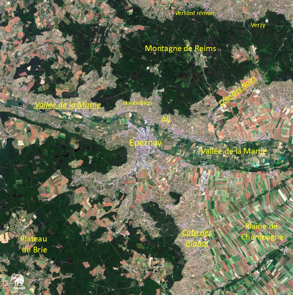 L’image représente le lieu où se rencontrent le plateau de la Brie et la plaine de Champagne. Les deux sont séparés par un talus (ou cuesta), la côte d’Île-de-France. À gauche de l’image, le plateau ne s’élève qu’à une altitude maximale de 250 mètres et est recouvert de vastes forêts. Entre 100 et 150 mètres plus bas, à droite de l’image, la plaine céréalière dévoile sa marqueterie de champs rectangulaires. Au centre, la vallée de la Marne, orientée est-ouest, forme un entonnoir où se trouve la ville d’Épernay.