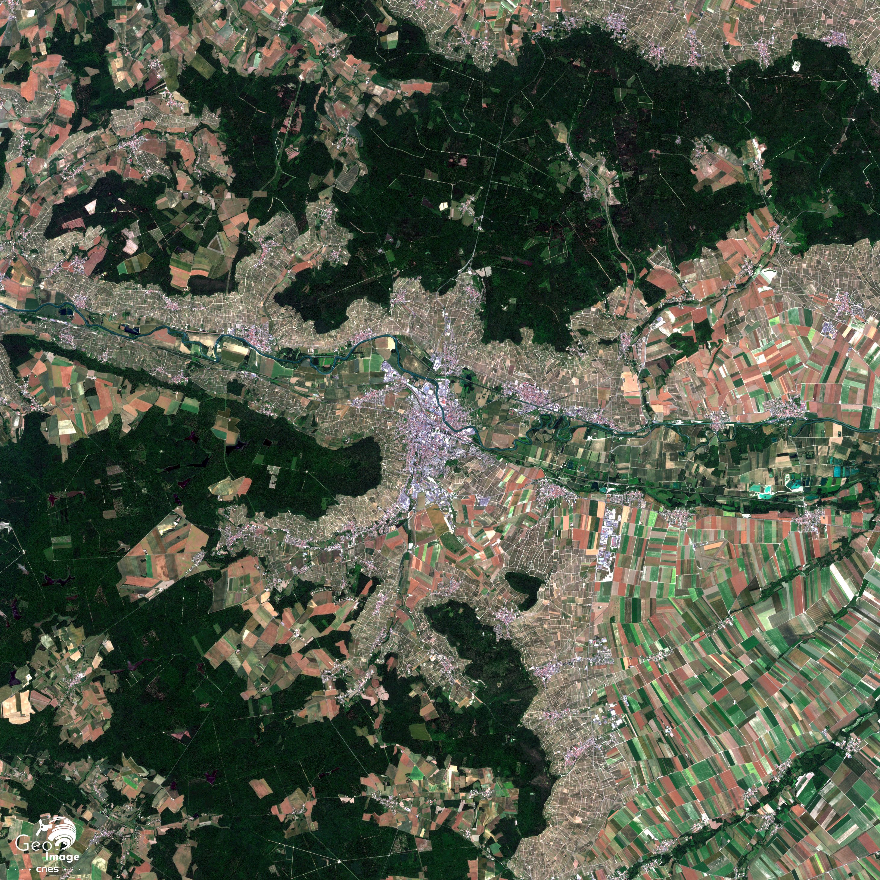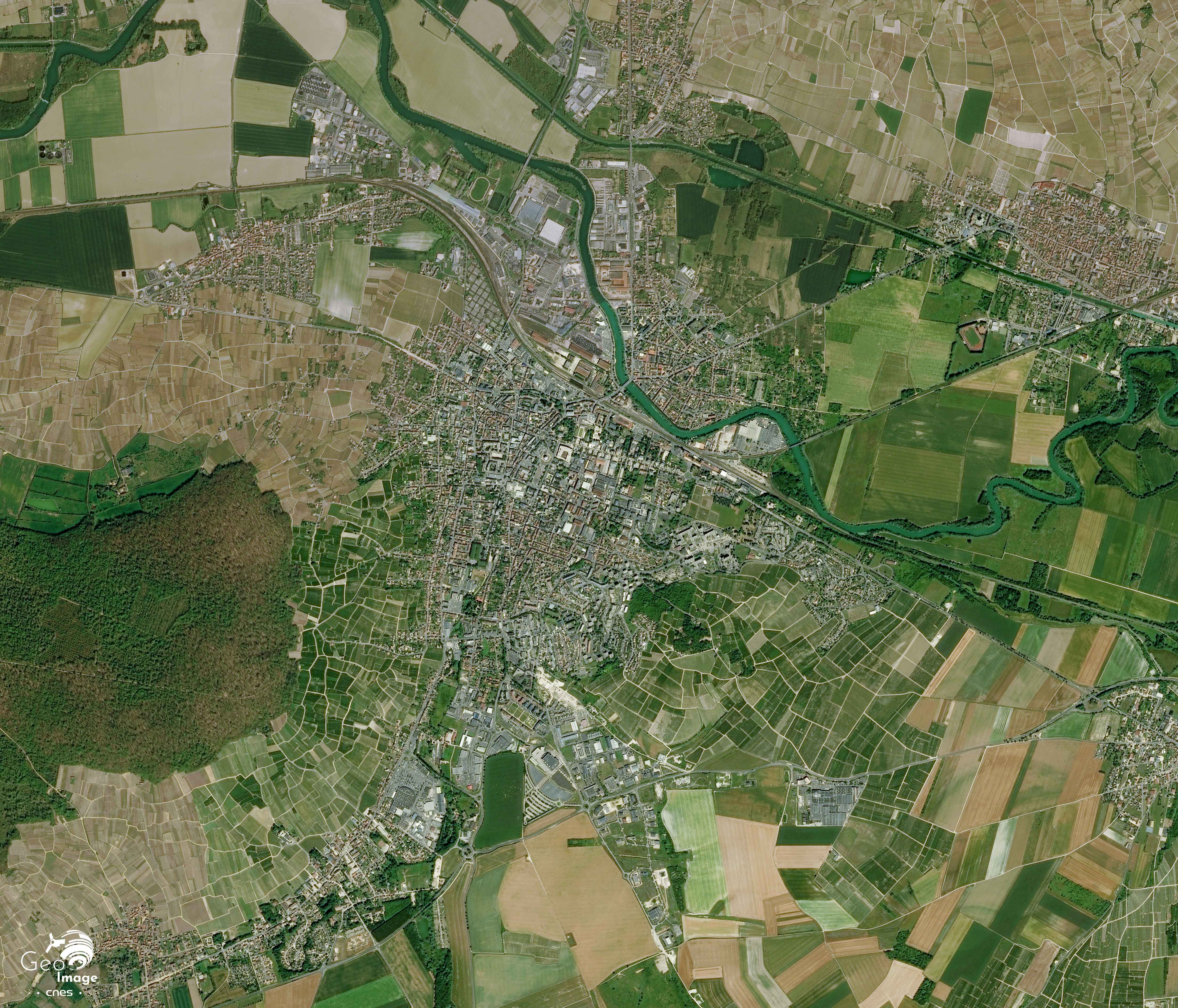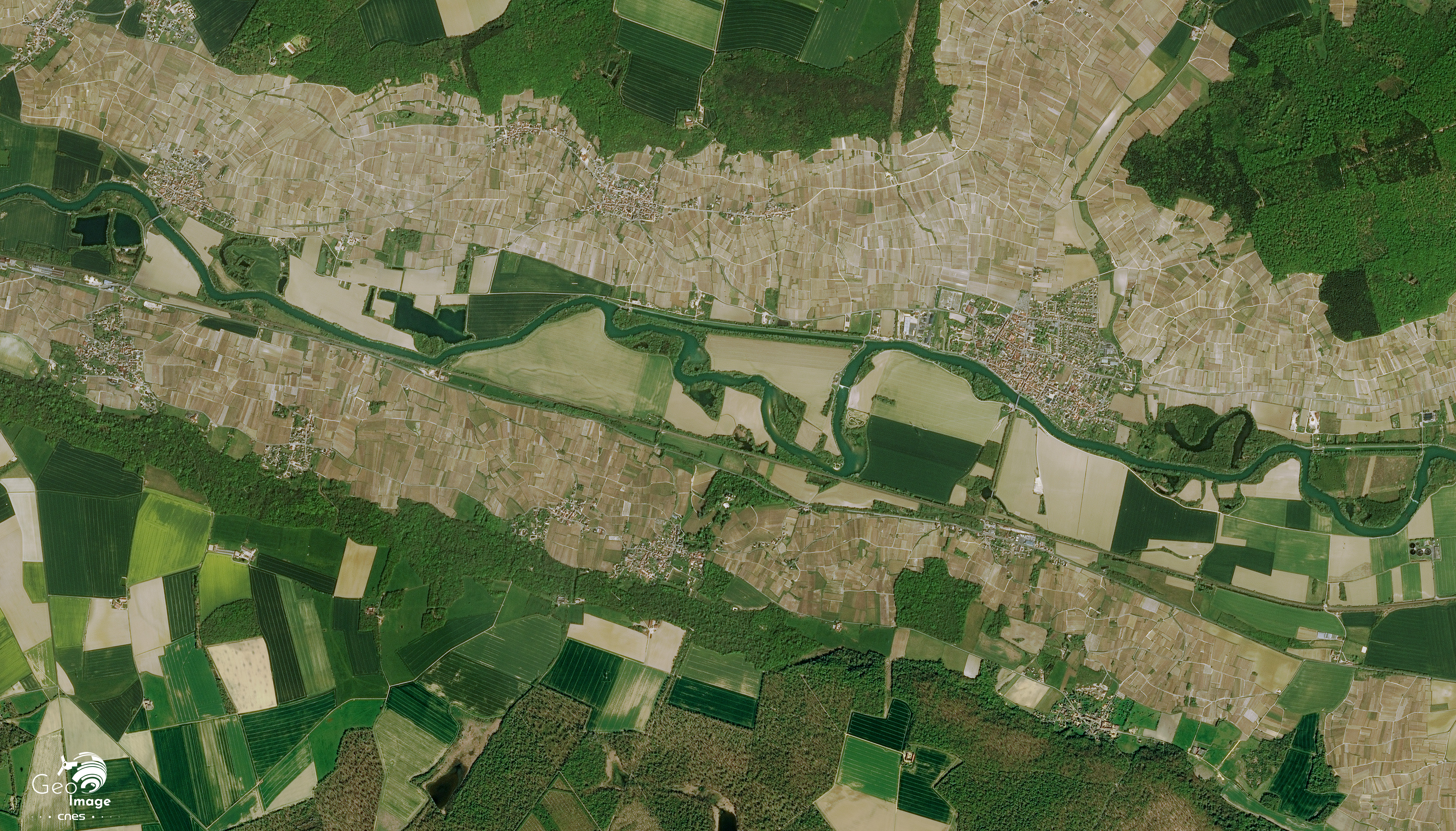 La Marne et son lit occupent une bande vert-ocre d’environ quatre kilomètres de largeur. Les méandres de la rivière en constituent la limite nord. Un canal latéral, moins sinueux, double le cours d’eau. Au sud de l’axe, on distingue le tracé rectiligne de la ligne de chemin de fer dite de la « Vallée de la Marne », qui relie Paris à Bar-le-Duc (Meuse). Parallèle à la voie ferrée, l’ancienne nationale 3 (Paris-Metz) traverse les villages en filant vers l’est ; elle ne franchit la Marne qu’une vingtaine de kilomètres plus loin, à Châlons-en-Champagne.