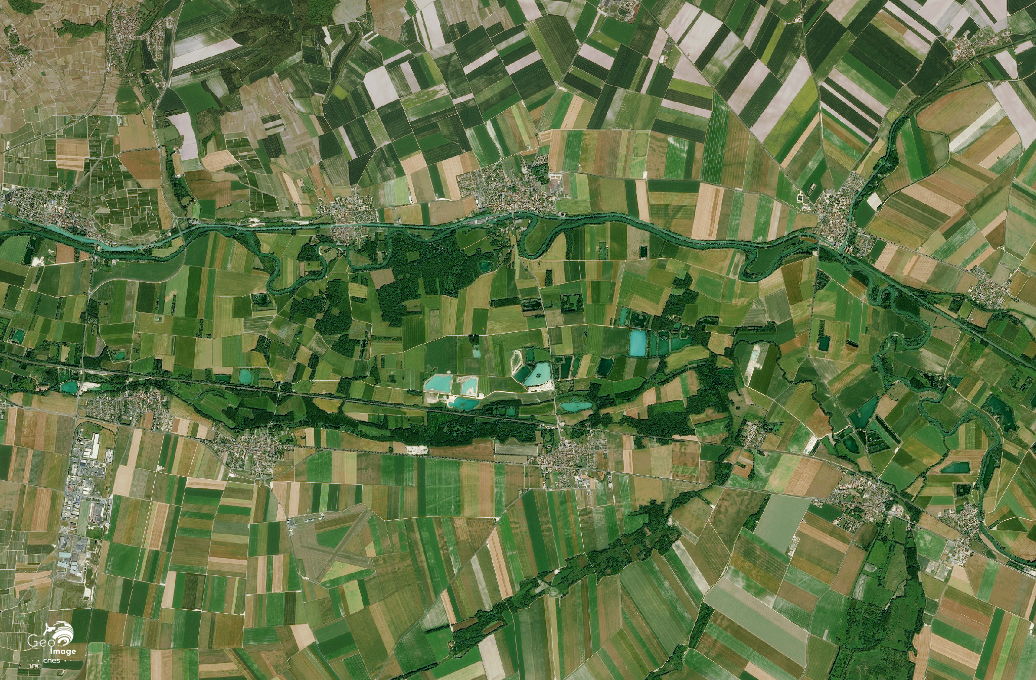 Cette bande centrale est une zone humide. Les parcelles boisées (peupleraies) sont bien visibles. Le bleu émeraude des étangs révèle une nappe hydrographique quasiment affleurante. On y extrait de la grève, des granulats utilisés notamment pour la fabrication du béton. On y pratiquait autrefois l’élevage ; aujourd’hui, la grande culture — notamment le maïs — s’est imposée malgré le risque d’inondation.