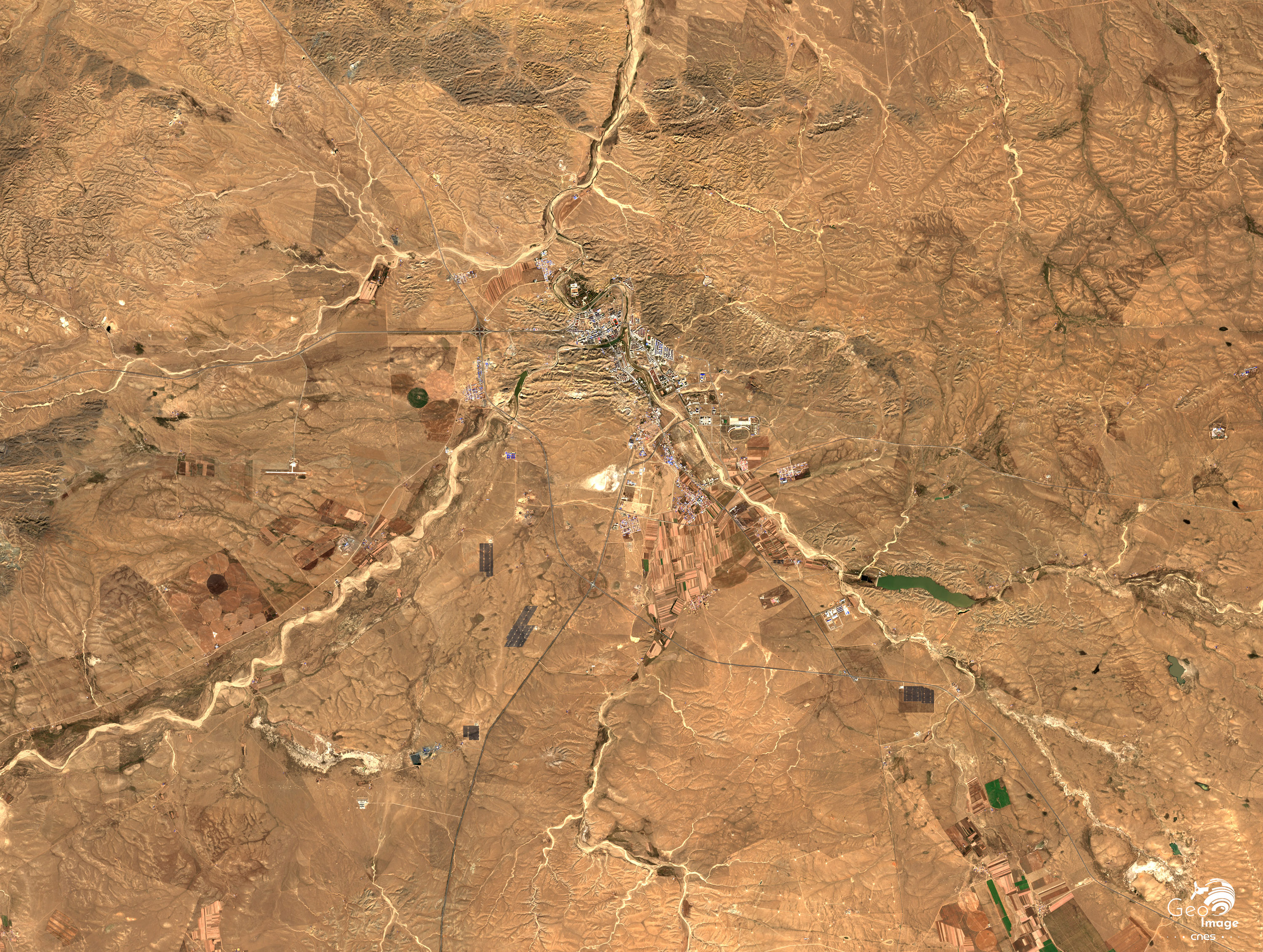 Ces images permettent de réinscrire la ville minière de Byan Obo dans son cadre régional. Relativement plans, penchés vers le nord et culminant à 1.400 m., ces hauts plateaux se caractérisent par leur aridité, leur basse température (moyenne annuelle : 4,23°C) et la faiblesse de leur couvert végétal. Les précipitations sont rares (253 mm/an), concentrées à 60 % sur juillet/aout. Les quelques rivières sont à écoulement intermittent et largement asséchées sur l’image. Ce comté connait en effet des hivers très froids (janvier : -14,5°C) et secs, des étés chauds (juillet : 21,1°C) et des vents forts, surtout au printemps.