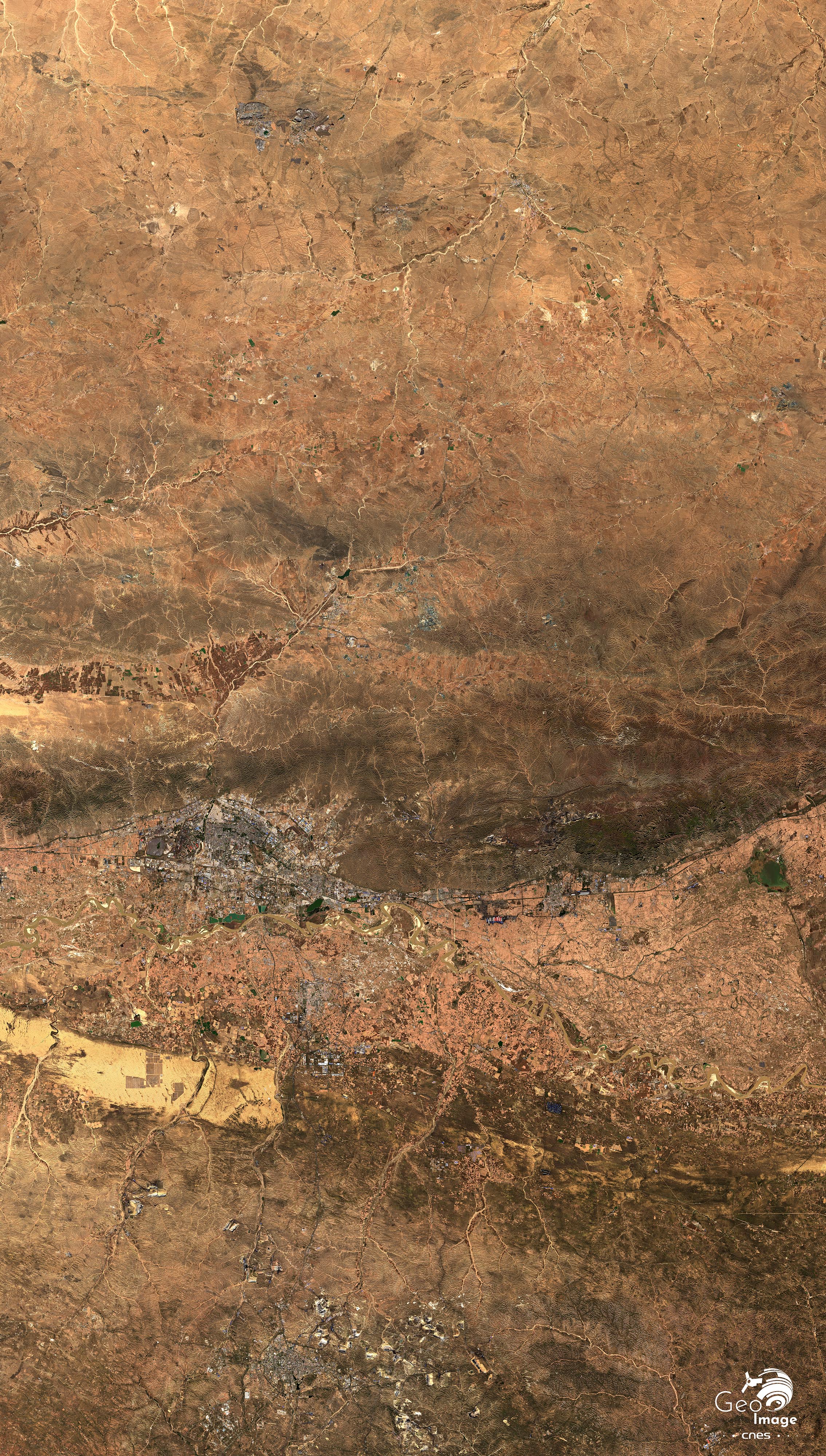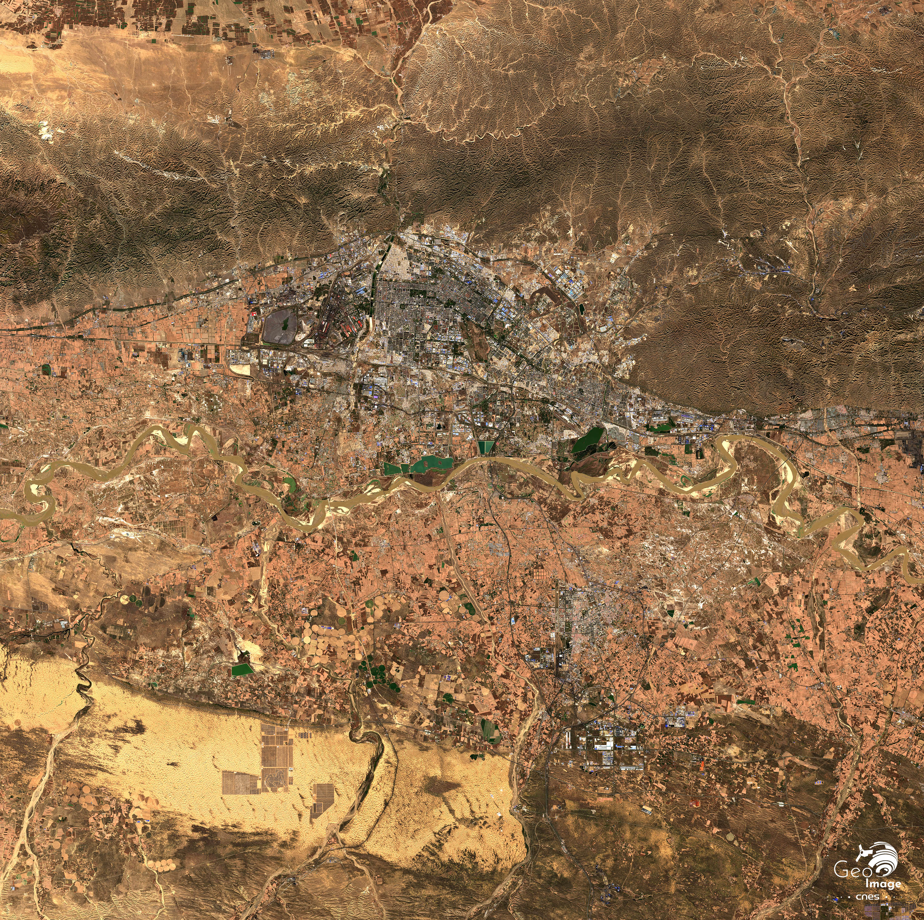 Comme le montre bien l’image, cet espace aride alternent déserts rocheux et sableux, telle la bande au sud-ouest de l’image, auréole de steppes semi-désertiques et dépressions éoliennes salines. Comme pour le Nil qui traverse le Sahara, le Fleuve jaune – ou Huang He - doit son écoulement pérenne aux volumes d’eau accumulés à sa source à 4.800 m. dans la Cordillère du Bayan Har des plateaux tibétains. Mais avant d’atteindre la Grande plaine plus à l’est,  il perd une partie considérable de son débit en traversant cette grande zone aride ; des pertes largement amplifiées aujourd’hui par une surexploitation de plus en plus inquiétantes de ses ressources.