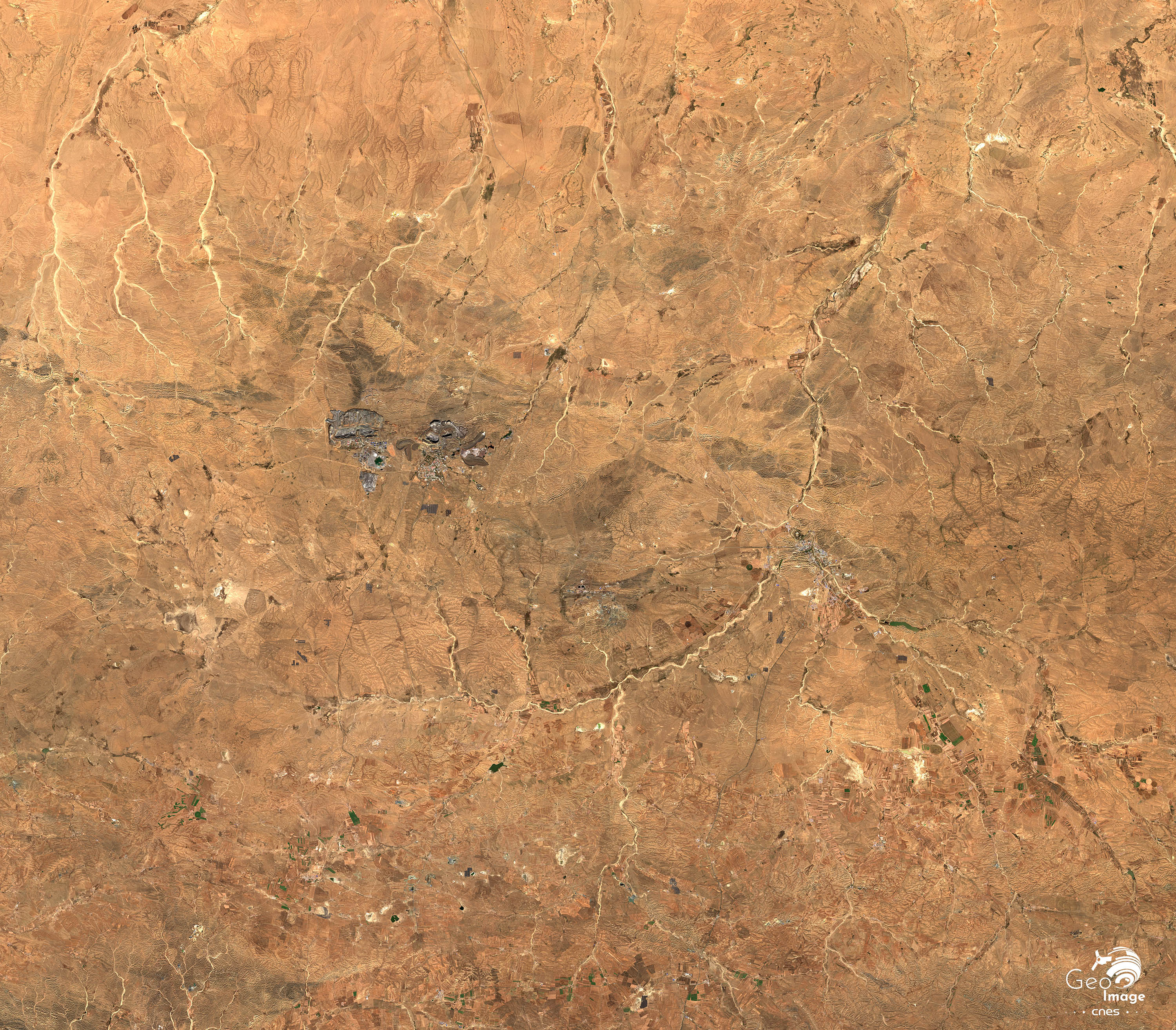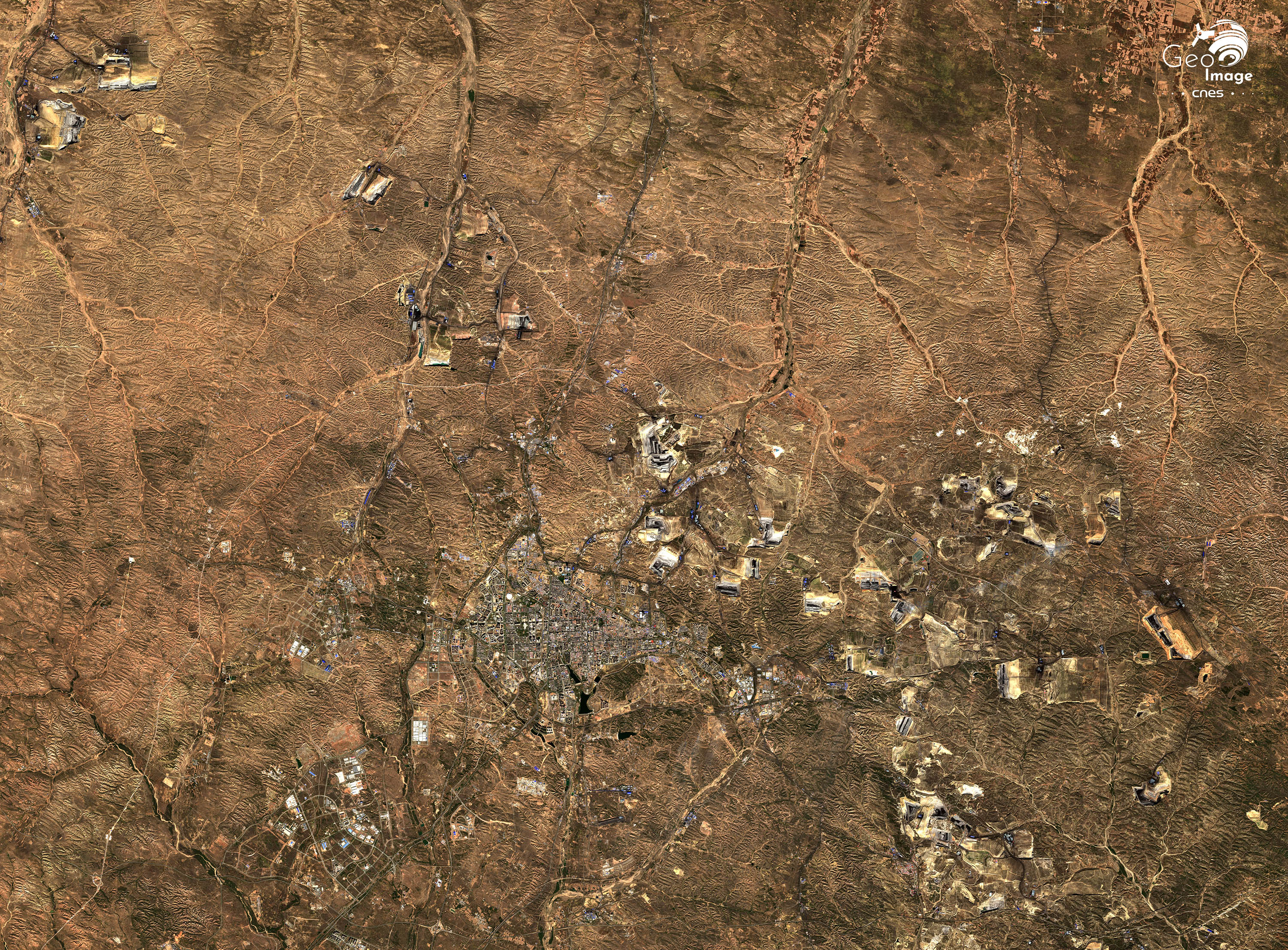 Avec cette image, nous nous trouvons en rive droite du Fleuve jaune, qui dessine une grande boucle autour de l’immense plateau de l’Ordos. Situé à 1.300 m. d’altitude, le district de Dongsheng est peuplé de 575 000 habitants. L’agglomération de Dongsheng est au cœur d’un vaste bassin minier charbonnier. L’image témoigne de la présence de dizaines de mines à ciel ouvert, plus ou moins étendues et qui valorisent des veines peu profondes dans le cadre d’un grand boom charbonnier qui se déploie dans la région depuis les années 1990.