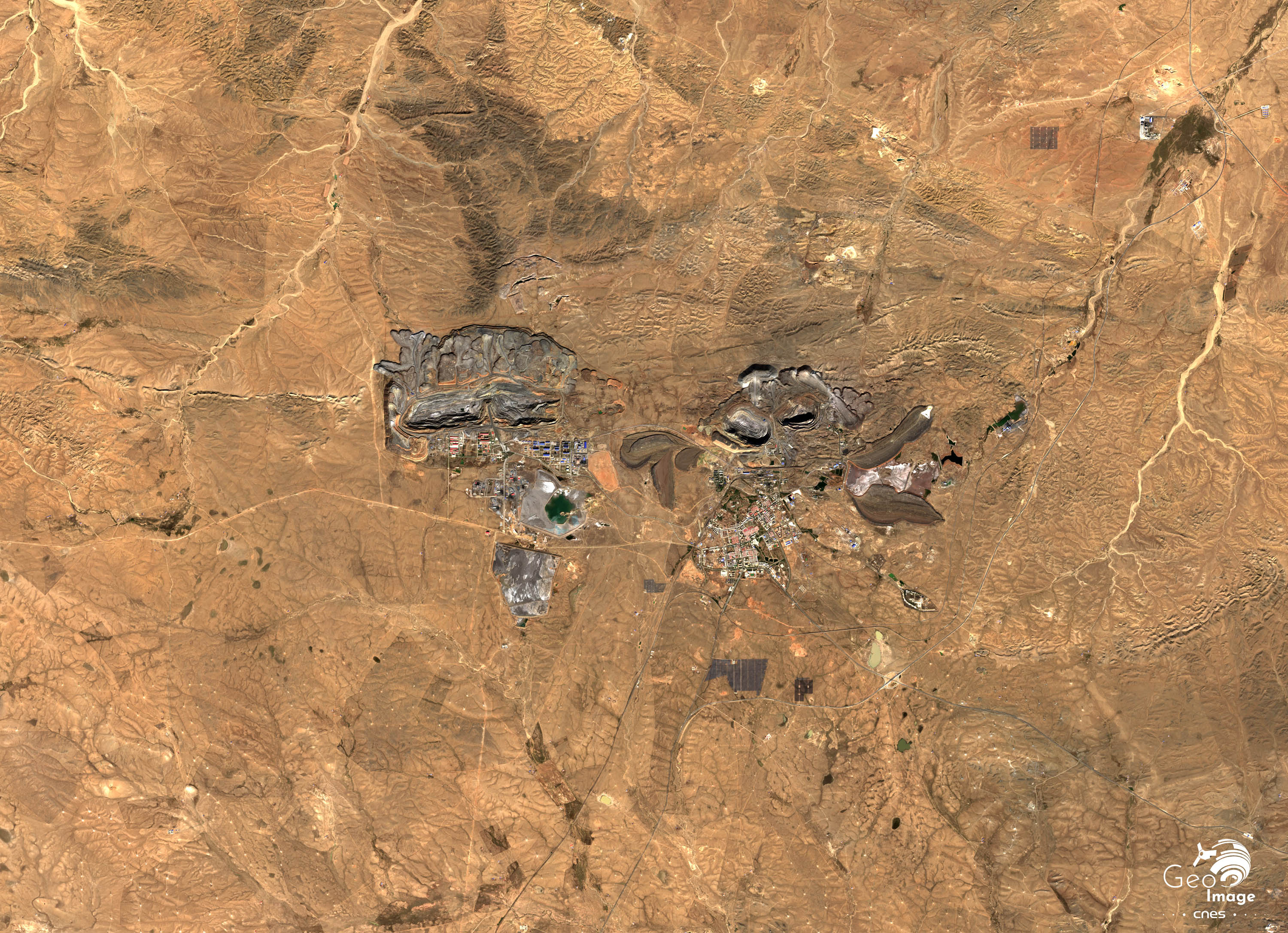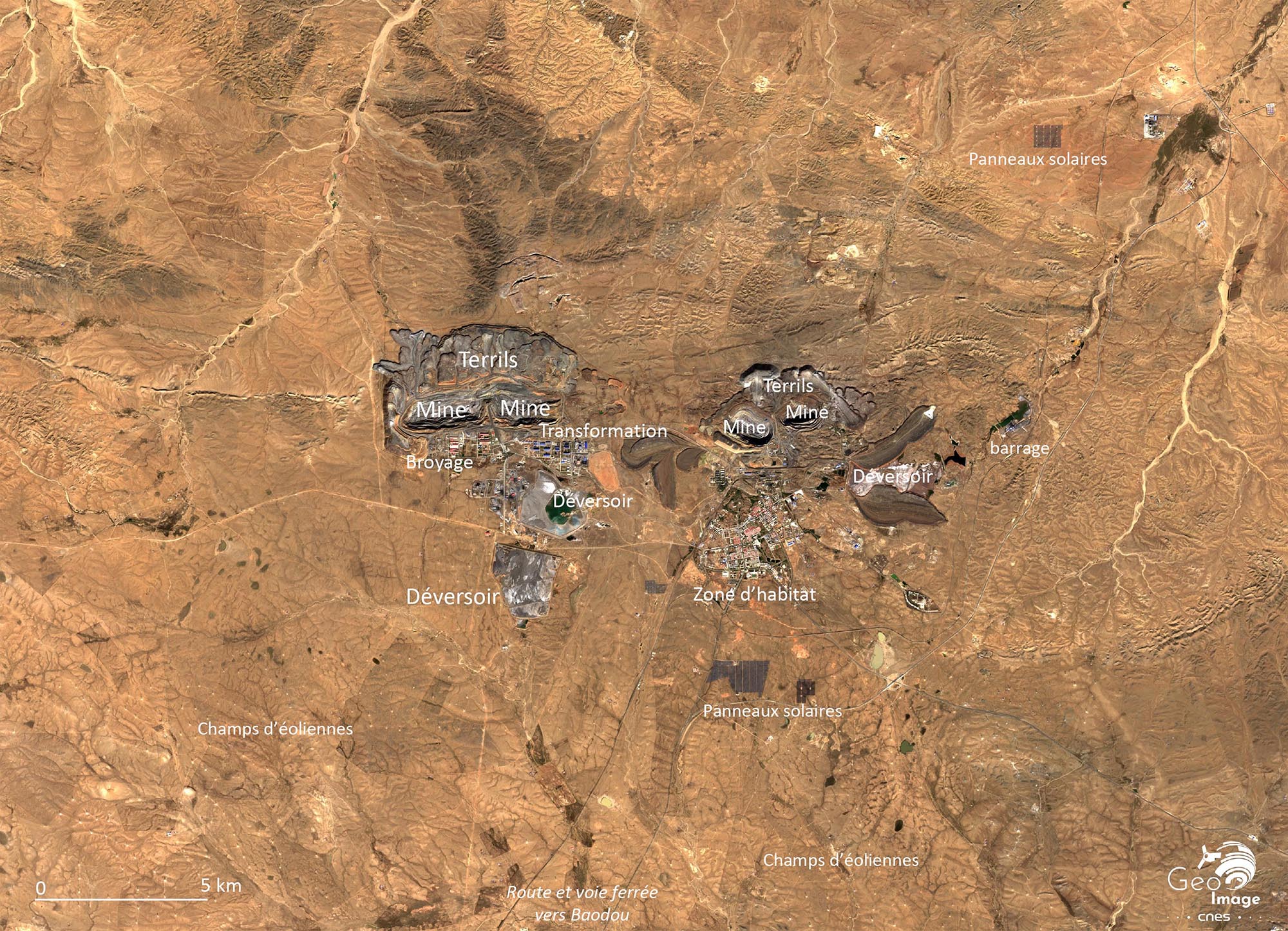 Les quatre grands gisements à ciel ouvert sont bien repérables par leur forme, leur profondeur et leur ampleur. Environ 15 000 tonnes de roches sont extraites par jour, dont il faut ensuite extraire les minerais et les terres rares à l’aide entre autres de bains d’acides dans des usines de transformation. Dans la mine de l’ouest, la séparation technique des différentes phases est bien visible de l’espace : mines à ciel ouvert de plus en plus larges et profondes, unité de concassage et de broyage en rouge à gauche, unité de transformation et d’extraction des minerais et terres rares en bleu, deux lacs de déversoirs particulièrement pollués au sud.