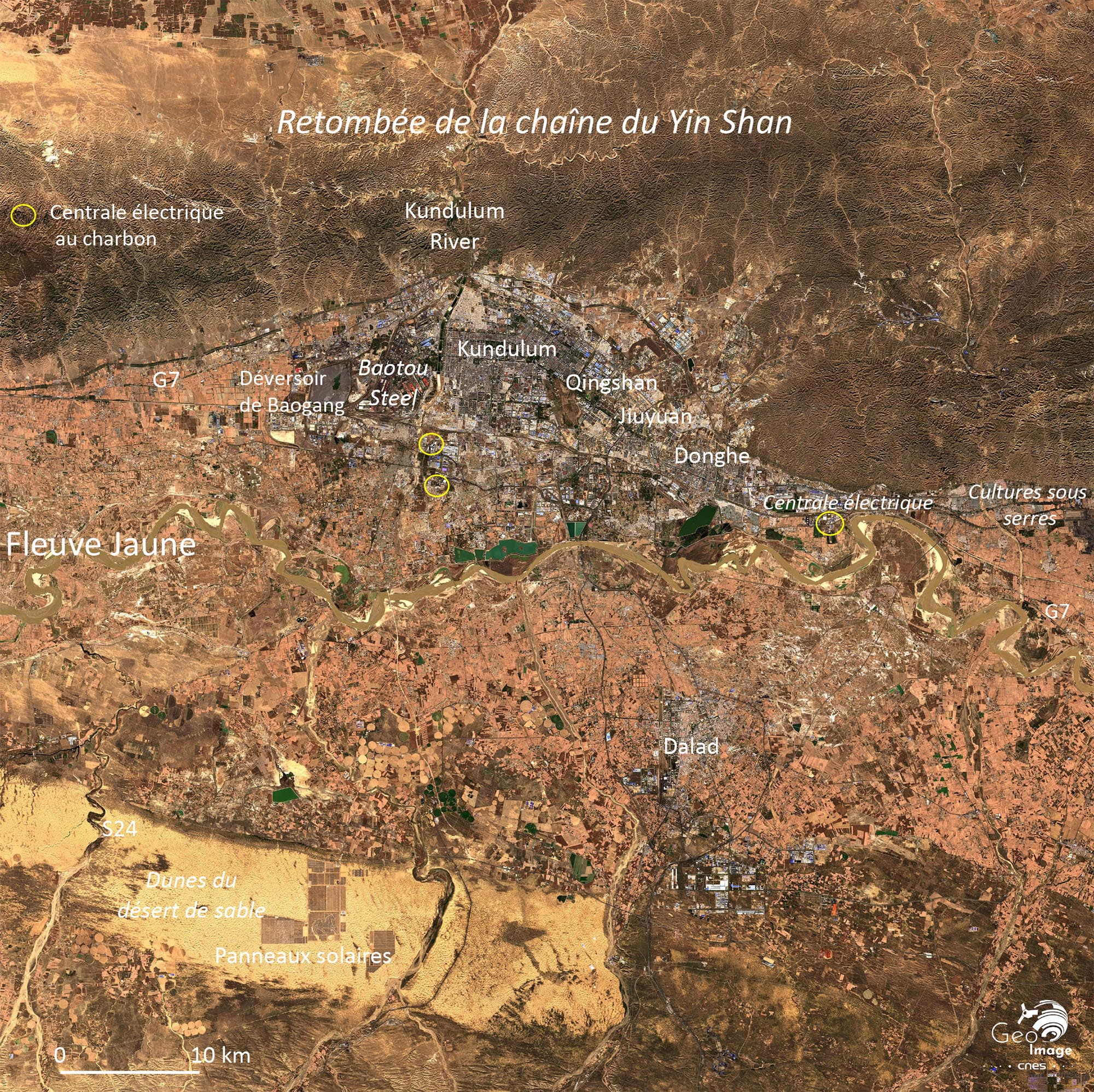 Au centre enfin, l’image est traversée d’ouest en est par une vaste gouttière topographique. Celle-ci est empruntée par le puissant Fleuve jaune. Faisant figure d’oasis dans un espace régional particulièrement aride, elle est dominée par la ville de Baotou, qui est la 2em ville de Mongolie intérieure.