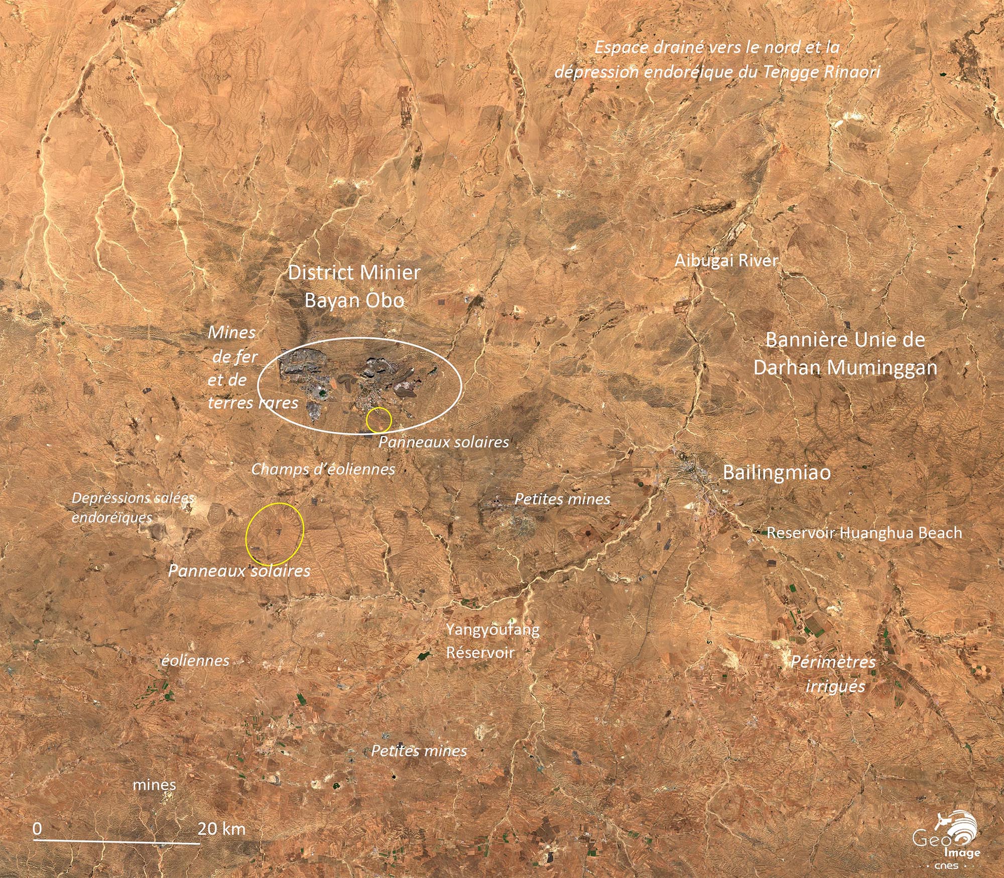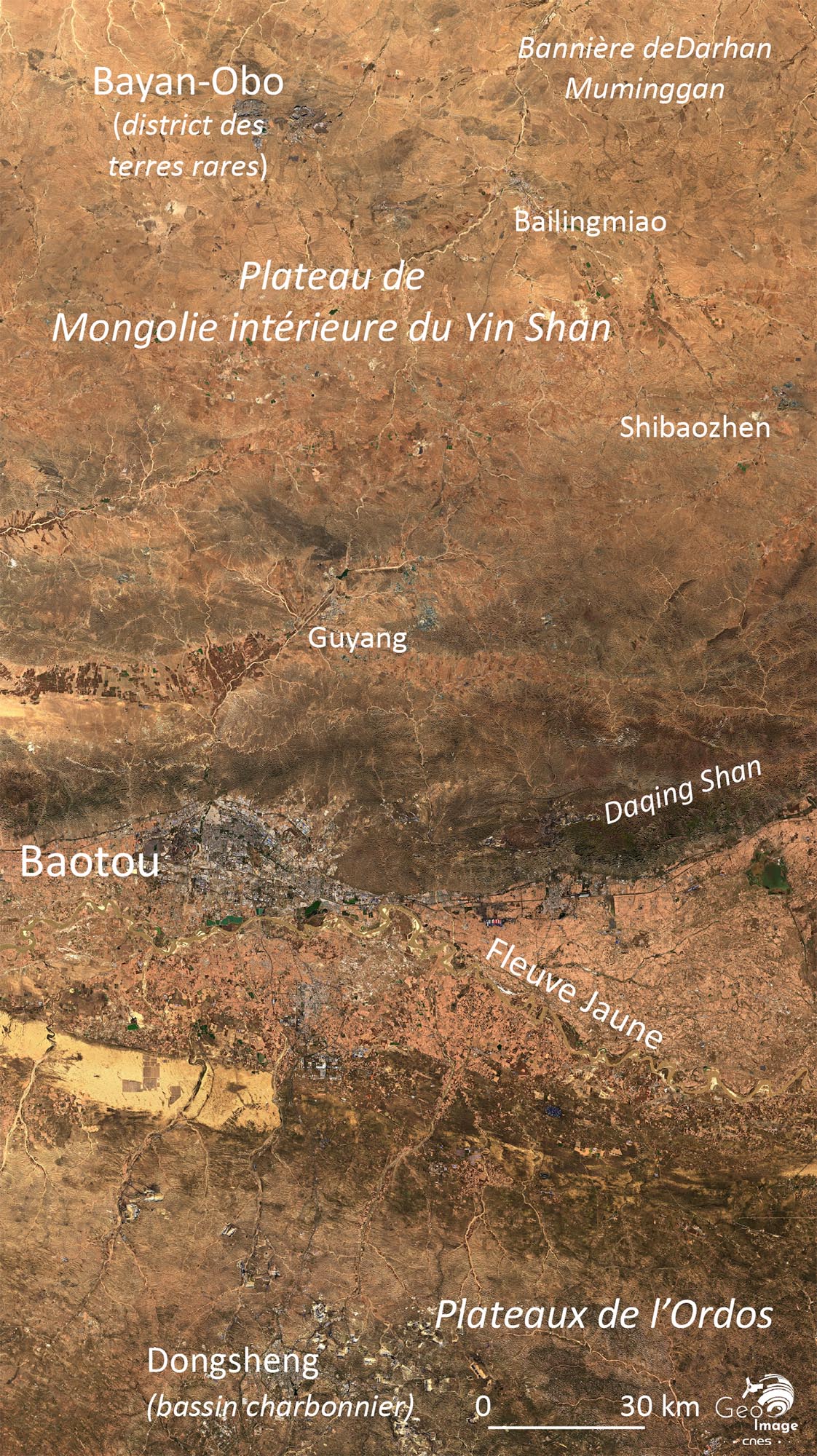 Au plan administratif et géopolitique, nous sommes dans la Région autonome chinoise de Mongolie intérieure, dont la capitale Hothhot se trouve à quelques kilomètres à l’est (hors image). Cette Région couvre 1,1 million de km2 et est peuplée de 24 millions d’habitant (20 hab./km2), dont officiellement 80 % de Hans et 17 % de Mongols. Si comme partout en Chine, le territoire est découpé en préfectures et districts, le terme de « bannière » ou « bannière autonome » y est souvent utilisé comme pour la Bannière de Darhan Muminggan qui entoure le district des terres rares de Bayan Obo.