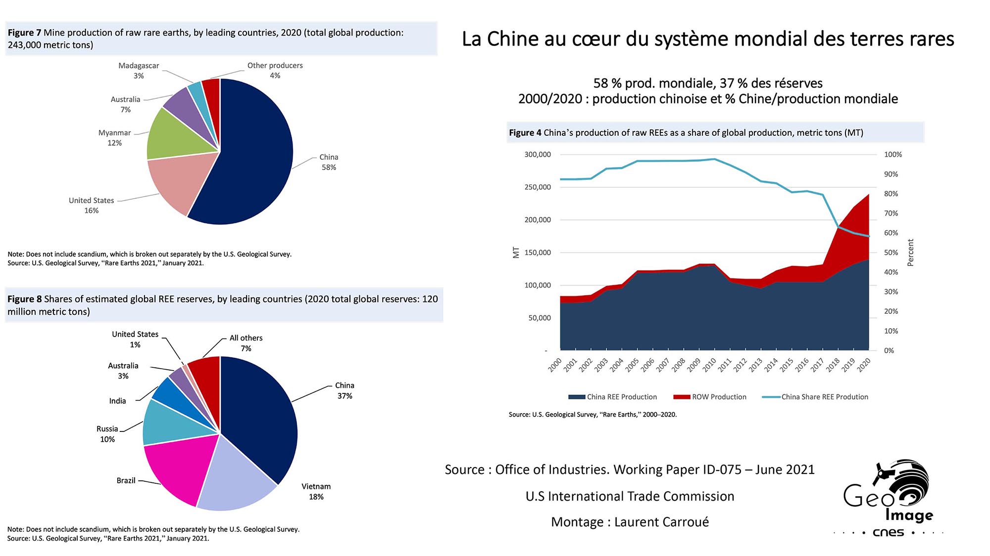 C’est pourquoi en 2020 la Chine est retombée à 58 % de la production mondiale. Ces volumes demeurent malgré tout absolument considérables (environ 140.000 tonnes), face aux Etats-Unis (15,6 %), à la Birmanie (12,3 %) et à l’Australie (7 %). Les estimations de l’USITC soulignent de même le poids majeur de la Chine dans les réserves mondiales (37 %), largement devant le Vietnam, le Brésil ou la Russie.