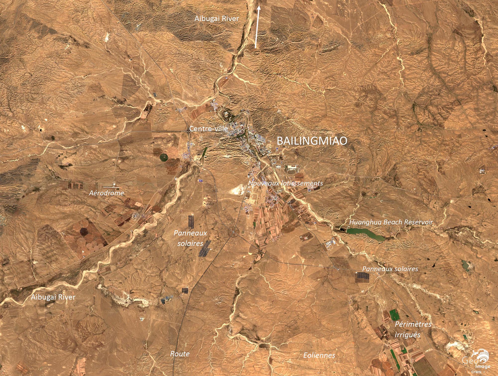 Nous sommes au nord de la Chine, dans la Région autonome de Mongolie intérieure. L’image couvre un espace géographique organisé en trois bandes parallèles.