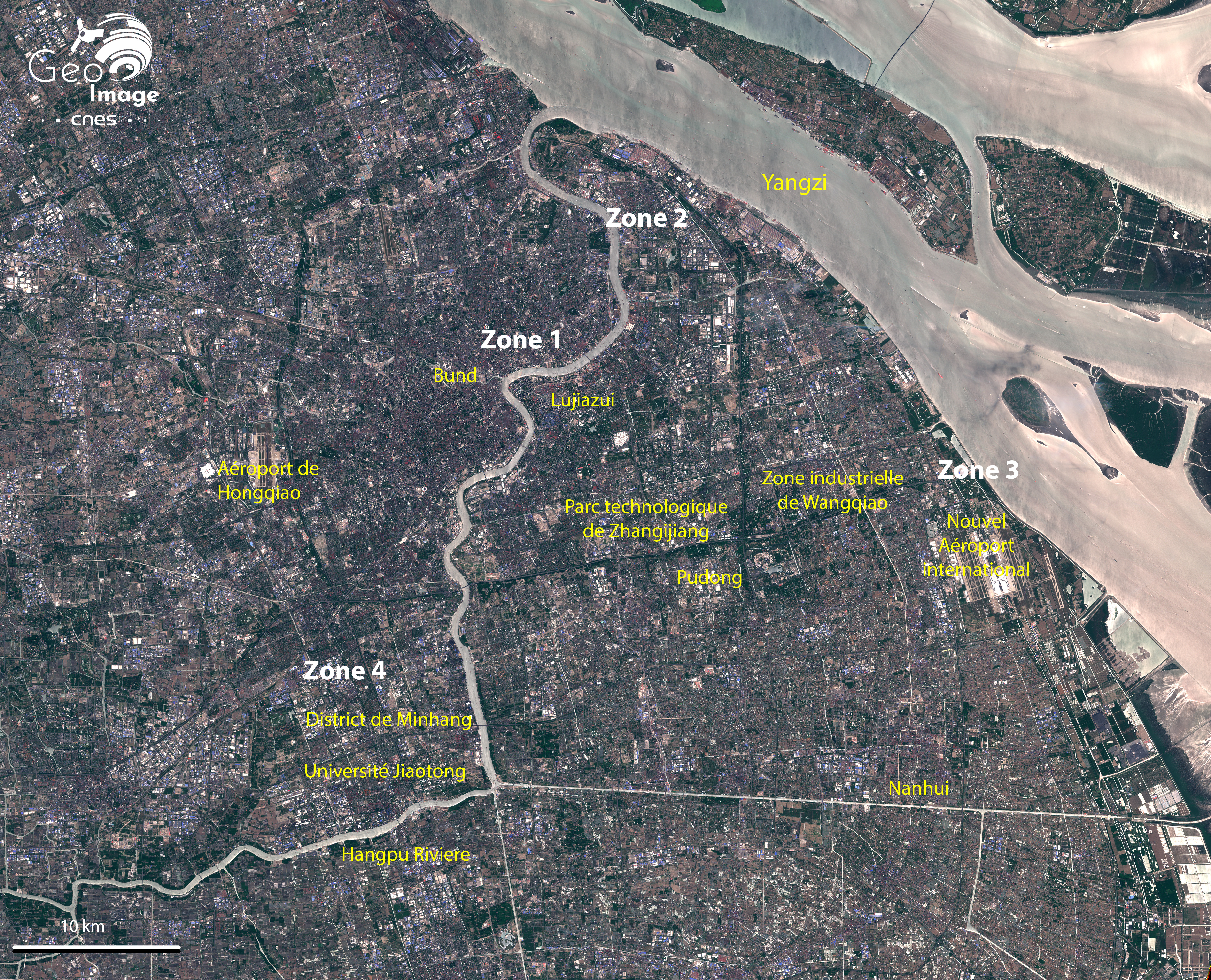 L’image représente la ville-centre historique de l’immense mégapole de Shanghai, marquée par une densité pouvant atteindre près de 24 000 habitants/km2 de part et d'autre du Huangpu, ainsi que ses proches périphéries en pleine refonte urbaine et architecturale : nouveau quartier de l’aéroport international, nouveau port et villes nouvelles, comme Minhang.