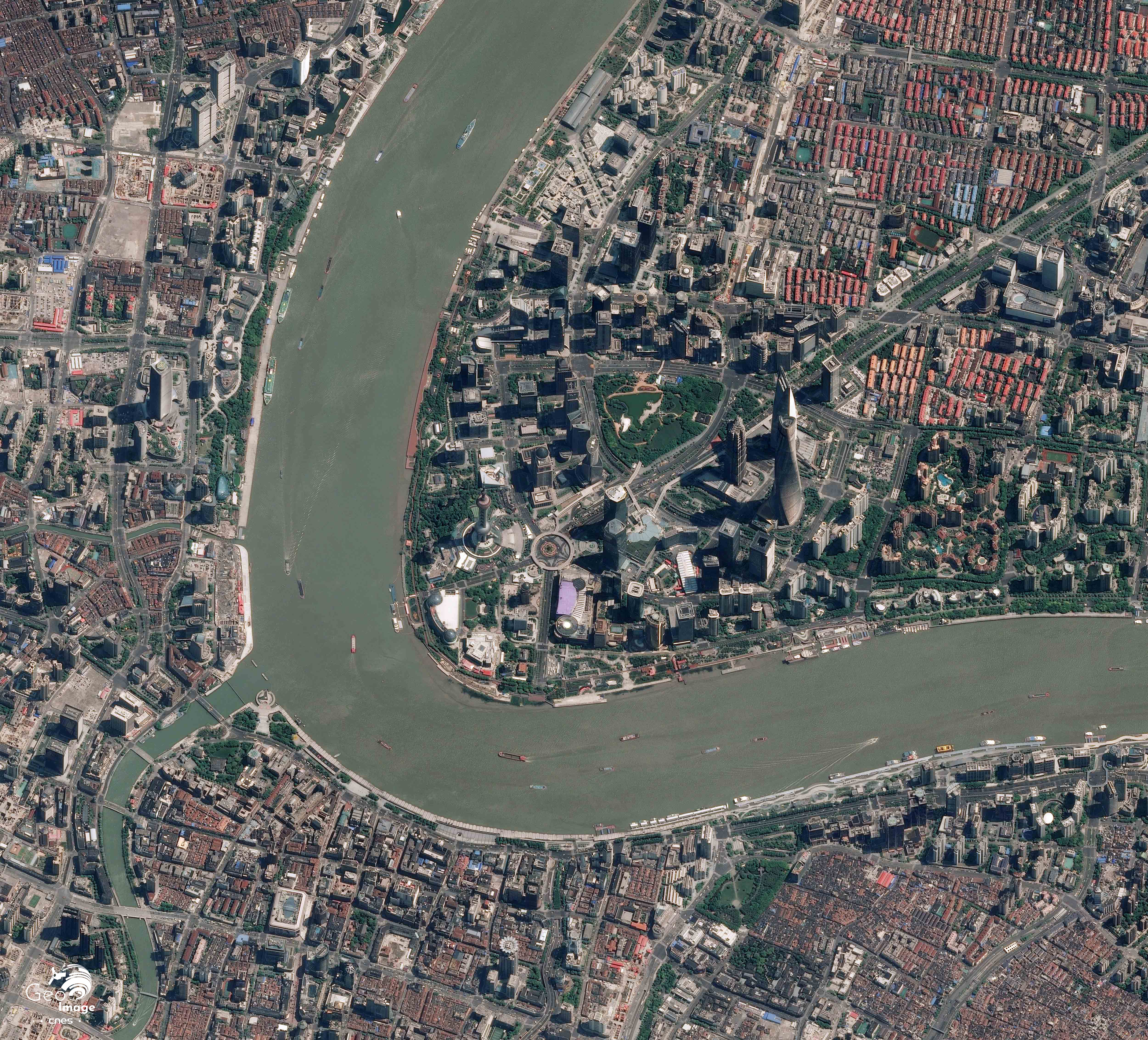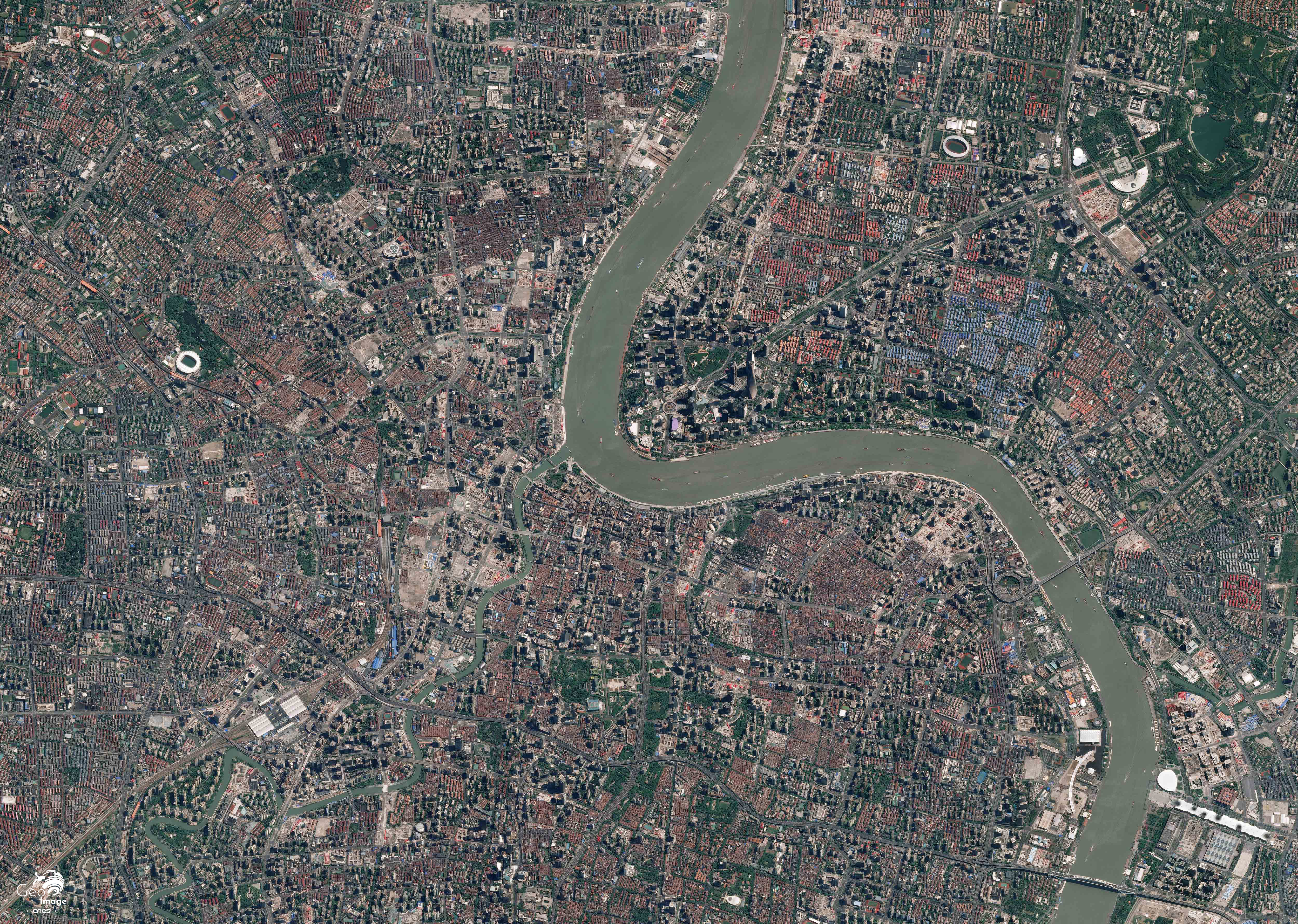 Dans la courbe du Bund, la Suzhou vient se jeter dans le fleuve Huangpu comme affluent de rive gauche, tandis que les voies ferrées et la gare sont elles aussi bien visibles. Cet espace constitue un front urbain très actif qui témoigne des profondes recompositions de la métropole. Les anciens quartiers populaires d’habitat collectif bas organisés autour de ruelles – localement appelées les lilong – sont bien identifiables par leur couleur brique. Ils sont progressivement rasés et remplacés. L’intérêt de l’image est de témoigner des processus de mutation grâce à la juxtaposition, sur un espace restreint, des différents stades d’évolution.