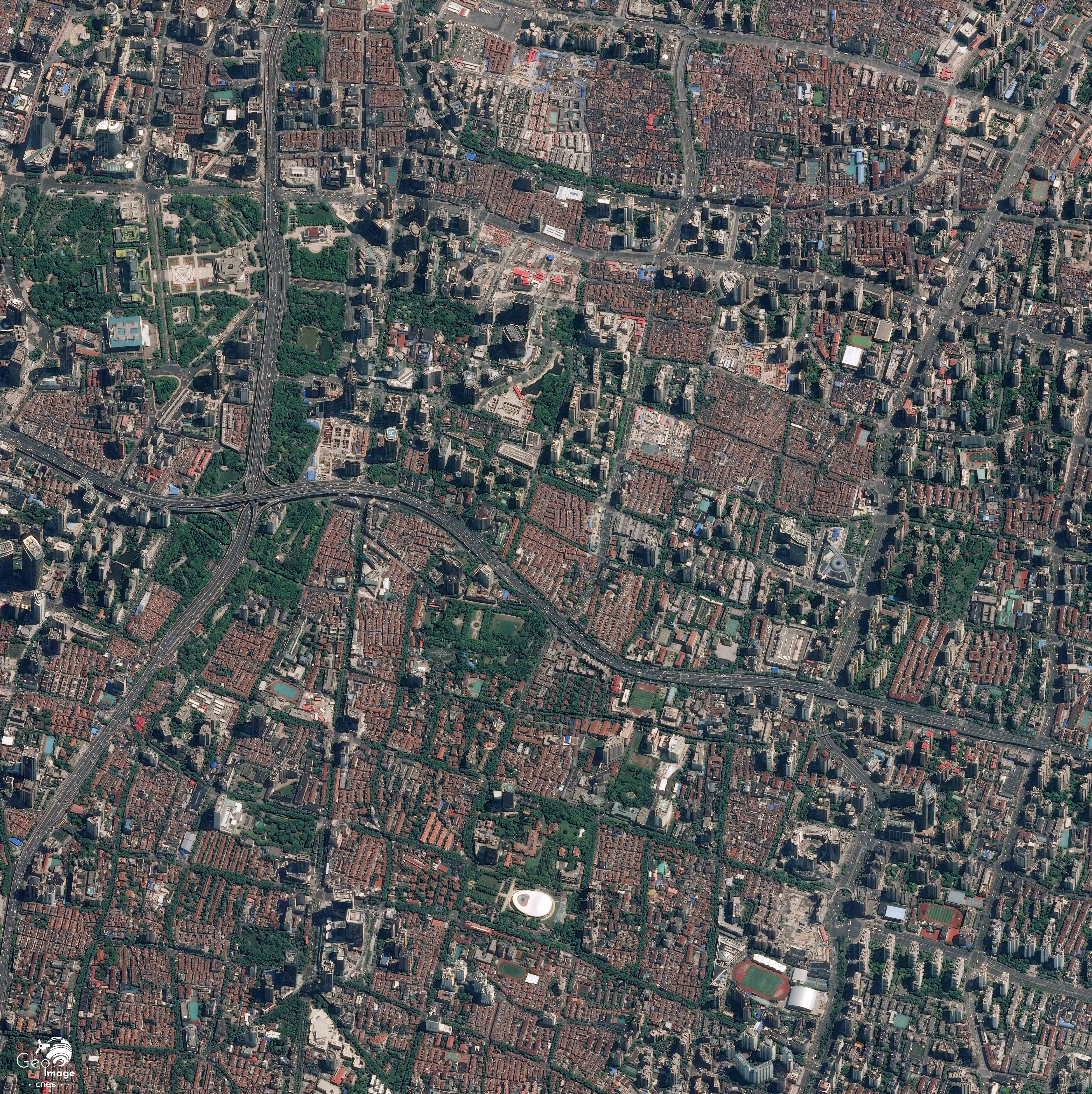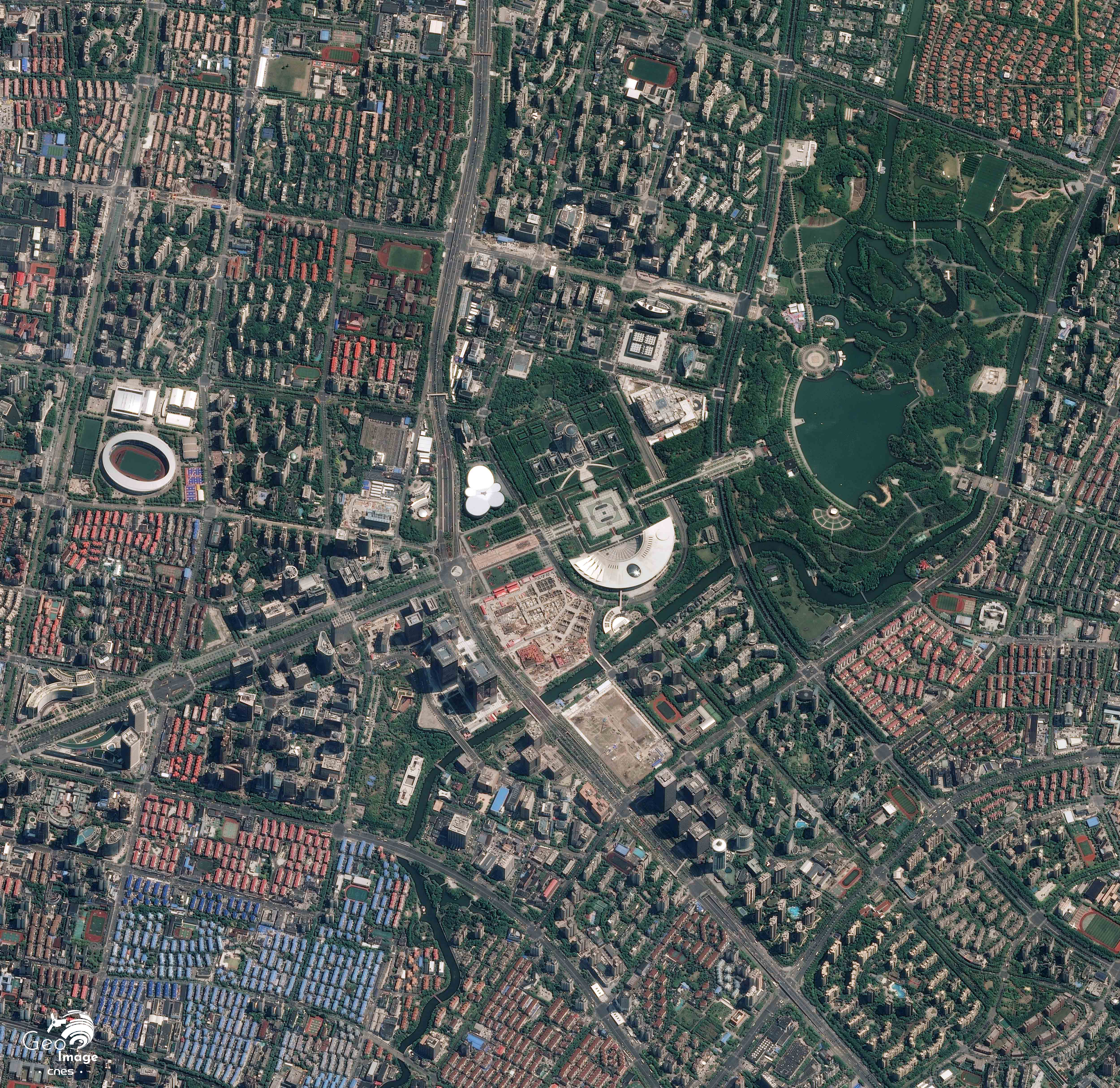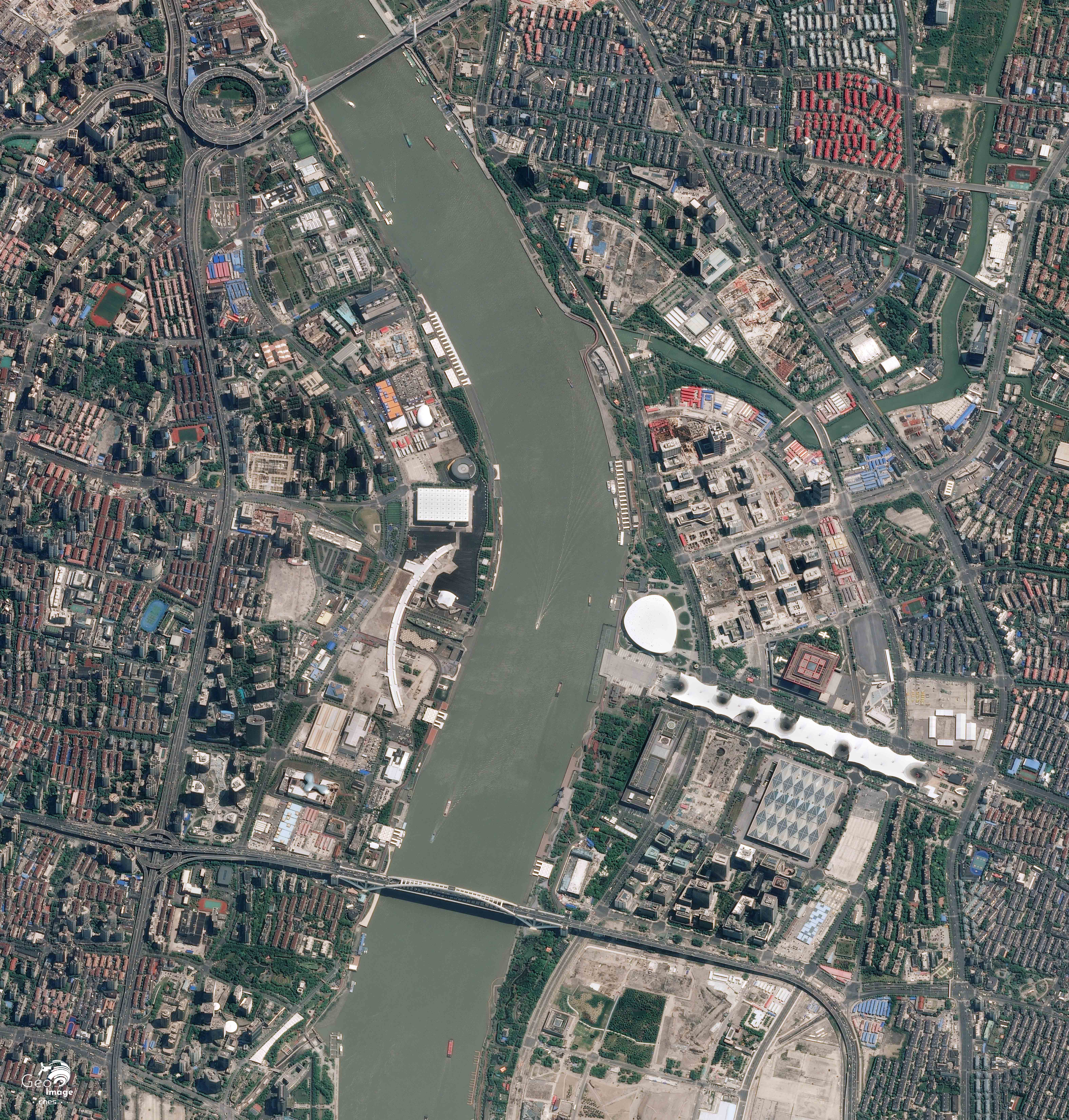 Nous sommes ici sur le fleuve Huangpu avec l’extrémité de la nouvelle zone de Pudong en rive droite et le quartier de Jing’an en rive gauche, lui-même traversé par le périphérique intérieur. Le pont Lupu, en forme d’arc, est bien visible en bas de l’image, et le pont Nanpu en haut. Nous sommes ici sur l’espace occupé par l’Exposition universelle de 2010, qui servit de vitrine internationale à la ville et au pays. De cette opération de prestige demeurent encore quelques bâtiments emblématiques.