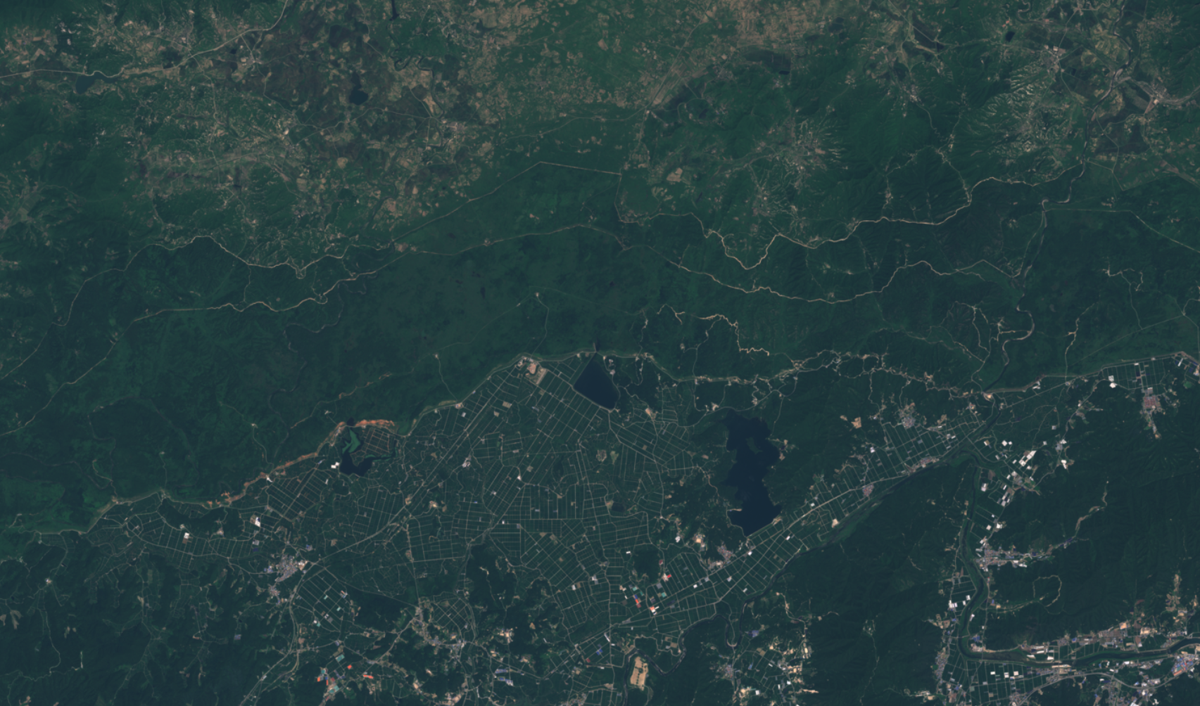 L’image couvre ici le centre géographique de la péninsule coréenne, qui est située en Asie orientale au contact entre la Chine au nord-ouest, la Russie au nord-est et le Japon au sud-est. Nous sommes ici dans un espace naturel relativement homogène composé de plateaux et de moyennes montagnes aux altitudes maximales variant de 1 109 à 1 250 m. Ils sont entrecoupés de vallées et de bassins intramontagnards relativement étroits, donnant à la topographie une structure assez confuse.