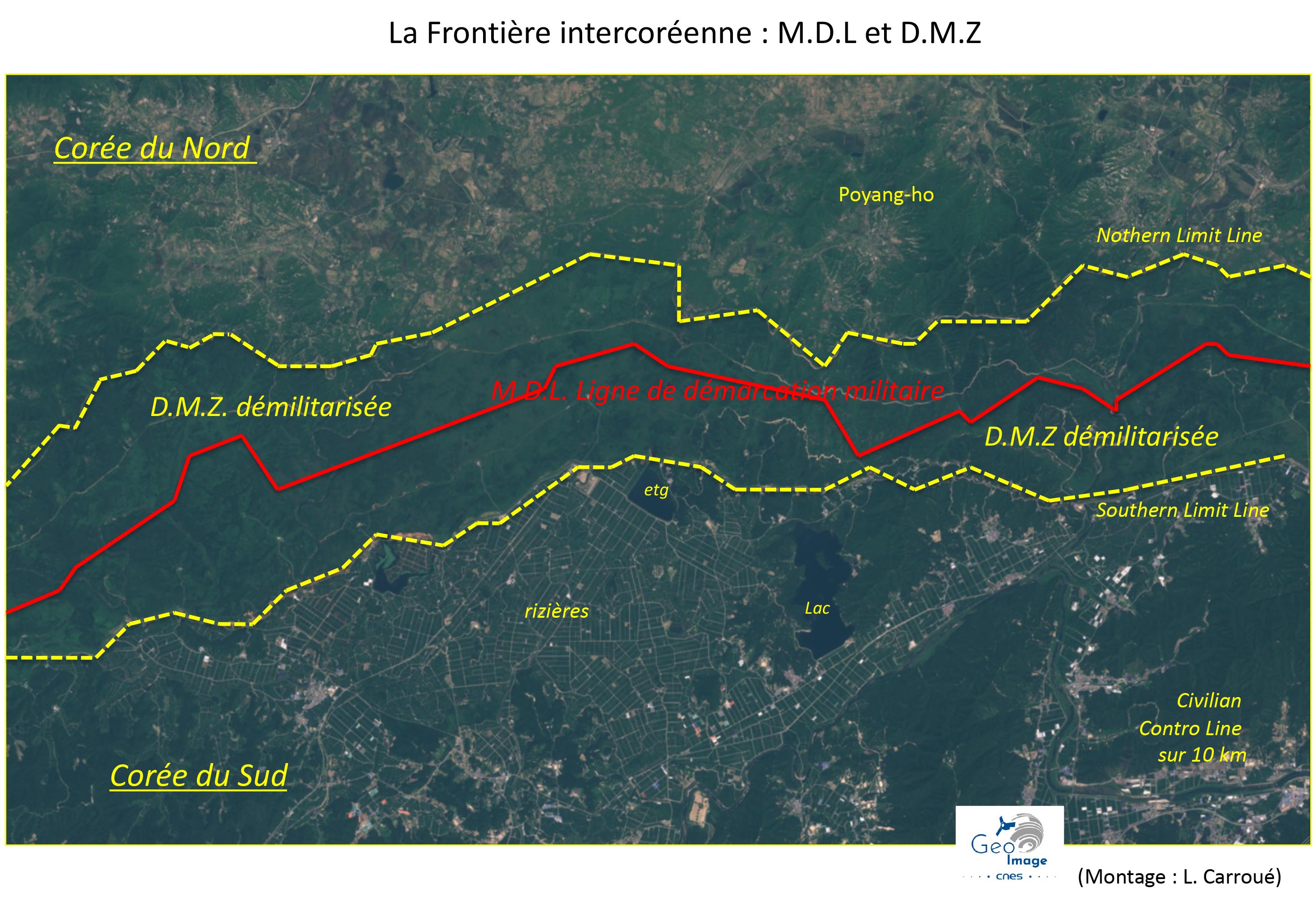 Longue de 248 km et suivant approximativement le 38ᵉ parallèle, la frontière entre la Corée du Nord et la Corée du Sud est l’une des plus fermées et militarisées au monde. Fruit de la guerre froide et de la guerre de Corée, elle demeure encore aujourd’hui un abcès de fixation des tensions régionales, continentales et mondiales. Ce système frontalier est organisé autour de quatre composantes spatiales emboîtées les unes dans les autres : au cœur, la ligne de démarcation militaire (Military Demarcation Line, MDL), qui sert de facto de limite frontalière entre les deux Corées ; la zone démilitarisée (Demilitarized Zone, DMZ), d’une dizaine de kilomètres de large ; les deux zones de front où sont installés les systèmes défensifs ; et enfin, la Civilian Control Line (CCL), qui se déploie sur une profondeur variant de 5 à 20 kilomètres vers l'arrière. Au total, il s'agit d'un système et de dispositifs en tout point exceptionnels, reflétant une situation géopolitique et géostratégique elle-même exceptionnelle.