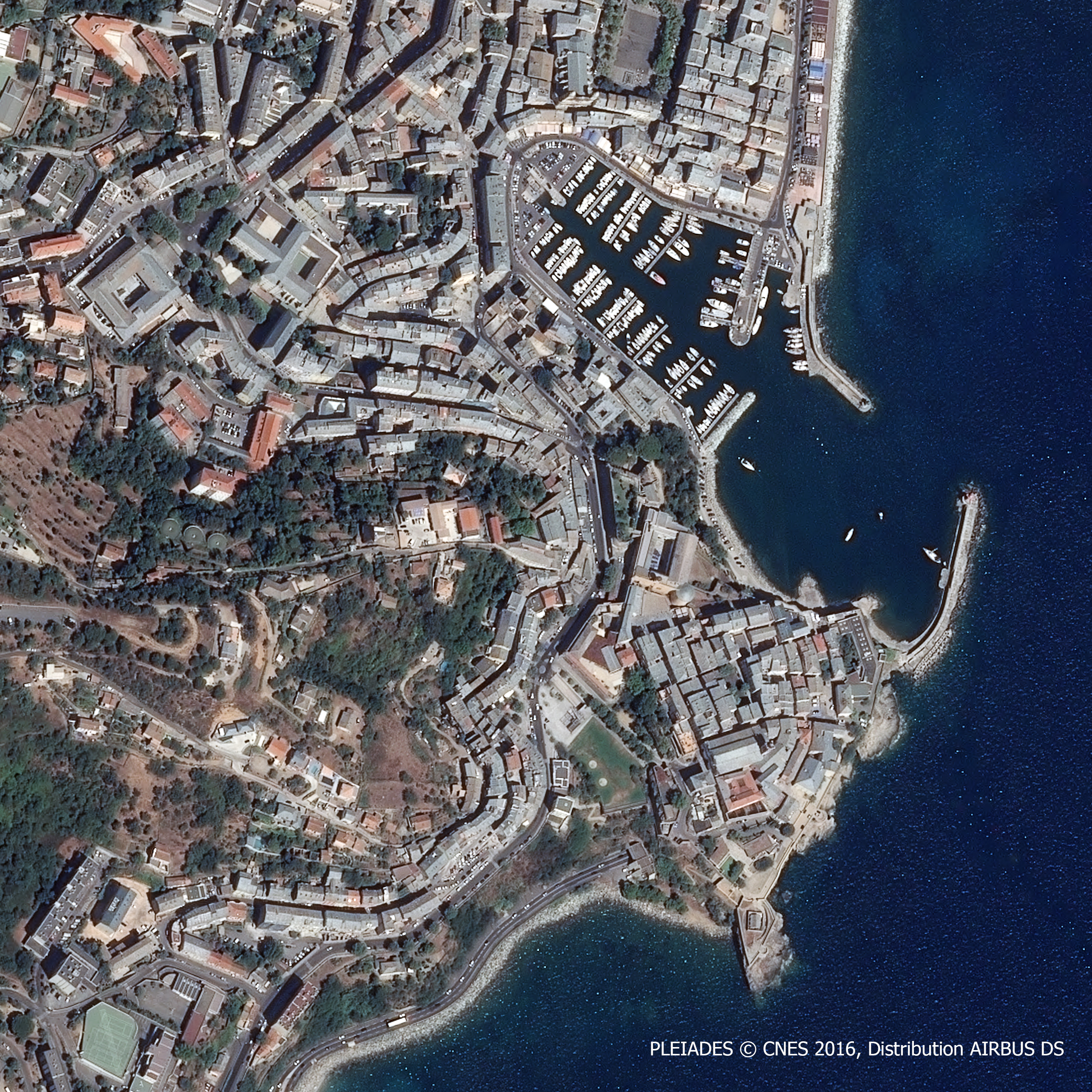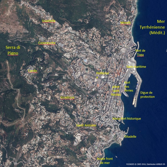 Cette image montre le cœur historique de la ville de Bastia. On y distingue au nord le Vieux-Port, site premier de l’implantation humaine sous la forme de cabanes de pêcheurs. Appelé initialement Porto Cardo, il a été renommé Terra Vecchia par les Génois, par opposition au nouveau quartier fortifié qu’ils ont construit en aplomb, Terra Nova.