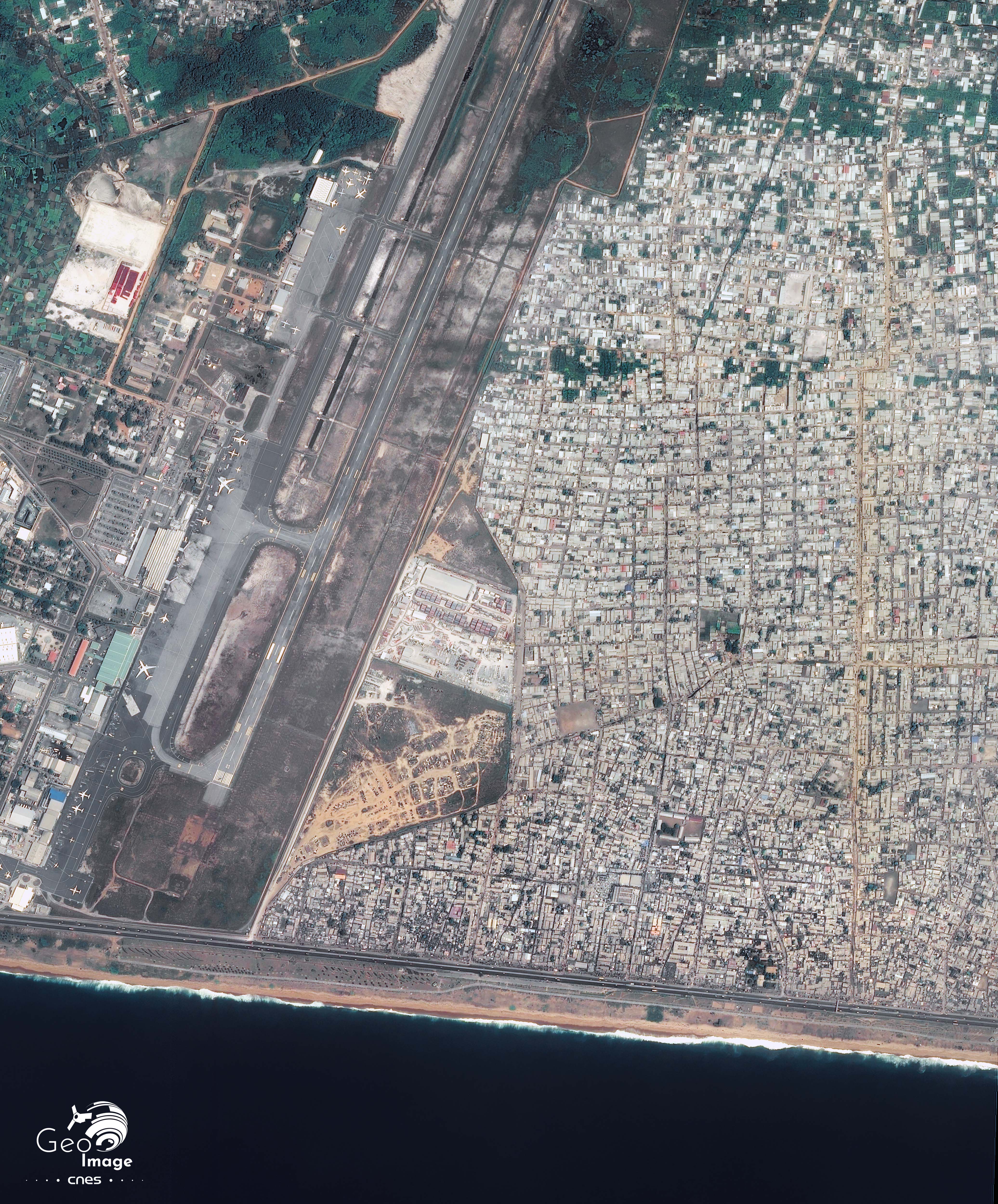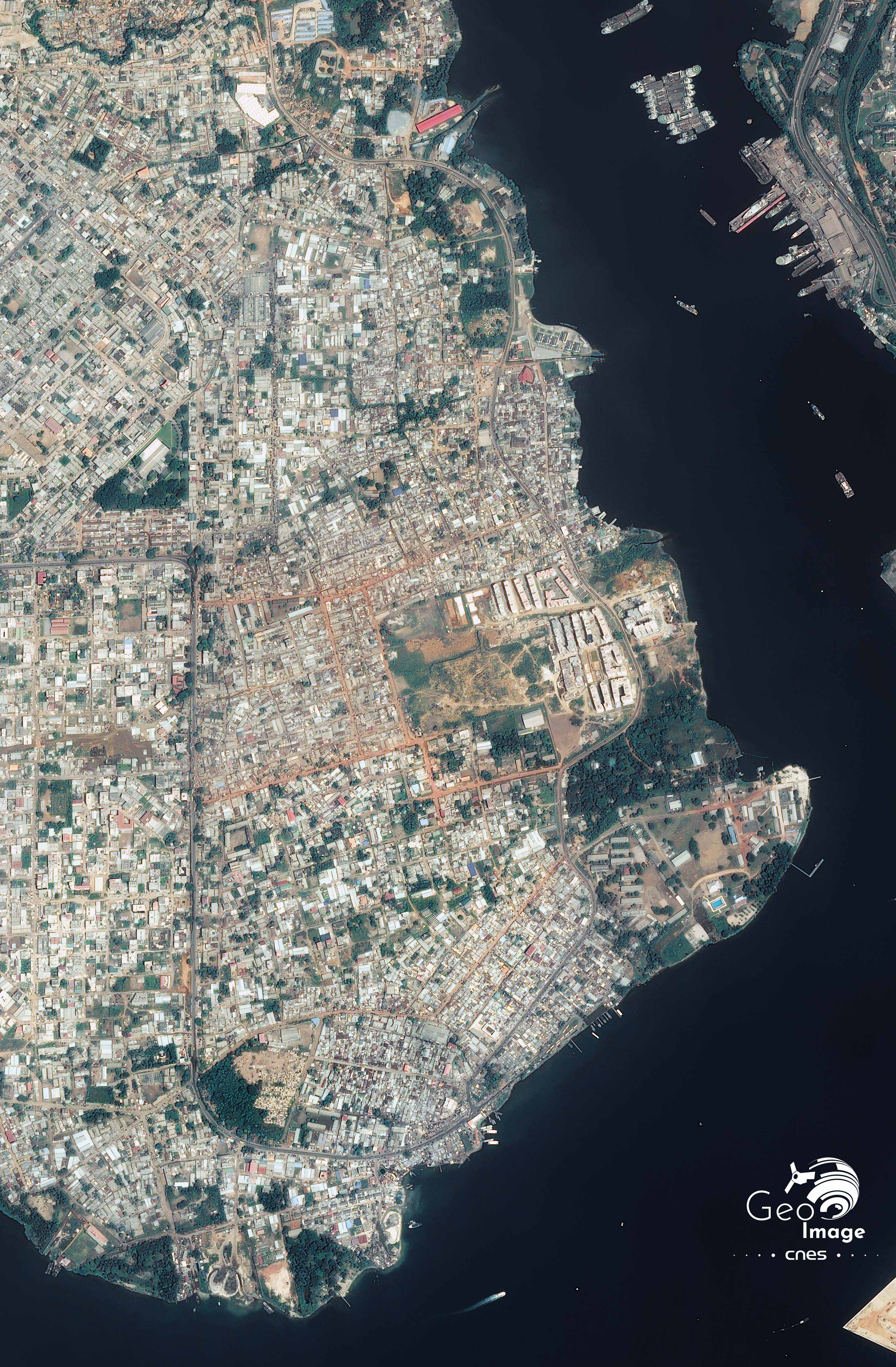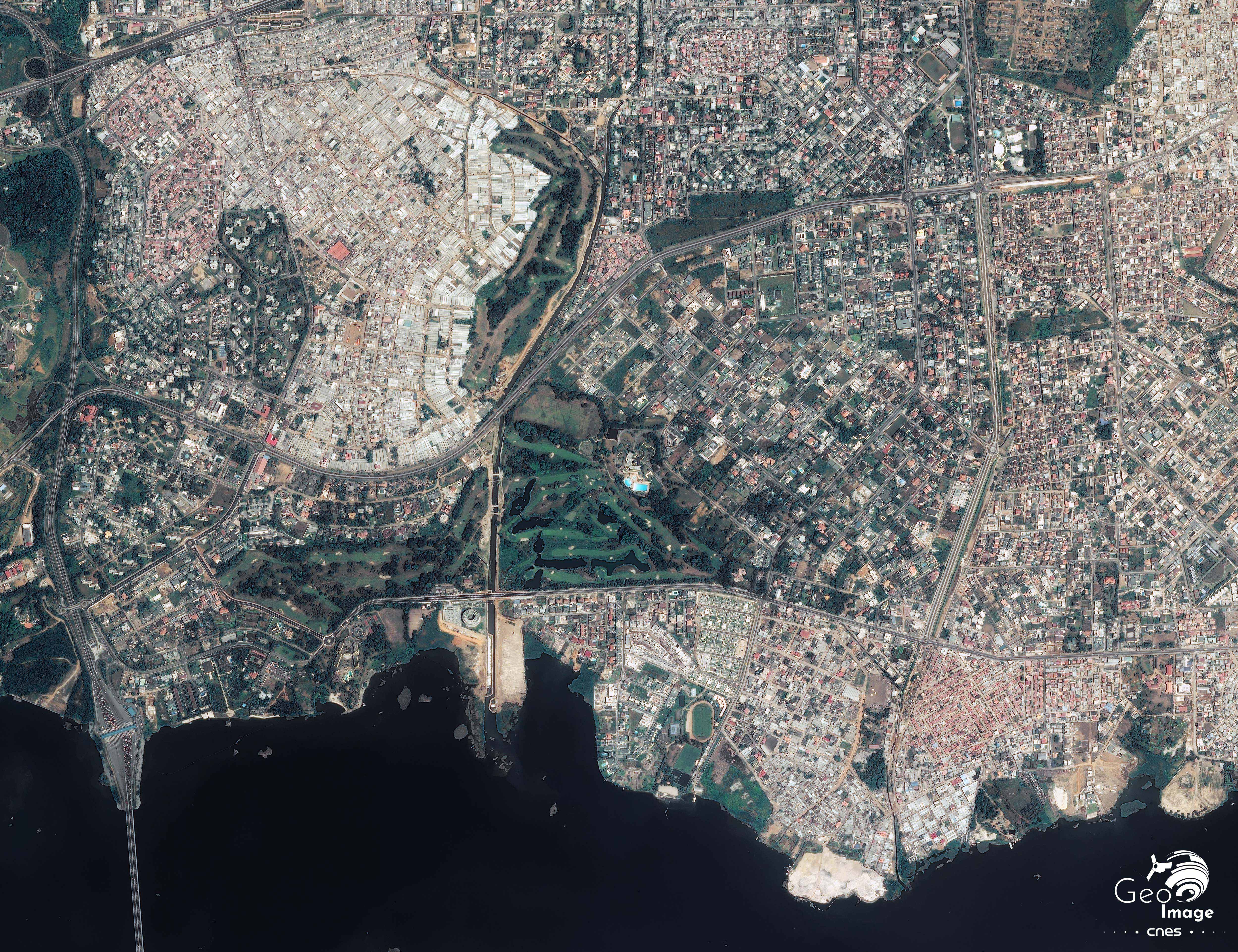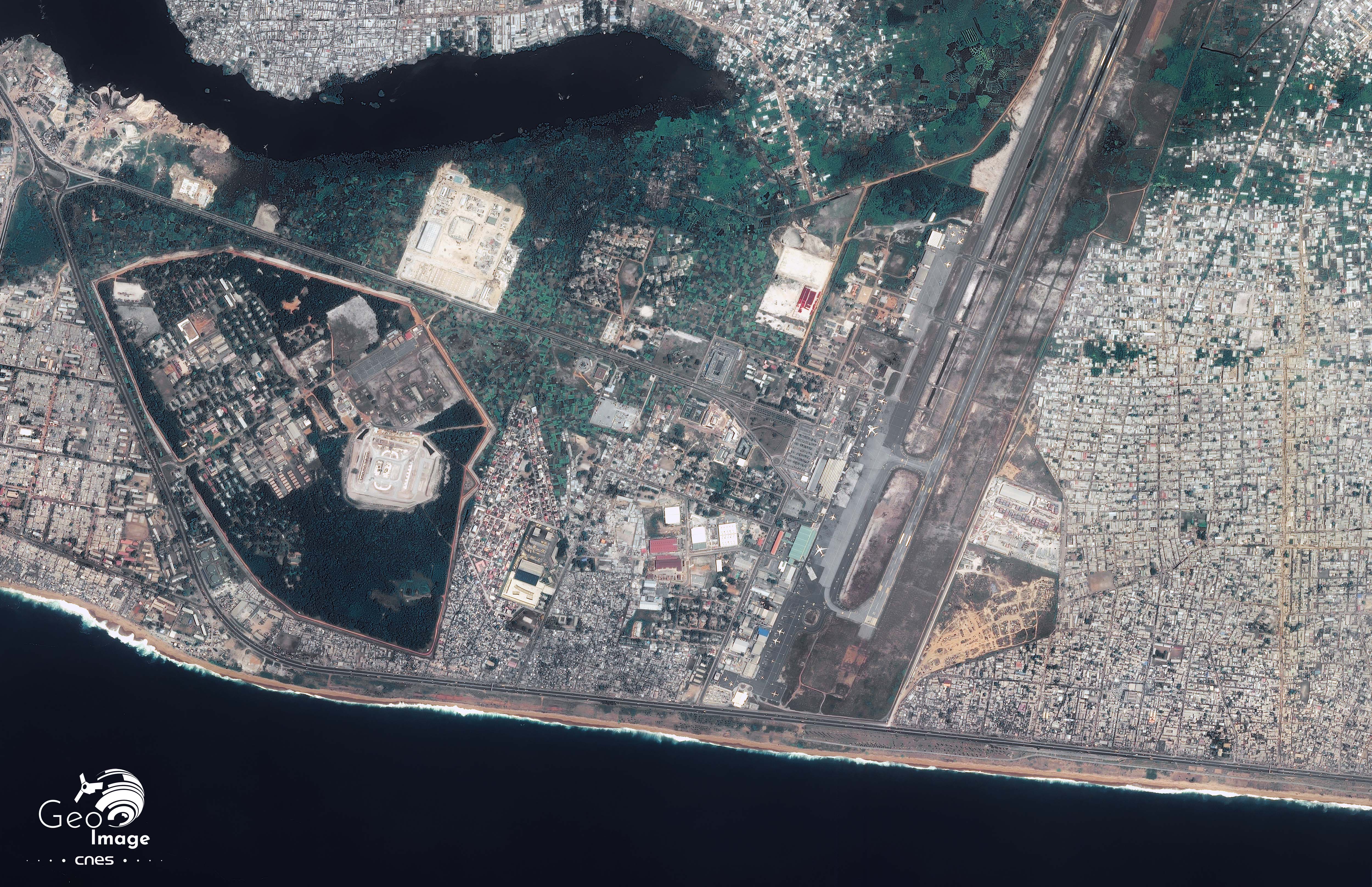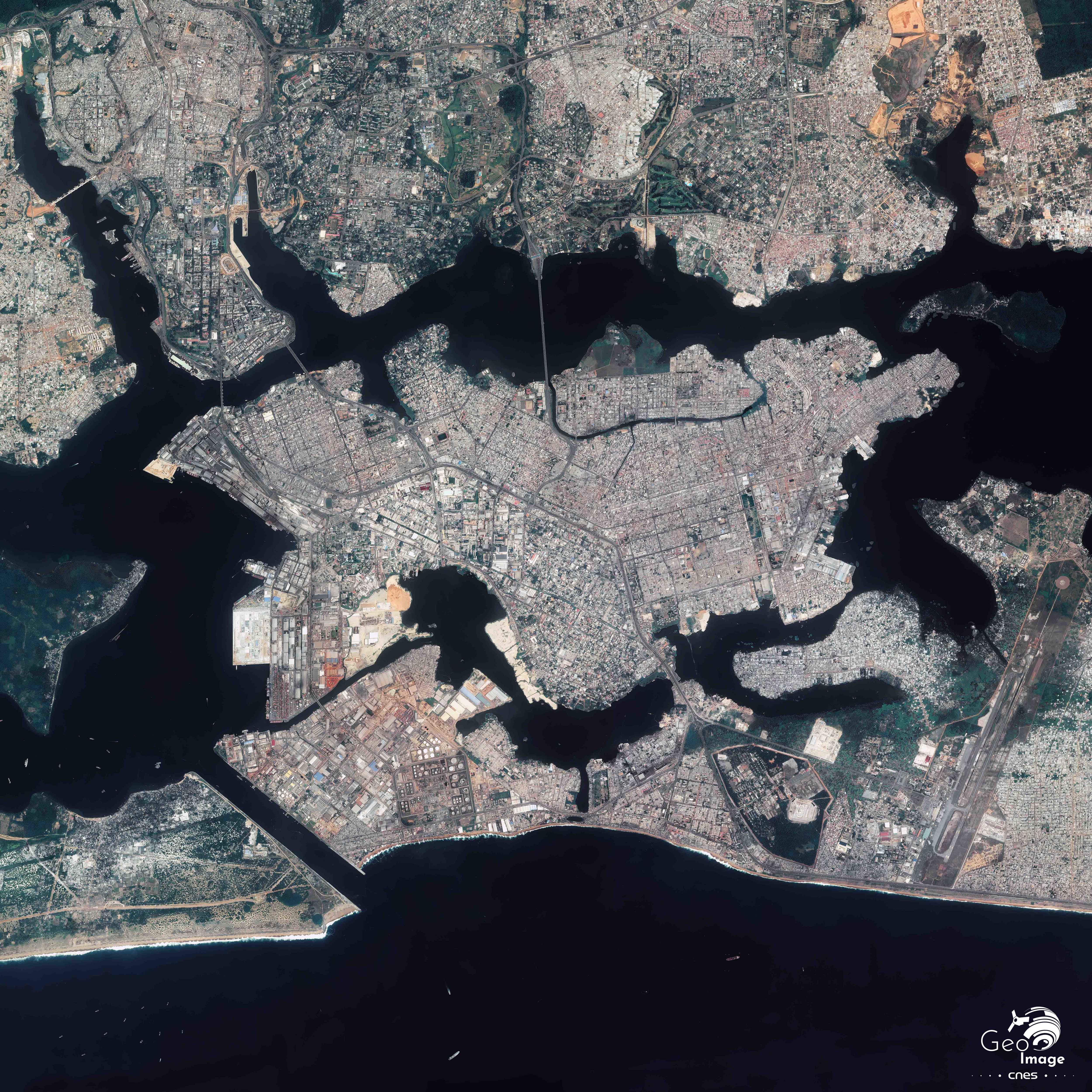 Cette image de la ville d'Abidjan, sur littoral Atlantique de la Côte d'Ivoire, a été prise par un satellite Pléiades le 25 janvier 2022. Il s’agit d’une image en couleur naturelle, de résolution native à 0,70m, ré-échantillonnée à 0,5m.