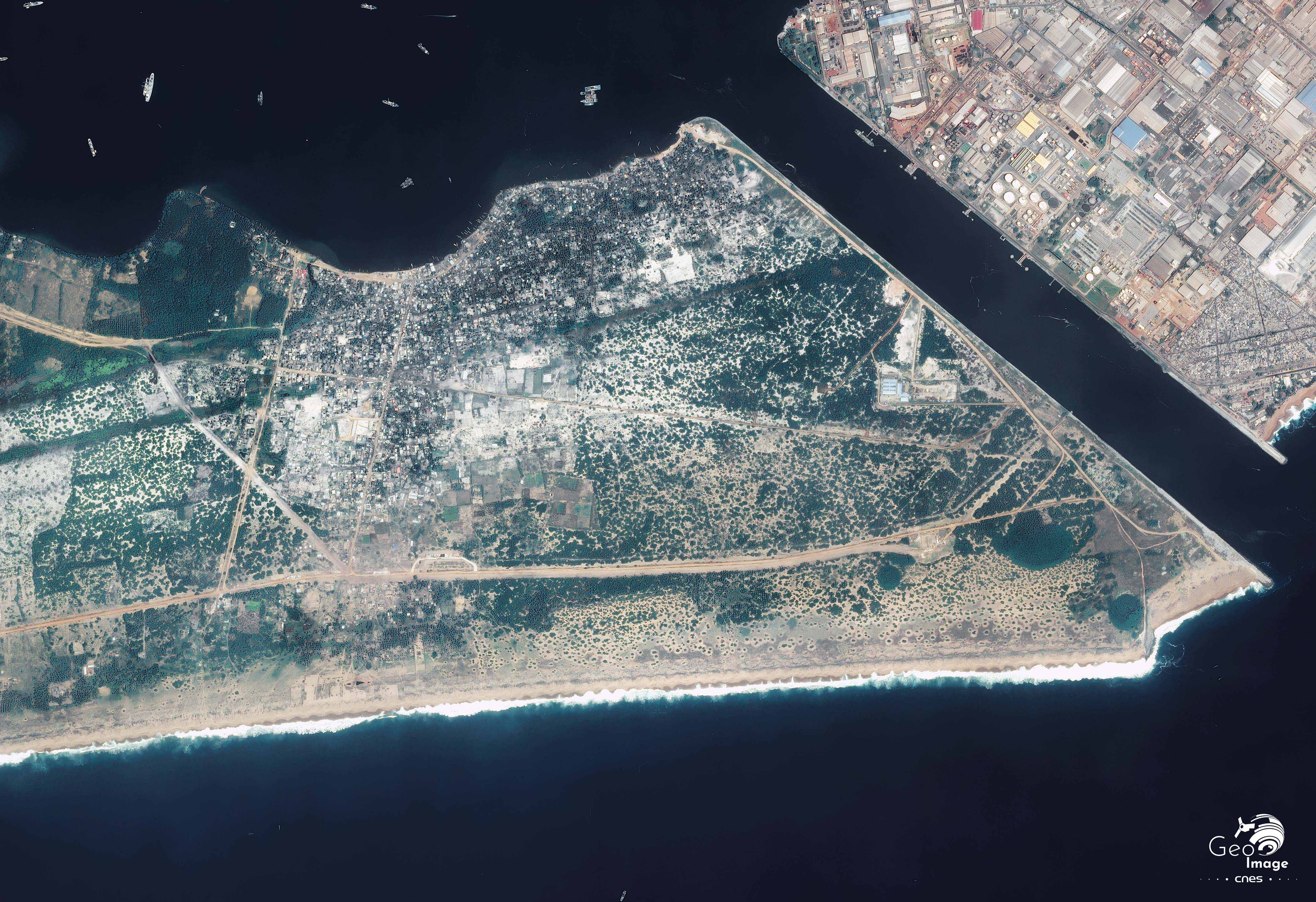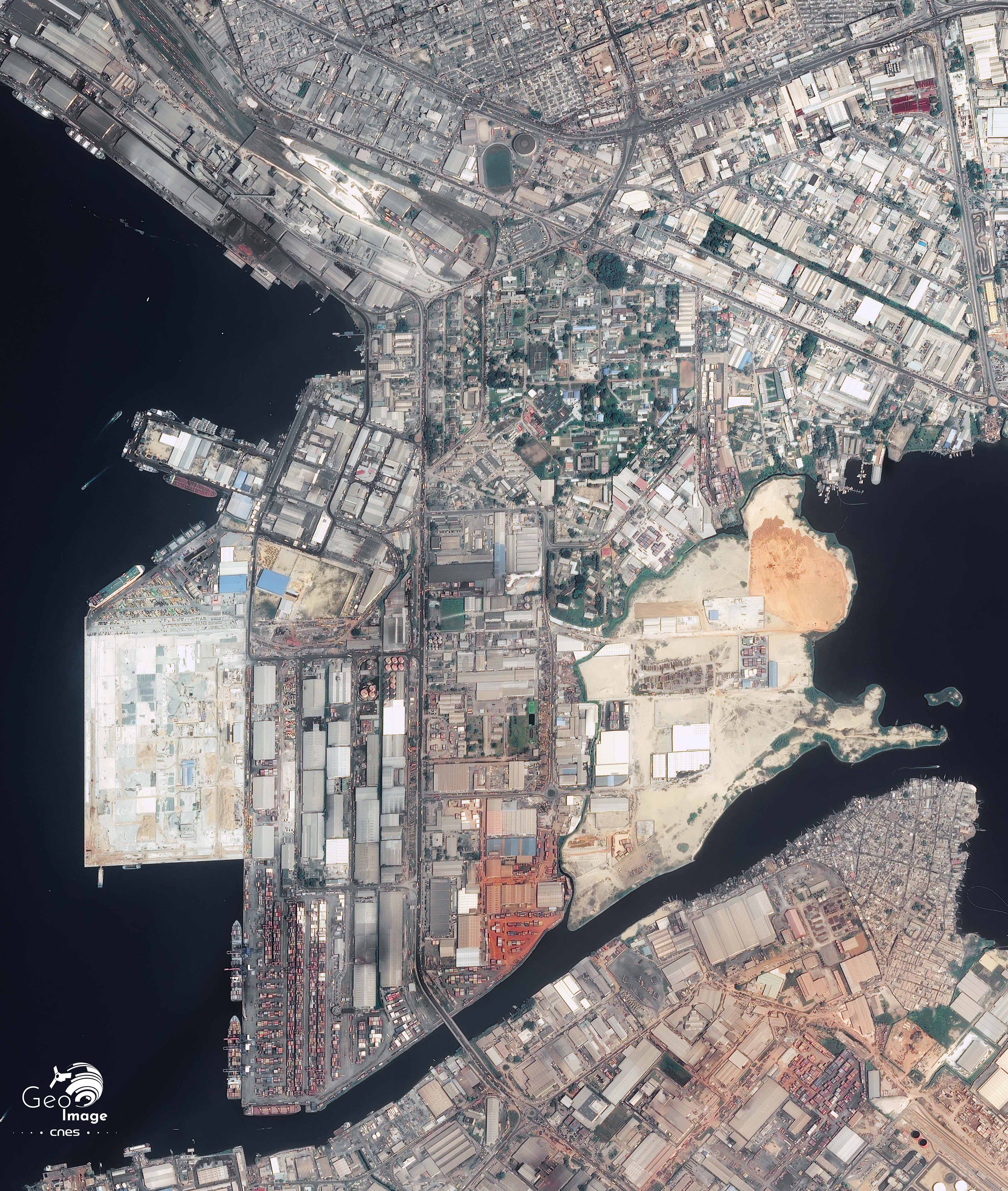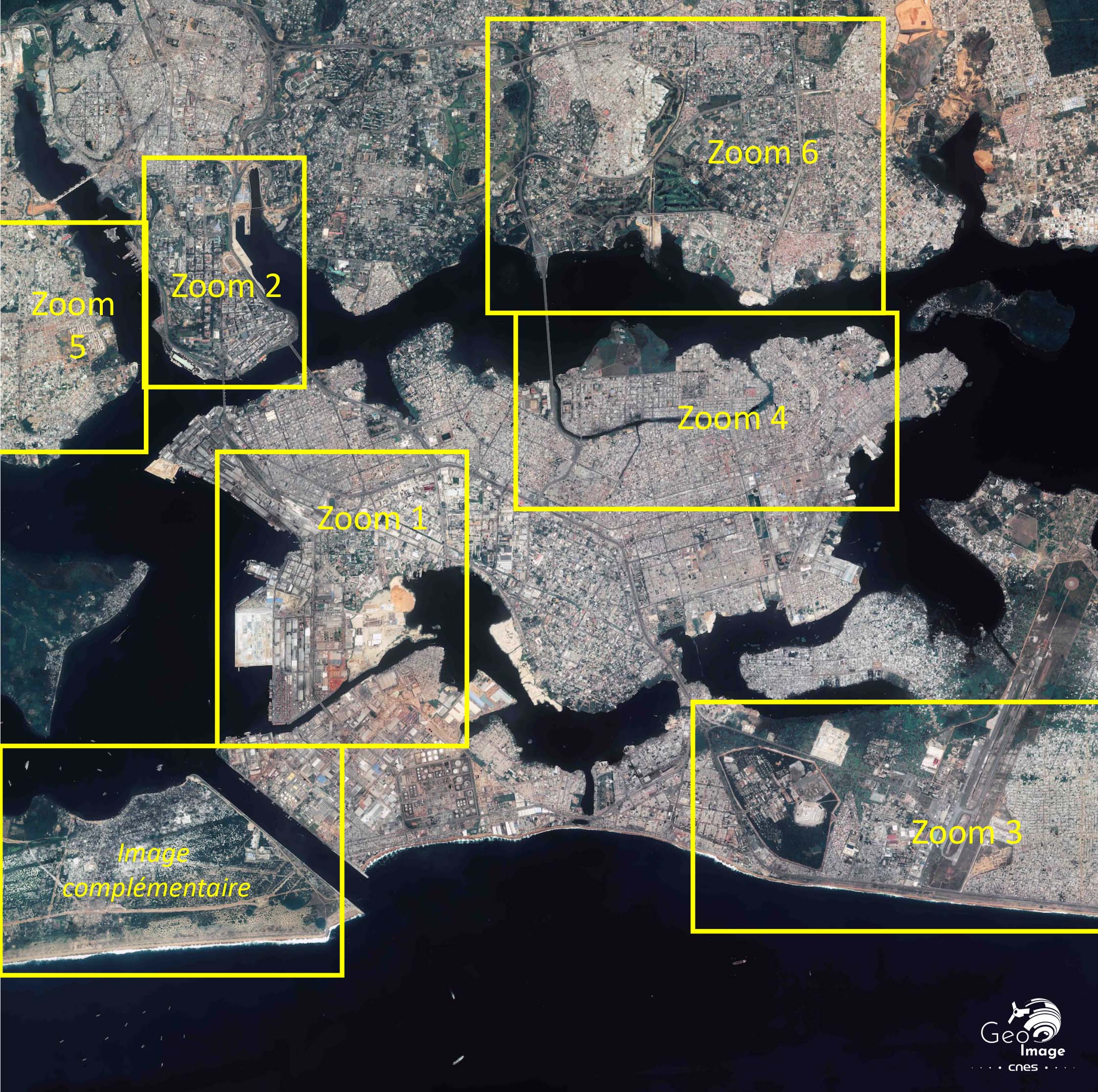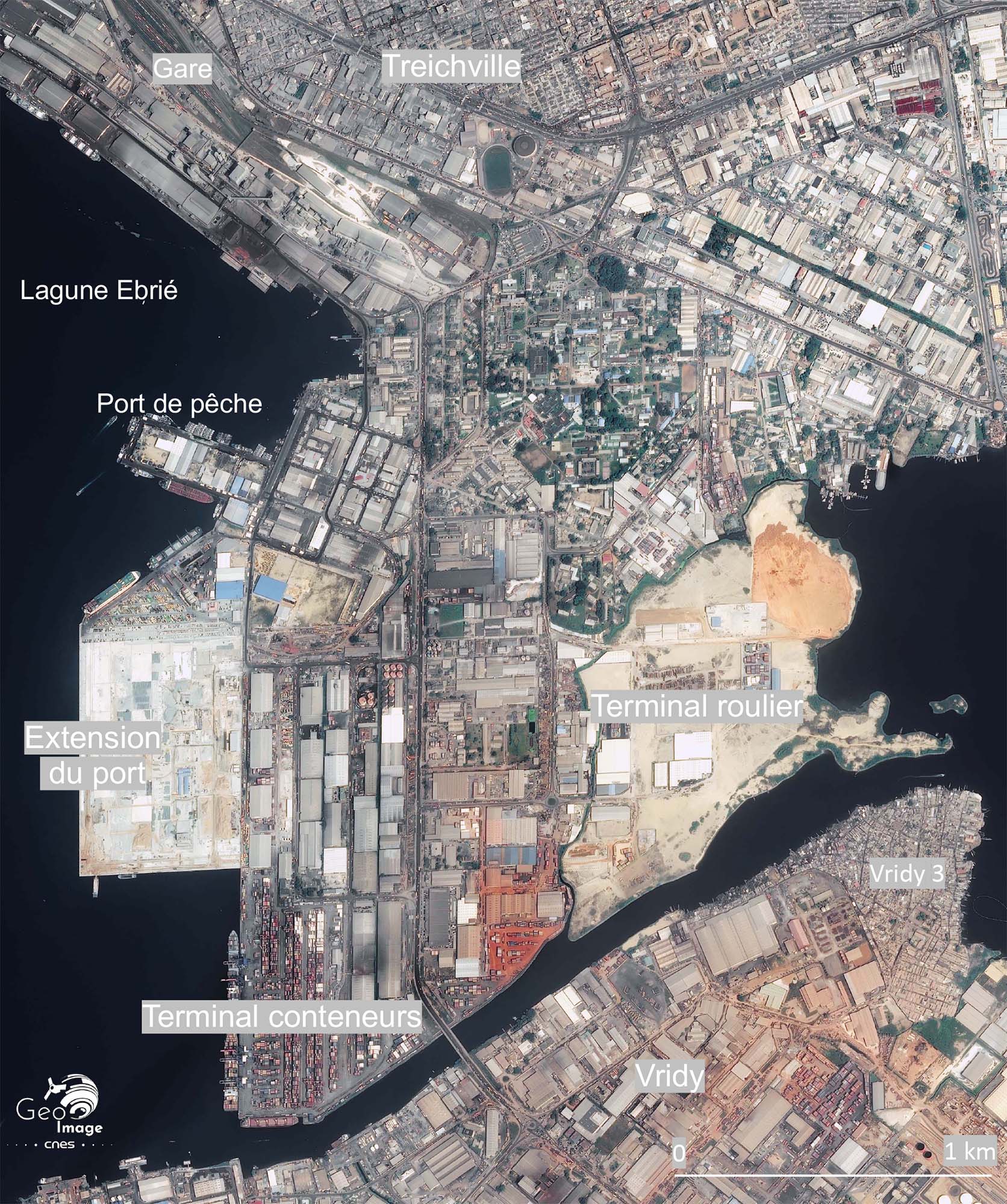L’image satellite, centrée sur le quartier de Treichville, permet d’apprécier les différentes phases de la construction du complexe portuaire de la métropole.
