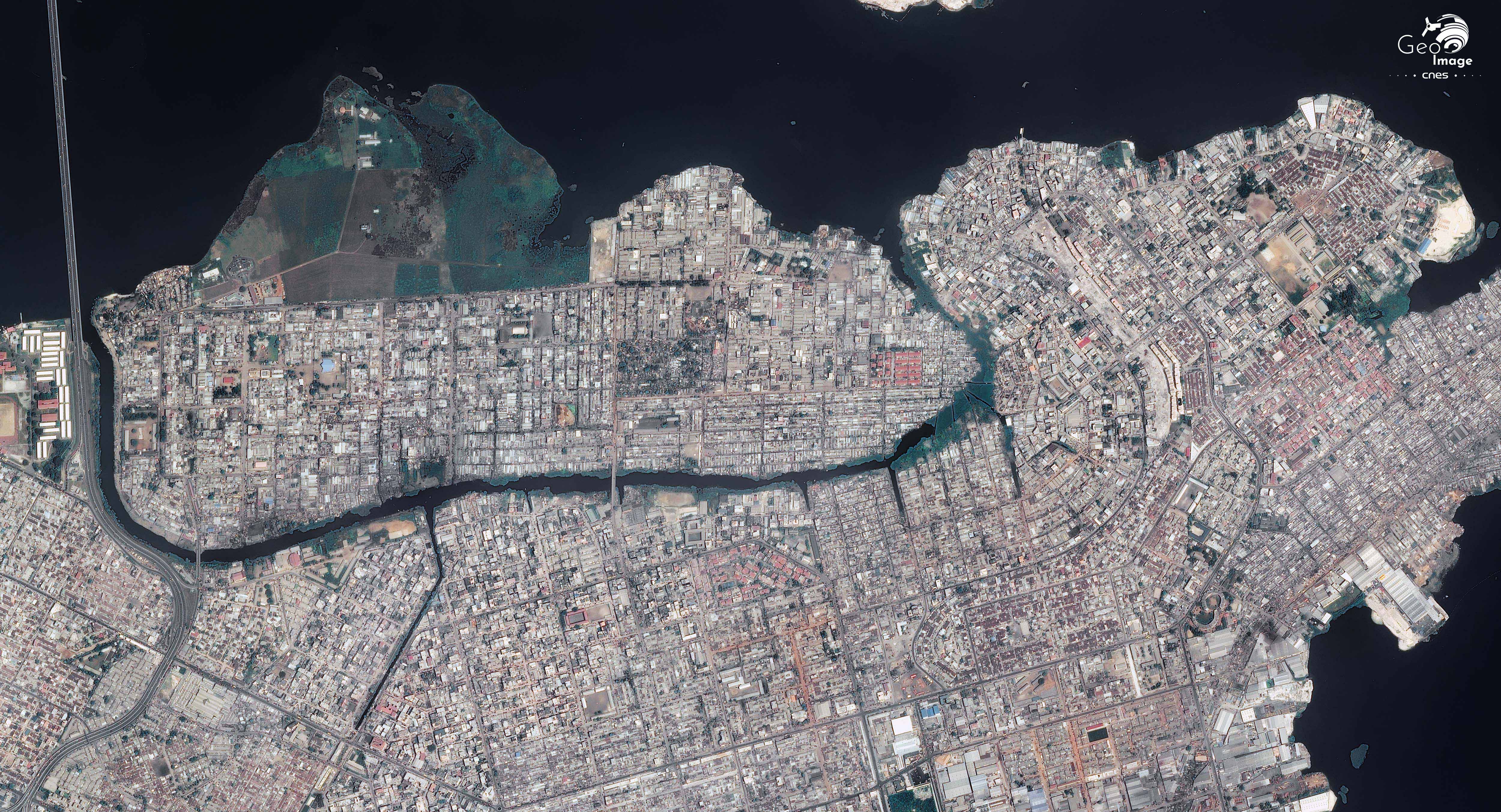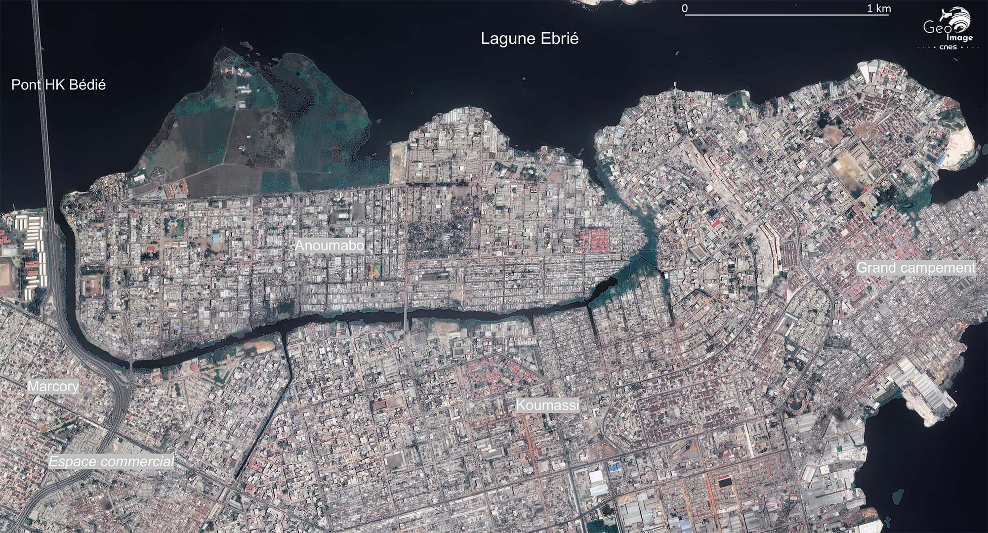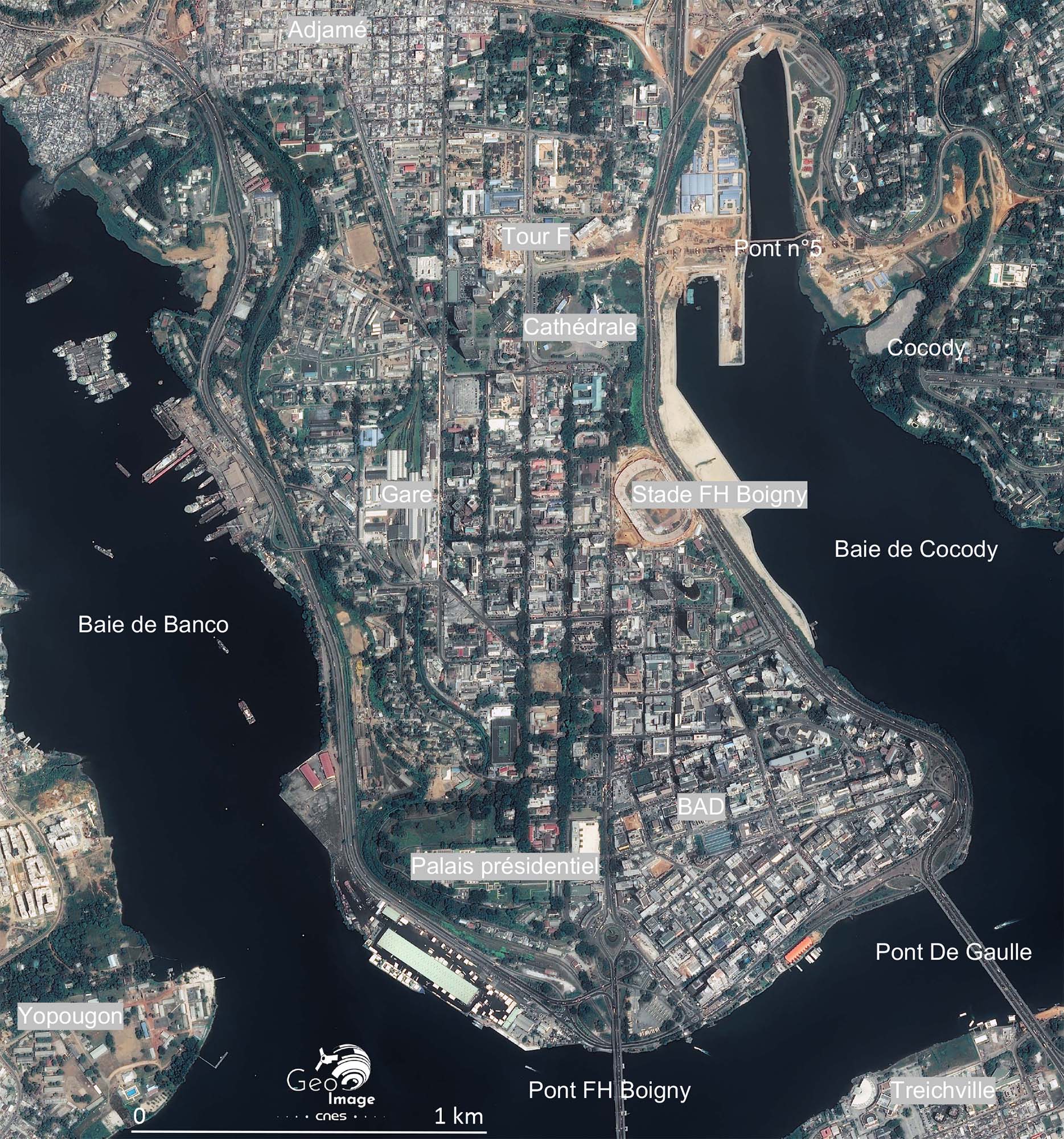 Au-delà, le long de voies non bitumées, s’étale un vaste quartier d’habitats précaires reconnaissable à ses toits en taule, à la forte densité d’un bâti peu élevé et à l’absence de viabilisation notamment pour les routes. C’est un bidonville proche du centre de la métropole et mal connecté. Au nord de l’image, sur les berges s’étend un port de pêche puis directement après, un espace (non visible sur l’image) où le pont n°4 est en construction afin de relier la route K 78 au boulevard de la paix, l’un des contournements du quartier du Plateau.