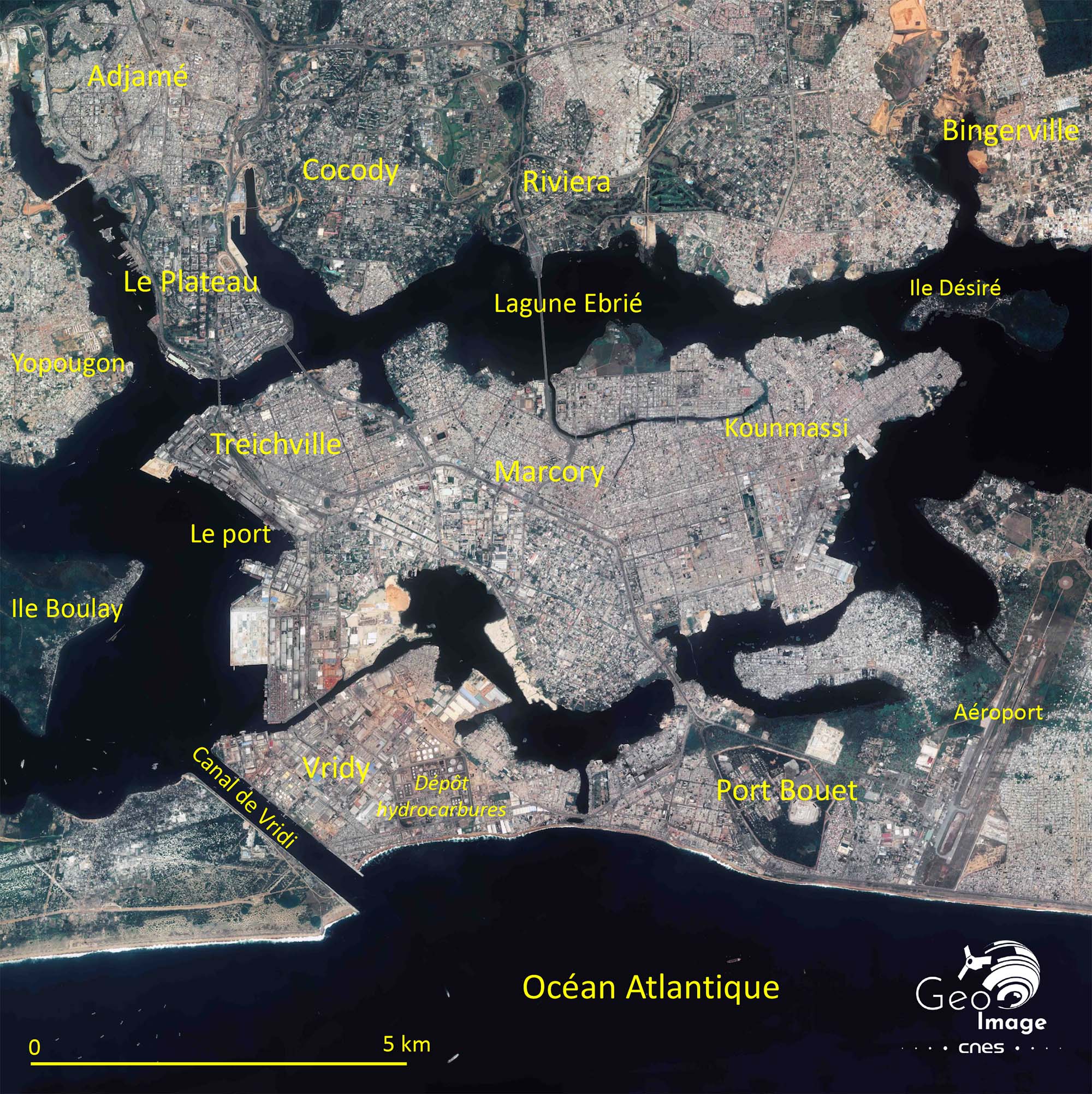 Les quartiers de Yopougon (1,1 millions d’habitants) dont la partie orientale est visible sur l’image satellite en face du Plateau et celui de Port Bouët, au sud-est au-delà de l’aéroport sont emblématiques de la métropolisation d’Abidjan. Ils sont nés de la volonté de l’Etat d’urbaniser et de viabiliser des quartiers anciennement occupés dans les périphéries. Mal reliés au centre (par l’autoroute A 100 pour Port Bouët et l’autoroute du nord pour Yopougon), séparés par l’aéroport et la baie de Banco, ils ont d’abord reçu des logements publics (petits immeubles) avant que s’y développent des quartiers d’habitats précaires, sans réelles planification ni viabilisation, où viennent s’installer des ivoiriens venant du nord et des populations issus de l’Afrique de l’Ouest francophone. L’emploi est majoritairement voire exclusivement informel.