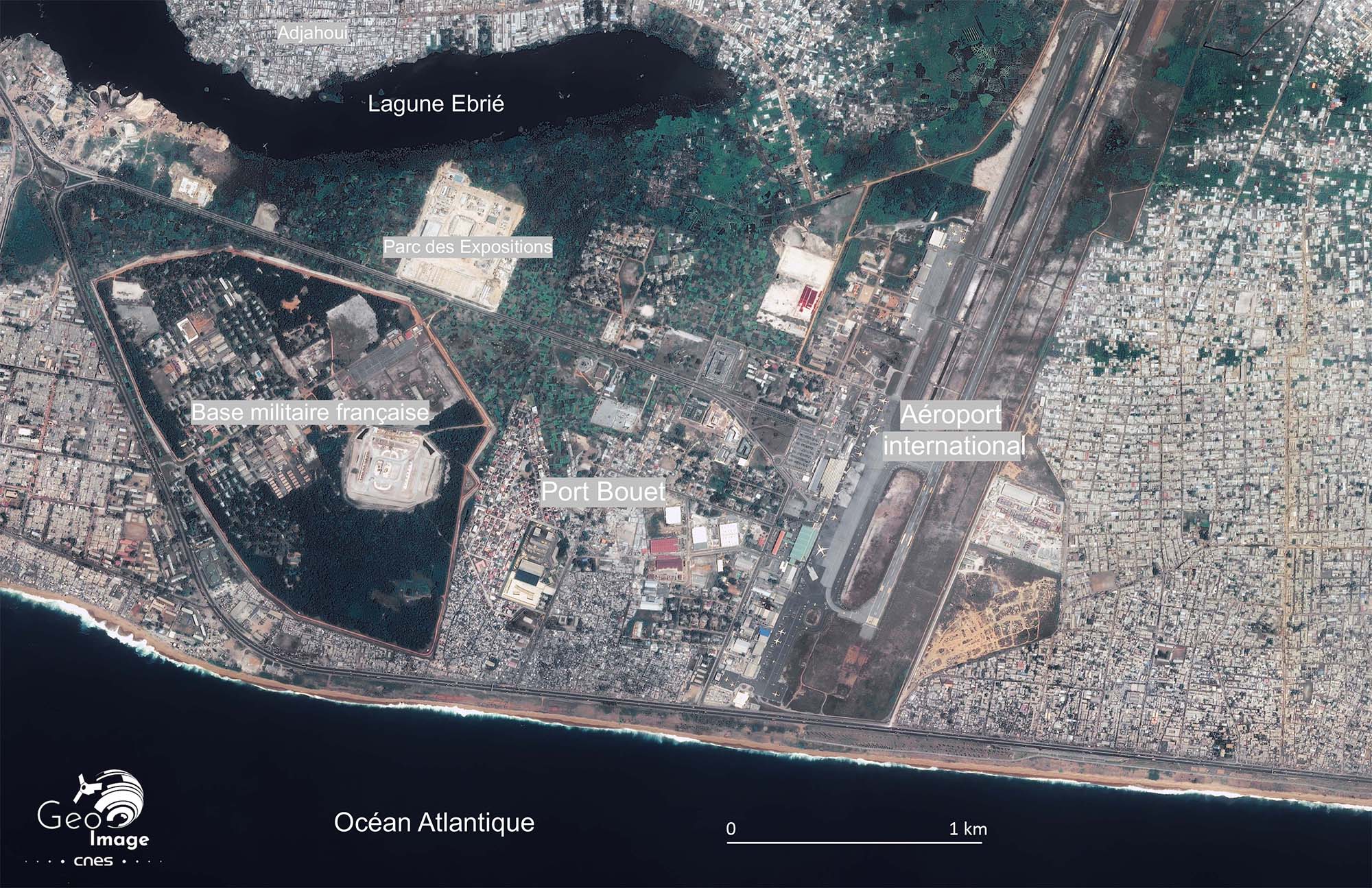 Il est progressivement construit à partir des années 1970 à une vingtaine de kilomètres du quartier du Plateau en occupant du sud vers le nord l’espace entre l’océan atlantique et la lagune. Les équipements aéroportuaires sont implantés au sud le long des pistes à proximité de la base militaire française. Parfaitement visible sur l’image, ils associent des hôtels, des entrepôts logistiques, une zone d’activités … qui s’implantent le long du boulevard de l’aéroport qui le relie à l’autoroute et au centre de la métropole. Recevant plus de deux millions de passagers, l’aéroport continue de se développer notamment avec un parc des expositions en face de la base militaire ou la future ligne de métro dont il sera le terminus.