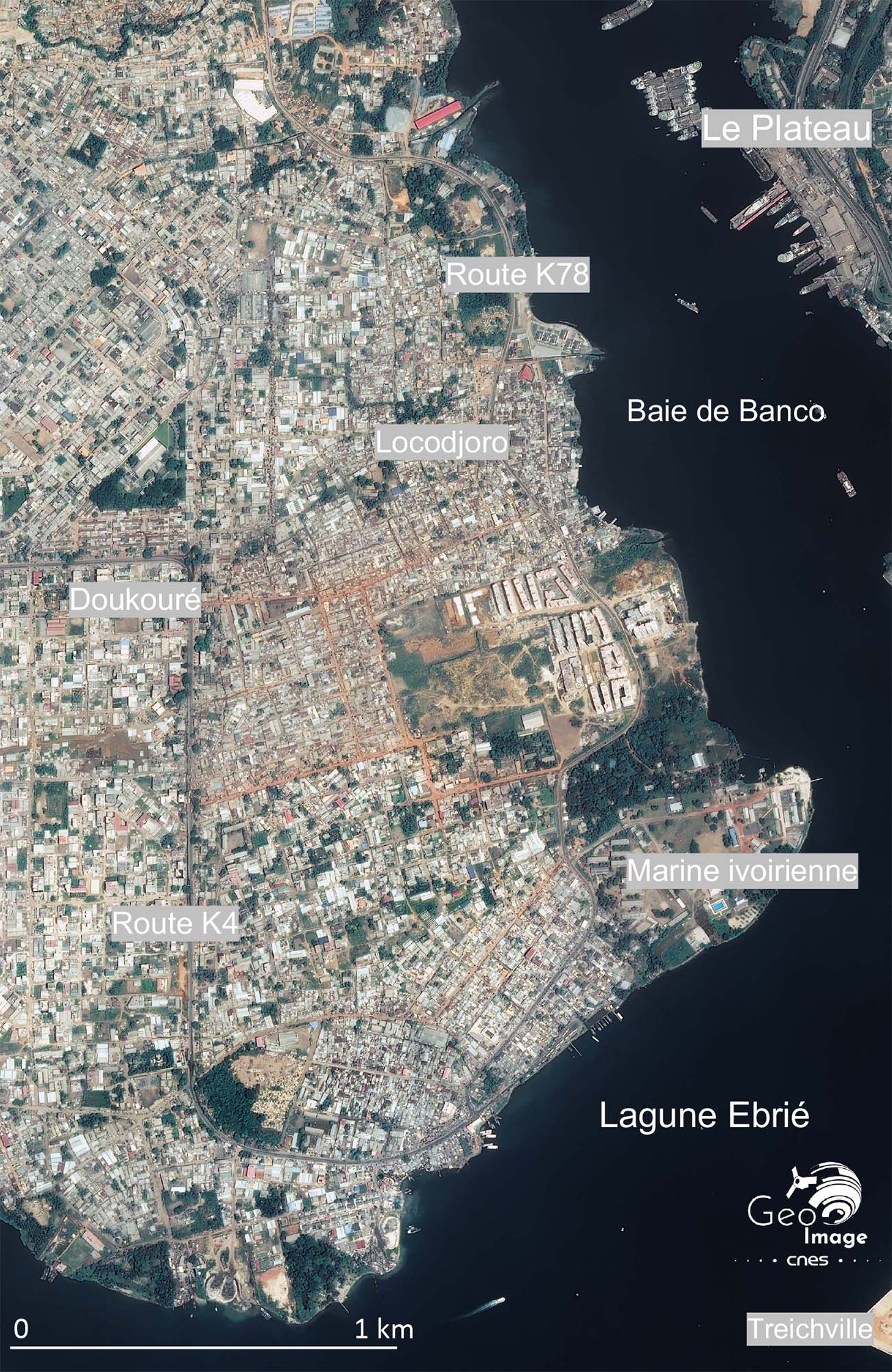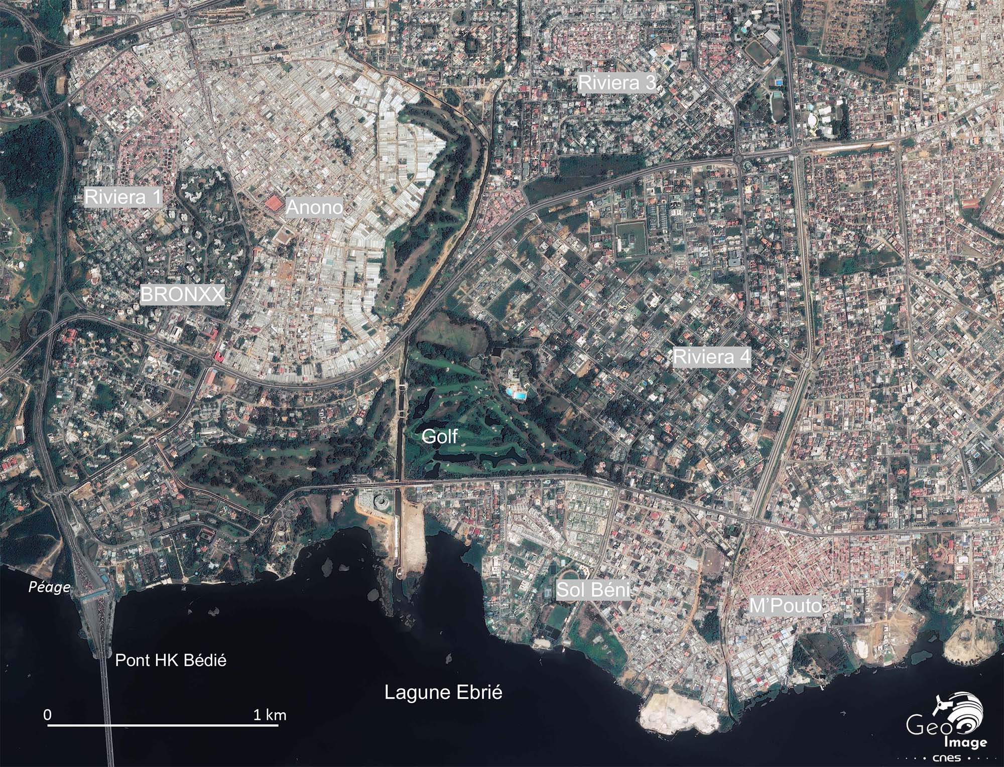 Yopougon est l’une des 15 communes du district d’Abidjan. L’image satellite montre uniquement l’extrémité orientale de ce vaste quartier populaire de plus d’un million d’habitants. Séparé du Plateau par la baie de Banco, connecté par l’autoroute du Nord (non visible sur l’image), Yopougon est mal relié au reste de la métropole. C’est une périphérie « dortoir » marquée par de profondes inégalités sociospatiales.