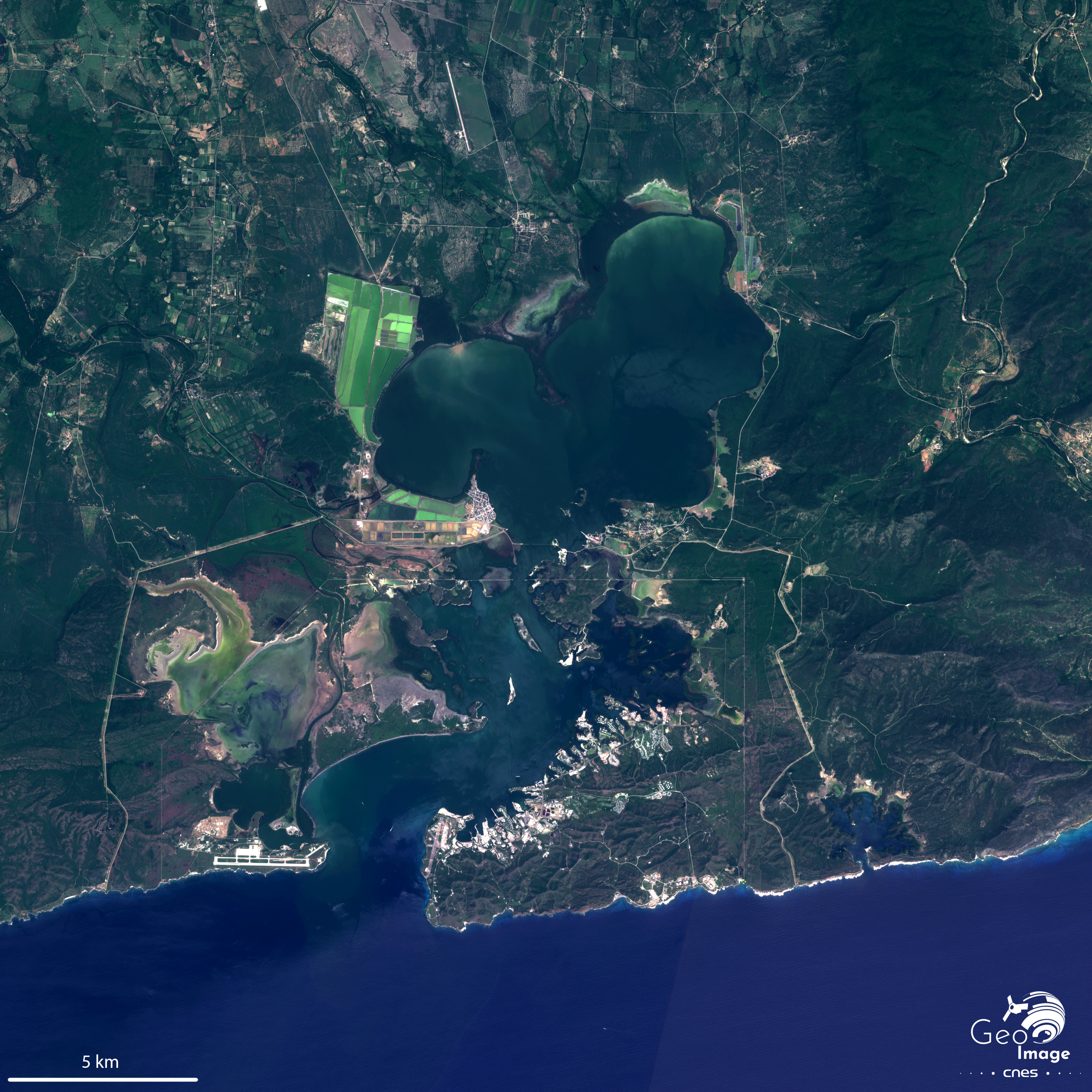 Plus au nord, la petite Baie du Guantanamo se continue par la Grande Baie septentrionale. La passe entre les deux sous-ensembles est très étroite et se caractérise par de nombreuses îles basses comme la Flamingo Cay, traversée par le tracé frontalier. A l’est de trouve le village de Boqueron et à l’ouest celui de Caimanera. Les marais salants sont facilement repérables sur l’image. Les grandes tables, ou bassins fermés, dans lesquelles l’eau de mer s’évapore présentent des couleurs différentes selon le degré de concentration du sel.