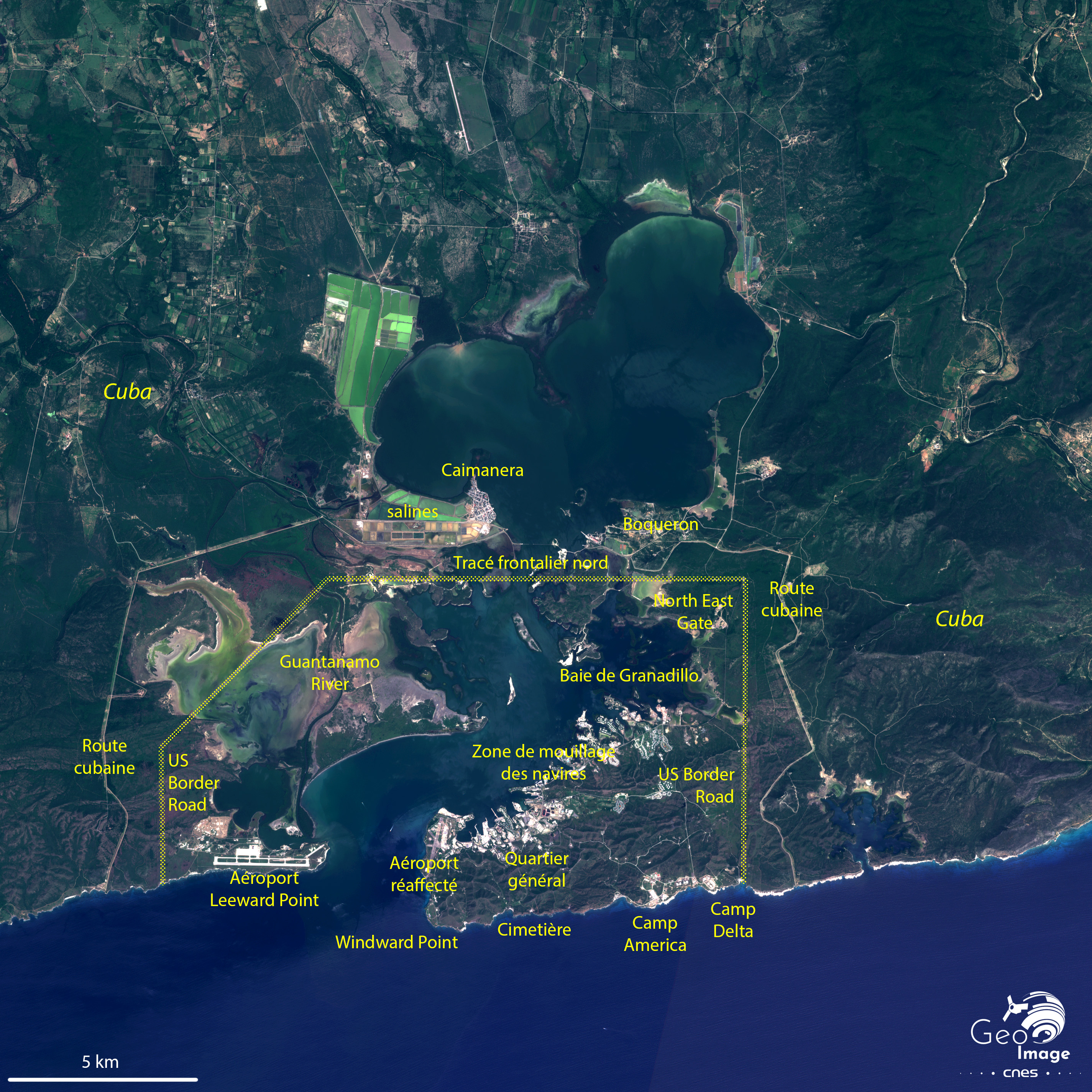 Comme le montrent très bien les deux images à petite (vue régionale) puis à grande échelle (vue locale), l’espace couvert par la base militaire (117 km2) est bien individualisable. On repère en particulier très bien sur l’image générale de chaque coté de la baie les grands axes de circulation enserrant la base qui ont été réalisés par Cuba. Il permette le contrôle de l’espace et facilitent la circulation des forces armées cubaines tout autour de l’enclave étasunienne.