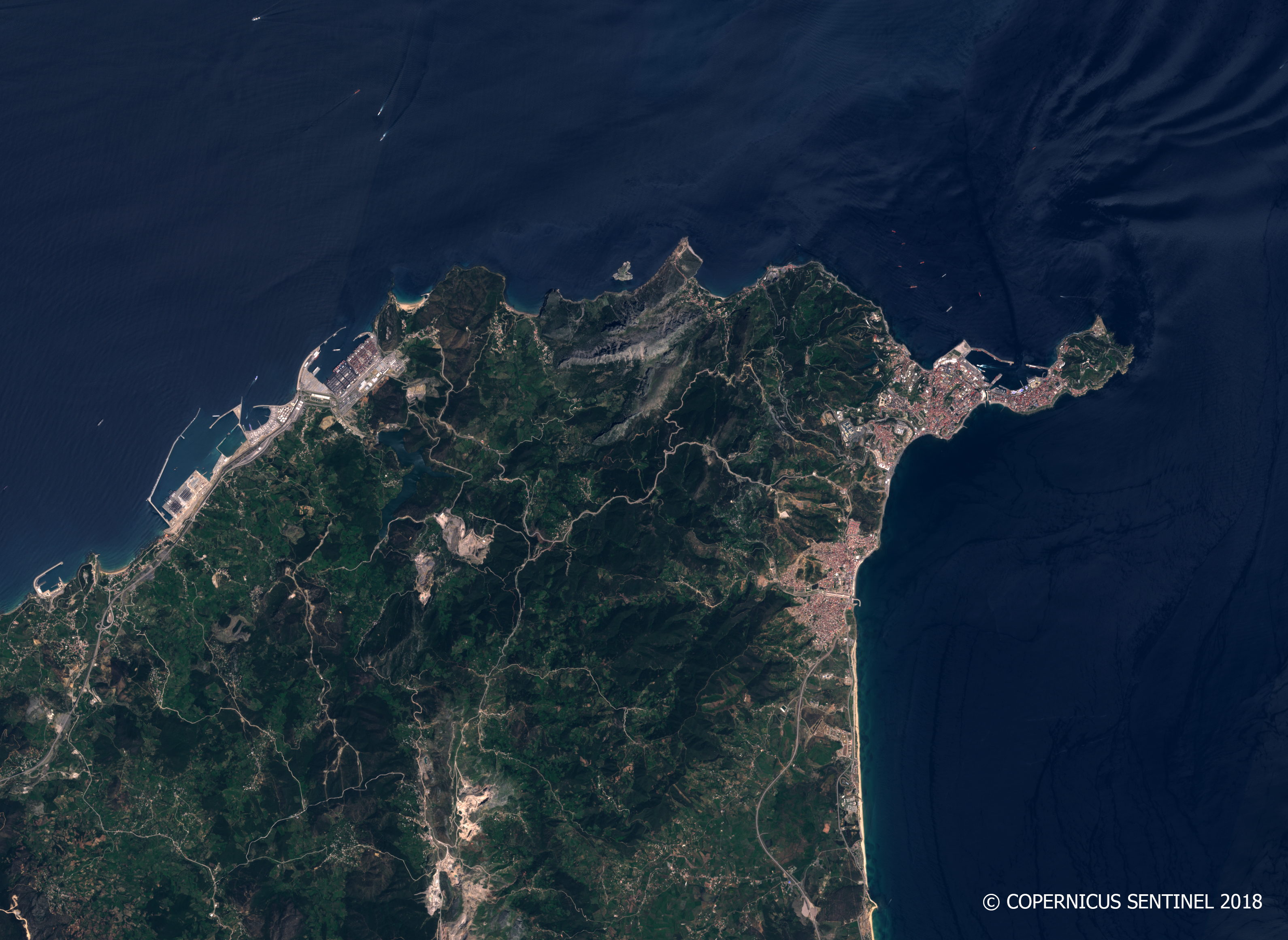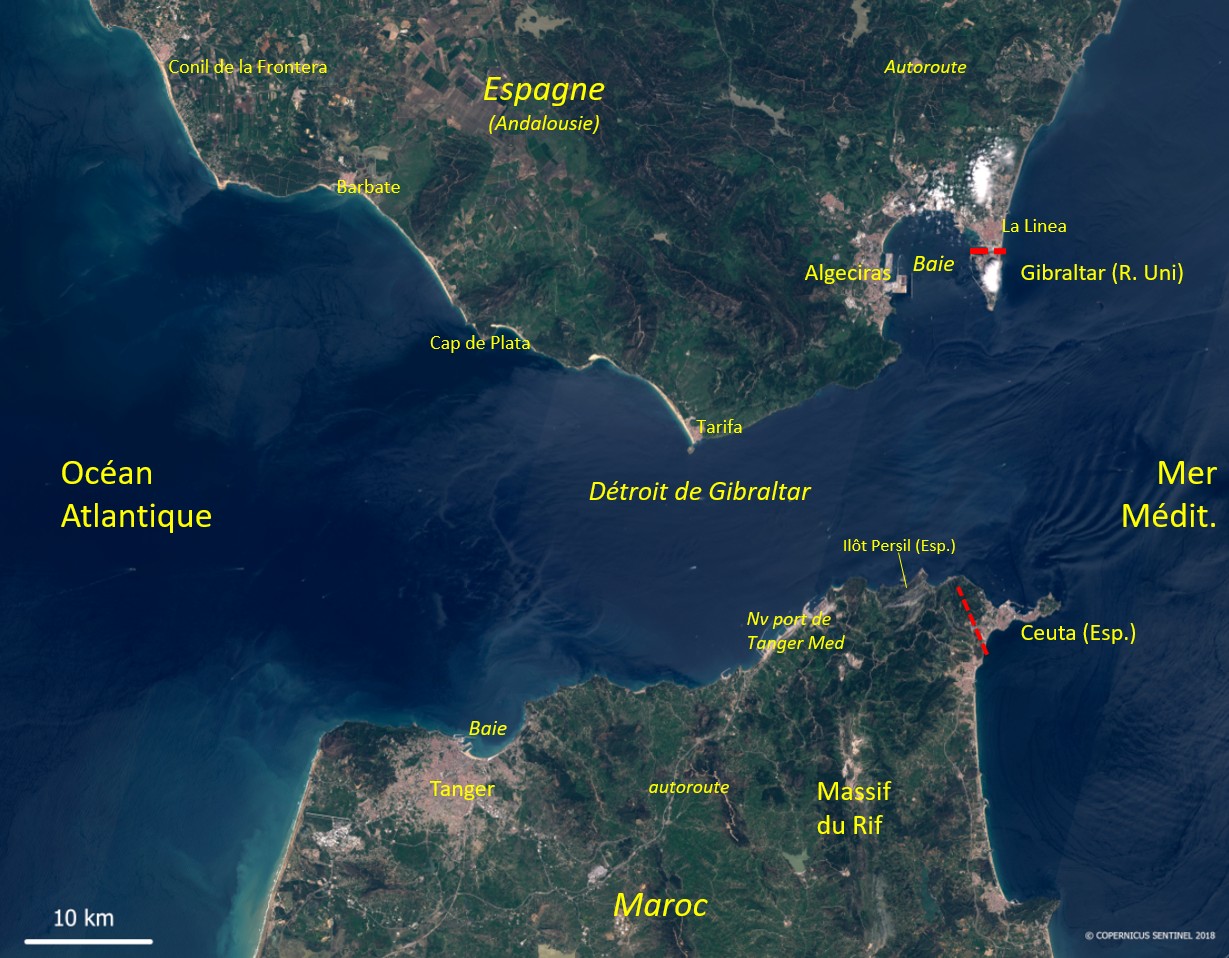 Cette image témoigne de la structure très particulière du détroit de Gibraltar. Au nord se trouve l’Espagne qui s’avance vers le sud par la Punta Marroqui et la ville de Tarifa au centre de l’image. Au nord-est, côté Méditerranée, se trouve un site exceptionnel bien visible : une vaste baie bien abritée et fermée par un puissant cap. Elle accueille le port d’Algéciras et, surtout, la Puntas Europa et le rocher de Gibraltar, sous souveraineté britannique.