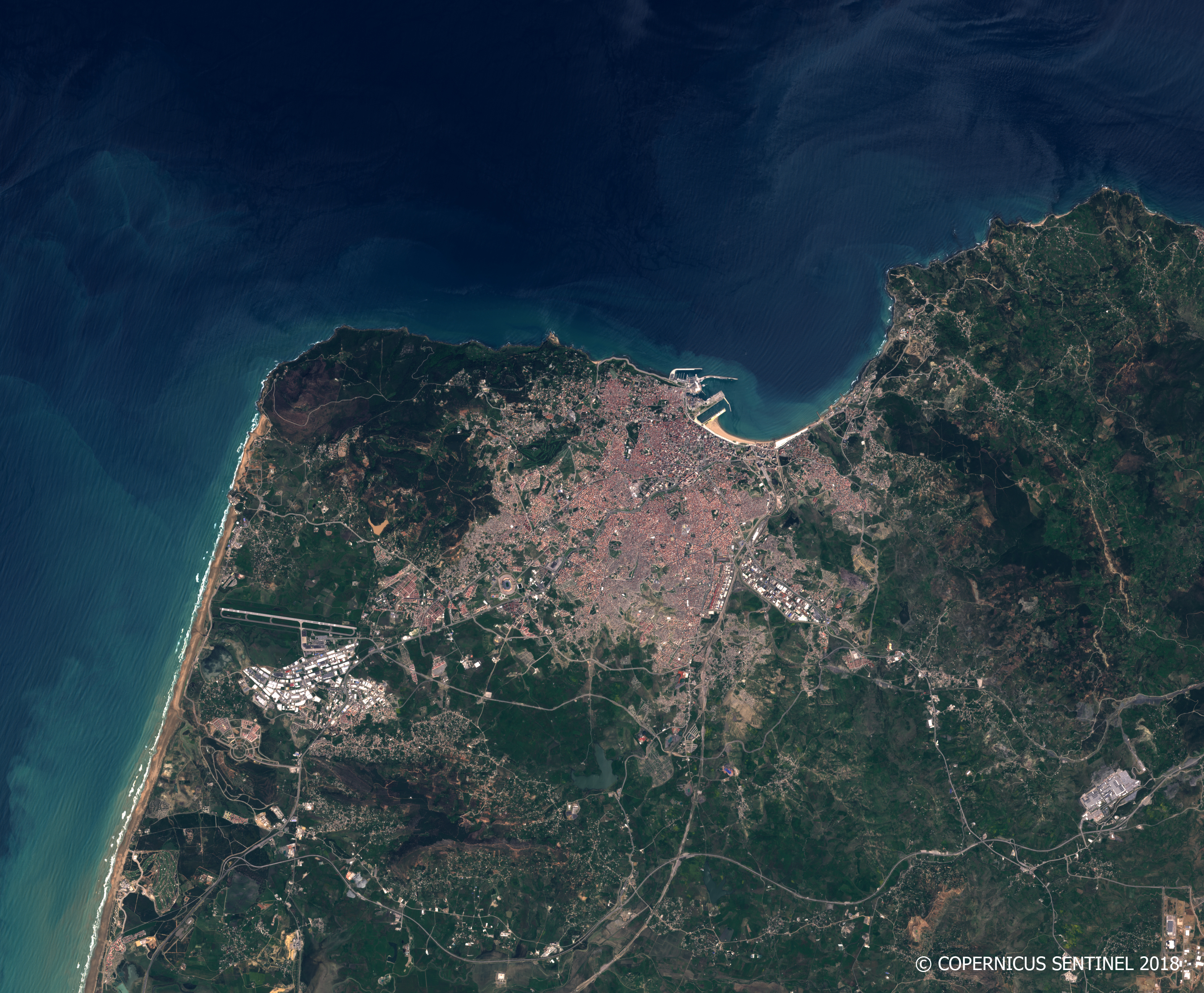 L’image couvre la ville de Tanger et sa grande région métropolitaine au sud-ouest du détroit de Gibraltar. Elle se déploie sur un site exceptionnel : une vaste rade orientée au nord et relativement bien abritée entre littoral rocheux à l’est et littoral de plages de sable côté atlantique. Ancien comptoir phénicien puis chef-lieu de la Maurétanie tingitane (cf. Tingis), la cité fut l’objet de nombreuses convoitises au cours des siècles. A la fin du XIXe siècle, cette porte ouverte sur le Maroc est l’objet de très fortes rivalités, en particulier entre la France et le IIem Reich allemand.