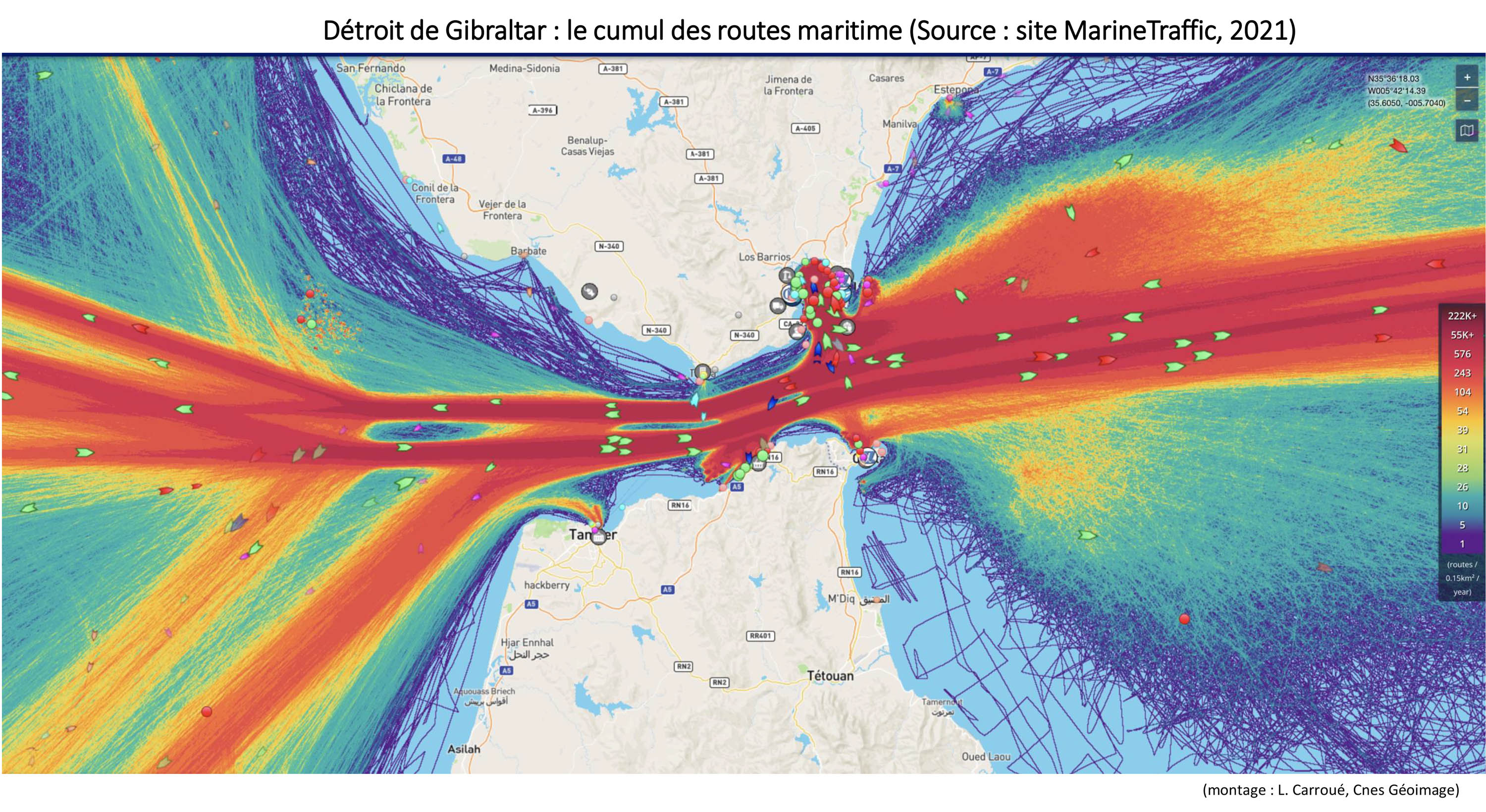 Le détroit de Gibraltar est - à moins de contourner l’Afrique par le Cap de Bonne Espérance en Afrique du Sud - le passage obligé de la grande route maritime Est/Ouest. De rang mondial, elle relie l’Amérique du Nord et l’Europe nord-occidentale d’un côté au Proche et Moyen-Orient et au delà à l’Asie de l’autre. En conséquence, environ 100 000 navires (cargos, vraquiers, pétroliers, porte-conteneurs) passent chaque année par le détroit.