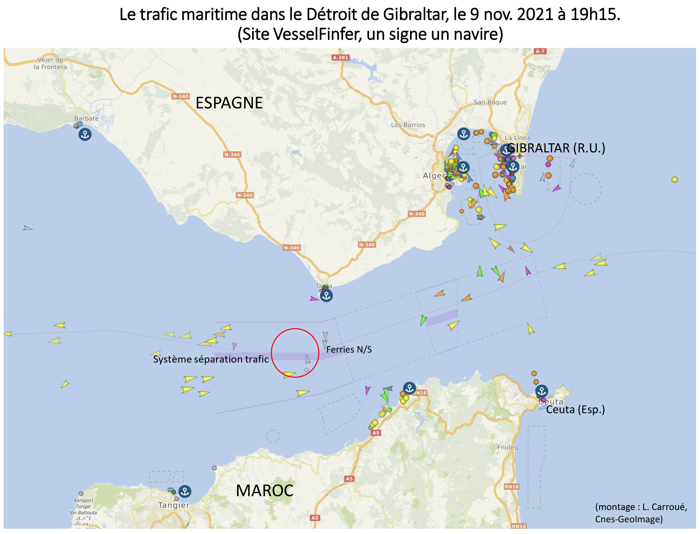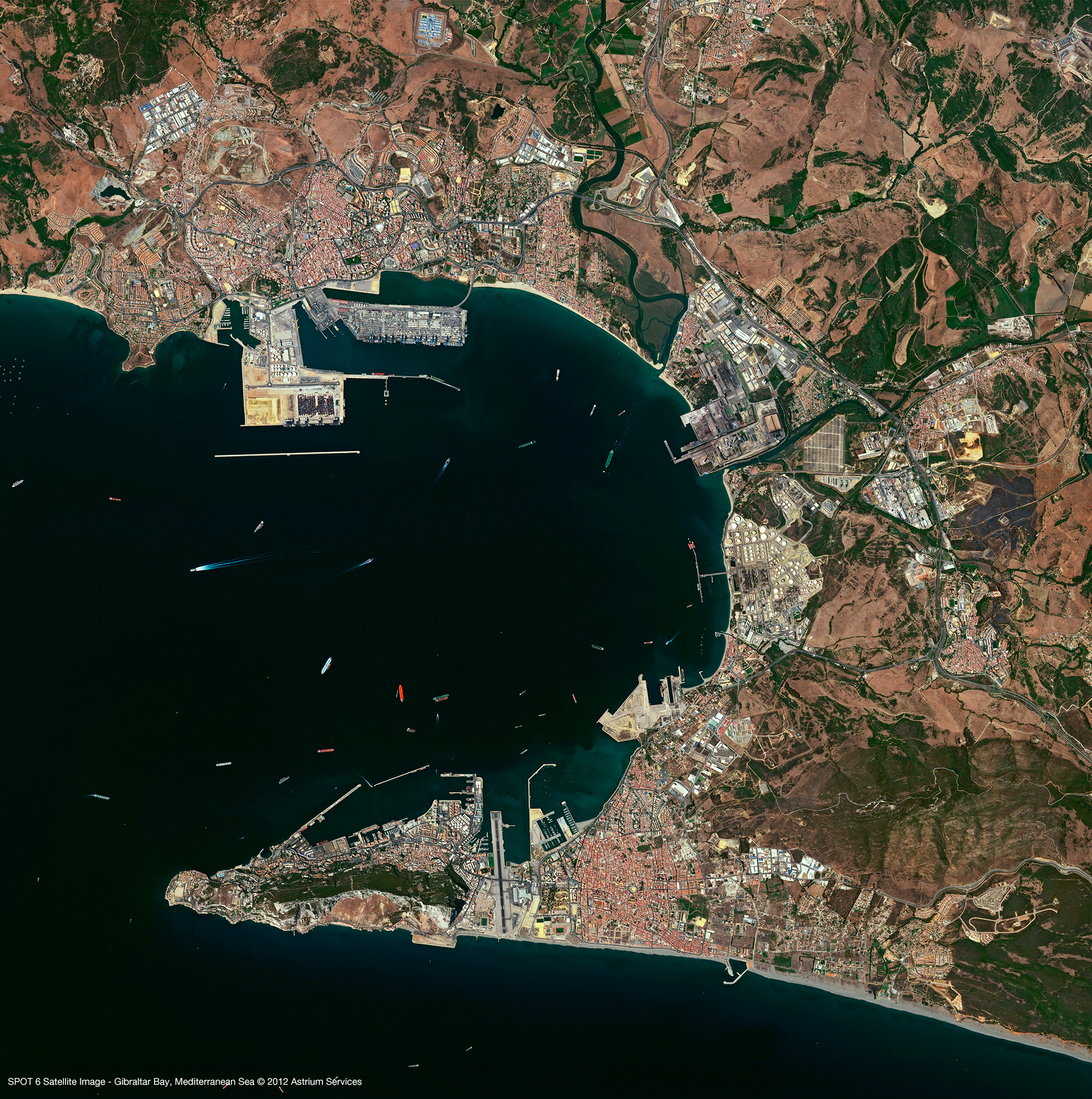 Esta imagen refleja la estructura muy particular del Estrecho de Gibraltar. Al norte se ubica España, que avanza hacia el sur por la Punta Marroqui, y la ciudad de Tarifa al centro de la imagen. Al noreste, en la costa mediterránea, se encuentra un sitio exceptional muy visible : una larga bahía bien resguardada y cerrada por un poderoso cabo. Acoge el puerto de Algeciras y sobre todo la Punta Europa y el Peñón de Gibraltar, bajo soberanía británica.