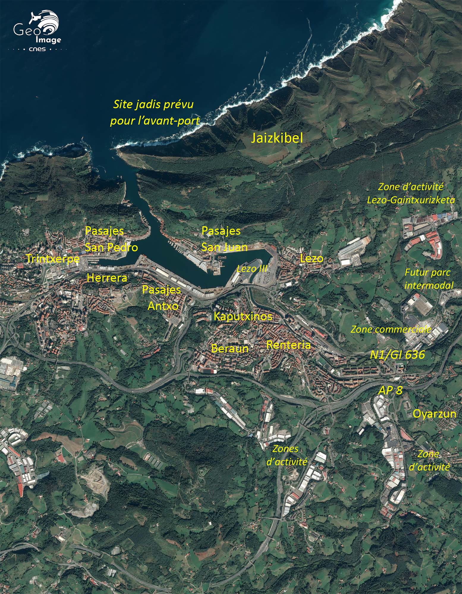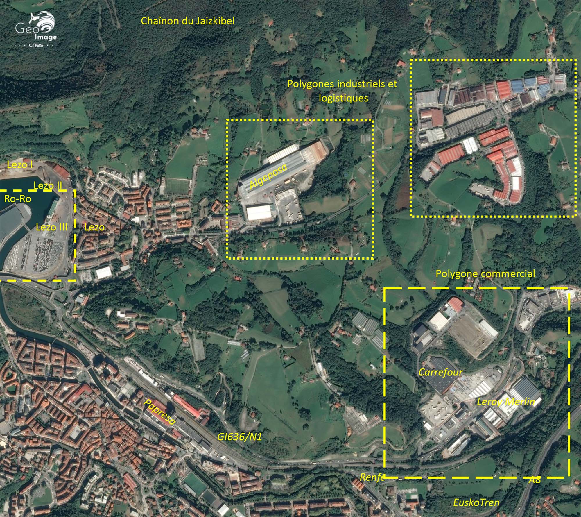 Faisant circuler un de ses personnages romanesques entre Irún et Saint-Sébastien, Jean Echenoz décrit un paysage « de sombres friches industrielles […et] d’oppressantes barres d’architecture franquiste » (in « Je m’en vais »). Or la réalité des lieux est bien plus nuancée. Cet espace appartient à l’aire métropolitaine de Saint-Sébastien, qui se trouve juste à l’ouest. Il polarise des villes industrielles, des zones commerciales et logistiques ainsi que le port de commerce de Pasajes (en espagnol) /Pasaia (basque). Au-delà de sa dimension portuaire et industrielle, ce territoire est aujourd’hui en mutations profondes, entre confirmation productive, consolidation logistique mais aussi crise économique et reconversion post-industrielle. Ces dynamiques s’insèrent dans des dynamiques transfrontalières croissantes avec le Pays basque français.