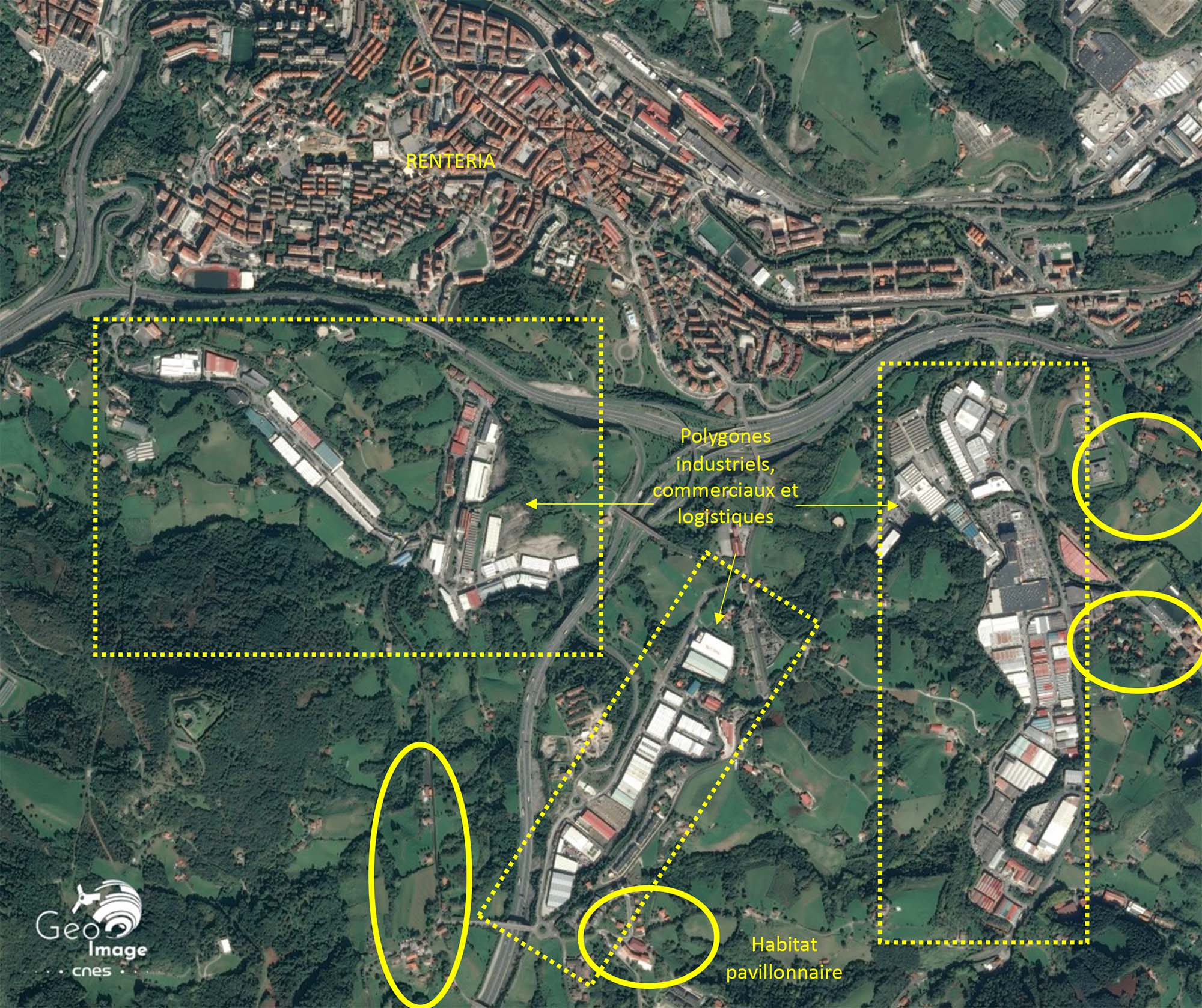 Au sud de Rentería, la césure entre l’espace urbain et l’espace périurbain est soulignée par l’ampleur des axes autoroutiers qui traversent l’image. A cet égard, deux axes principaux apparaissent autour d’un échangeur central : le premier file vers l’ouest vers Saint-Sébastien, le second oblique vers le sud, permet de contourner la métropole basque et, ainsi, de la délester des trafics de transit. Rappelons d’ailleurs que, en 2018, l’Espagne dispose de 15 585 km d’autoroute (source Eurostat) et possède le premier réseau autoroutier au sein de l’Union européenne – le pays ayant largement profité des financements européens pour connecter son pays au réseau transeuropéen de transport (RTET).