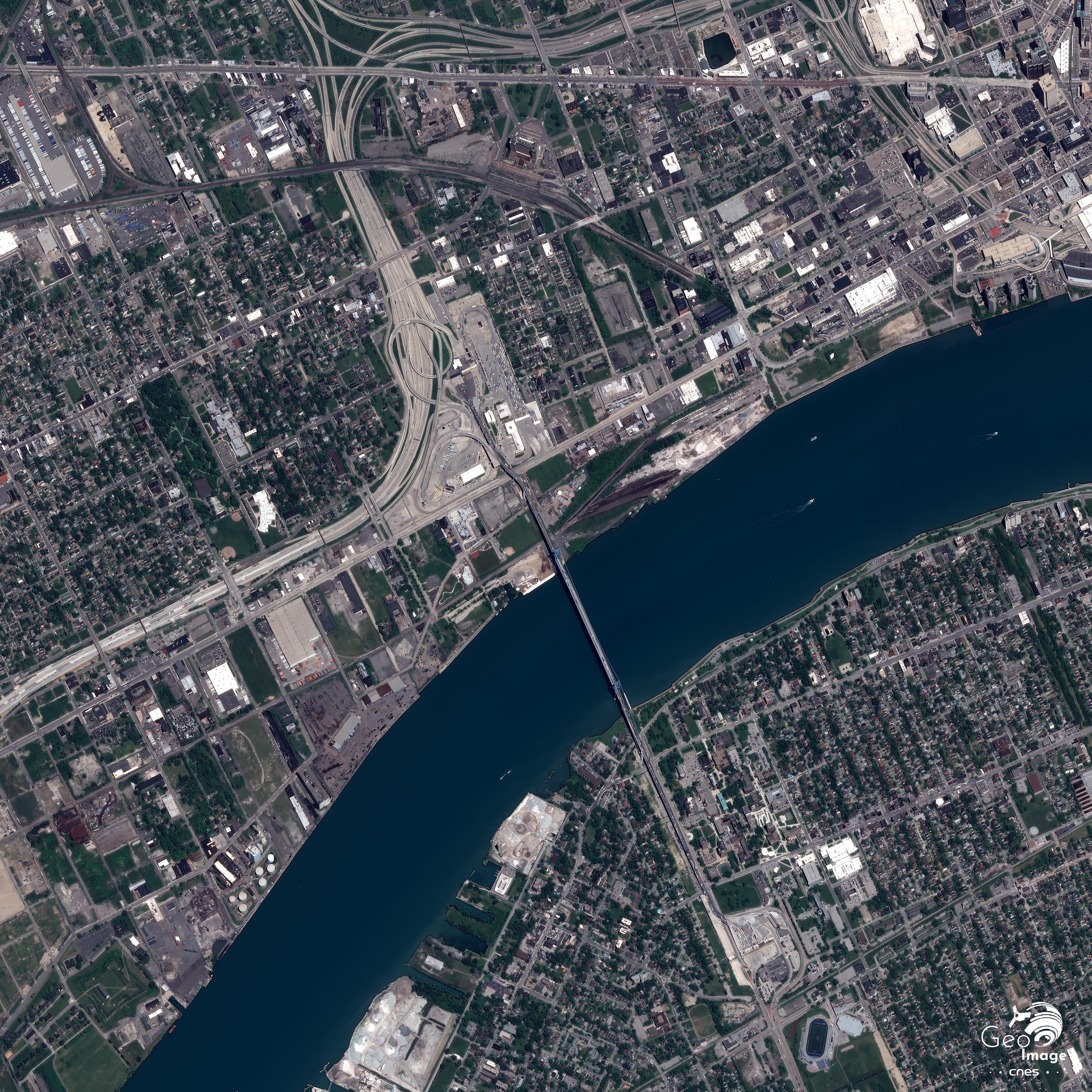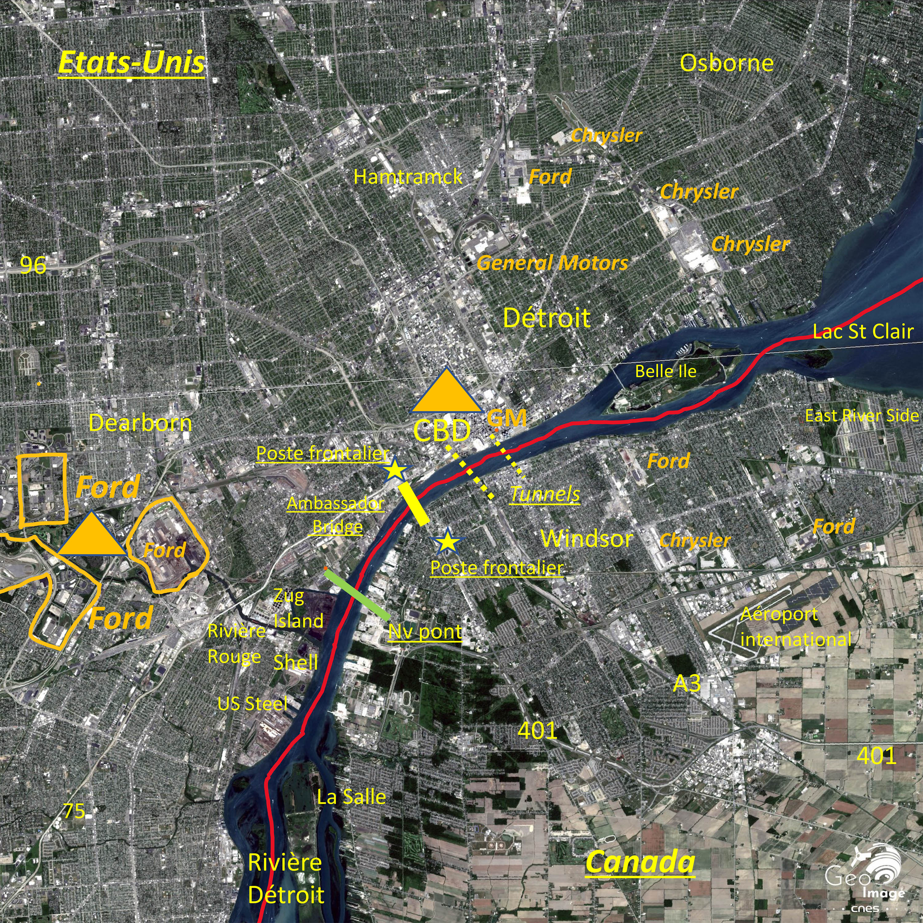 Comme le montre l’image, les deux villes sont séparées physiquement par la puissante rivière Détroit, longue de 51 km et large de 1 à 4 km, qui sert en son milieu de frontière internationale entre le Canada et les États-Unis. Les infrastructures de passages qui traversent le fleuve sont aujourd’hui totalement saturées, car sous-calibrées, et vétustes, alors que l’intégration productive multiplie les flux de marchandises.