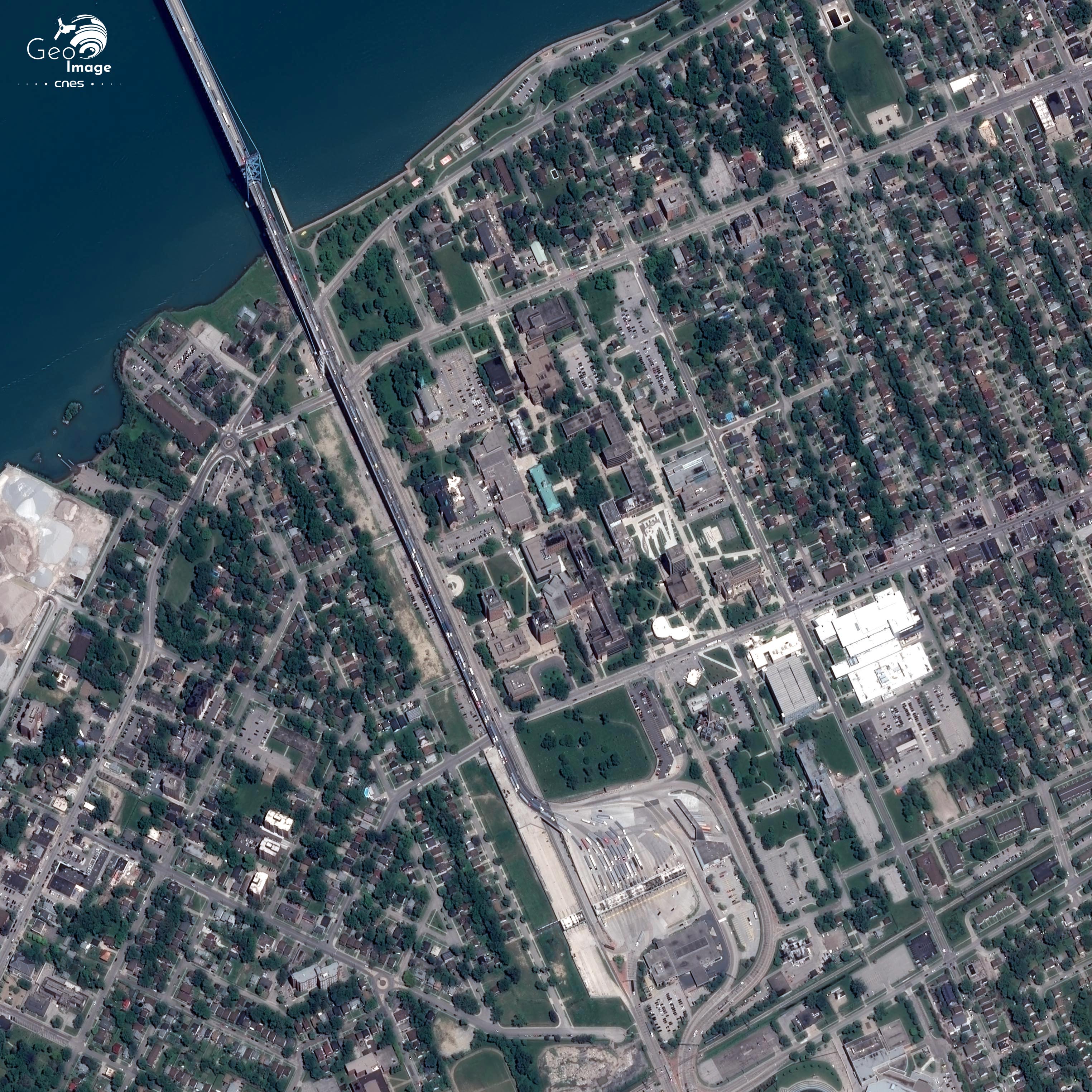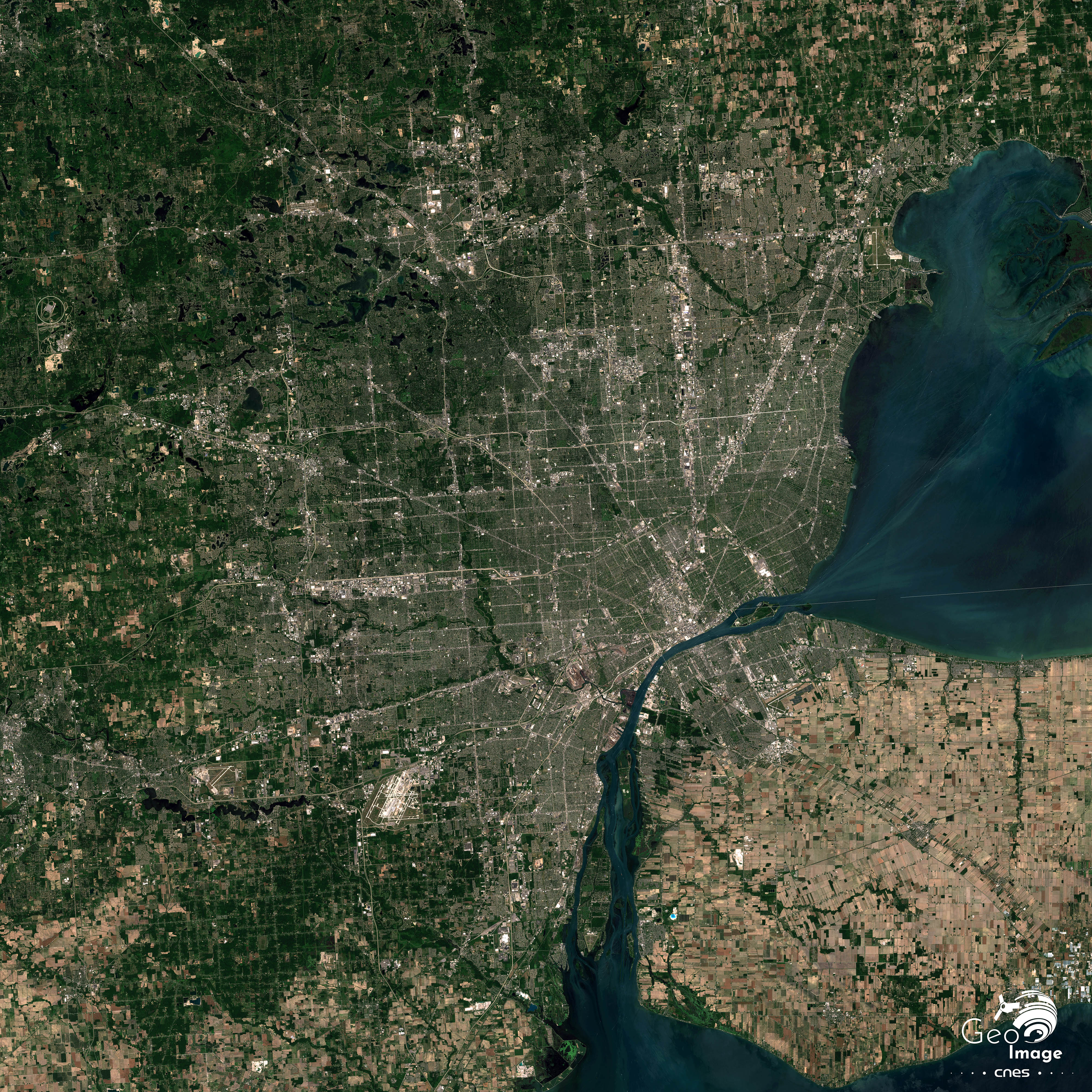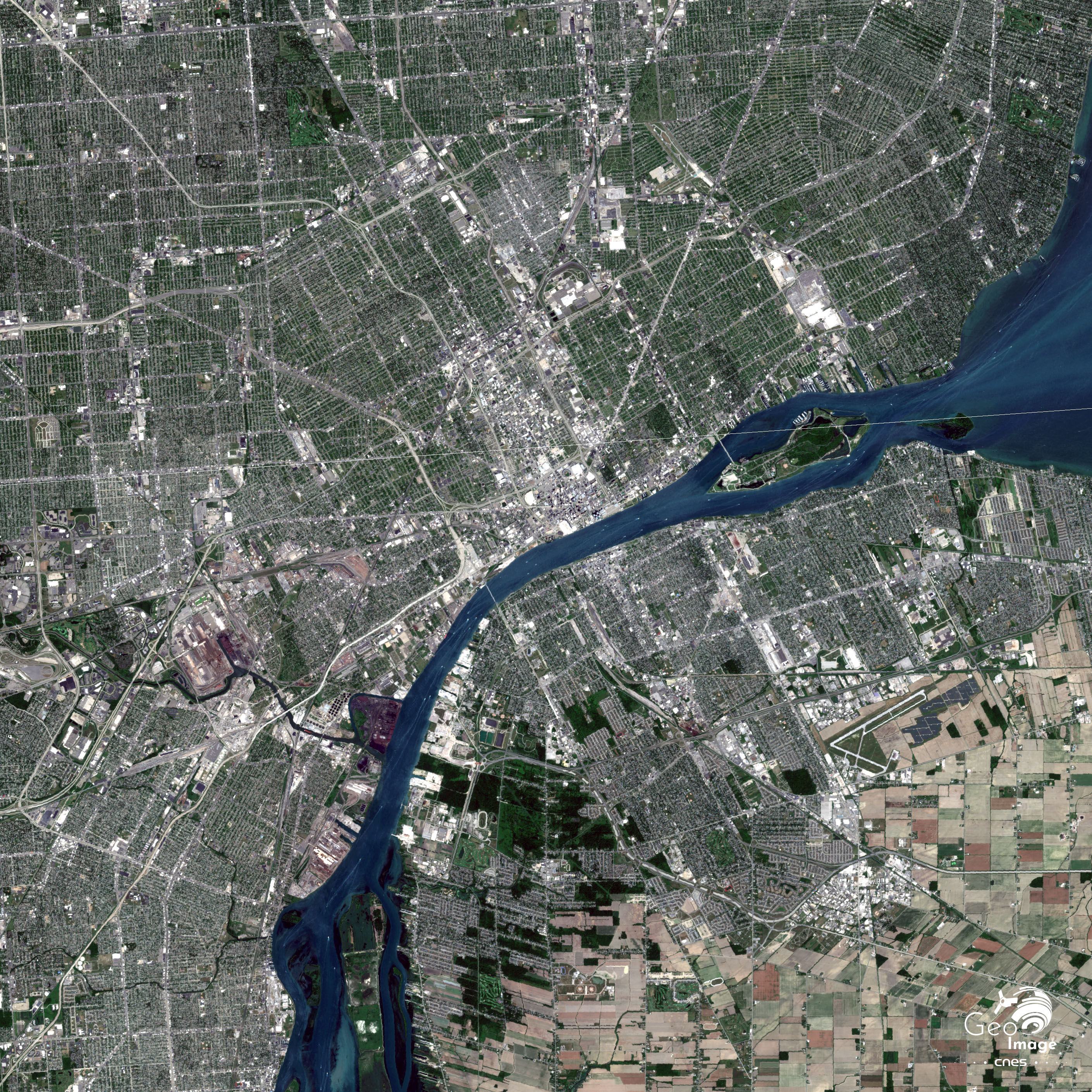 L’image témoigne à la fois de l’intégration de l’ensemble régional transfrontalier et des profonds déséquilibres entre Windsor, au Canada, et Détroit, aux États-Unis. Windsor est une ville de 217 000 habitants qui pilote une aire métropolitaine de 345 000 habitants. Comme on peut le voir sur l’image, le front d’urbanisation est limité vers l’est et très vite se distinguent d’importants espaces agricoles aux parcelles en damiers remarquables.