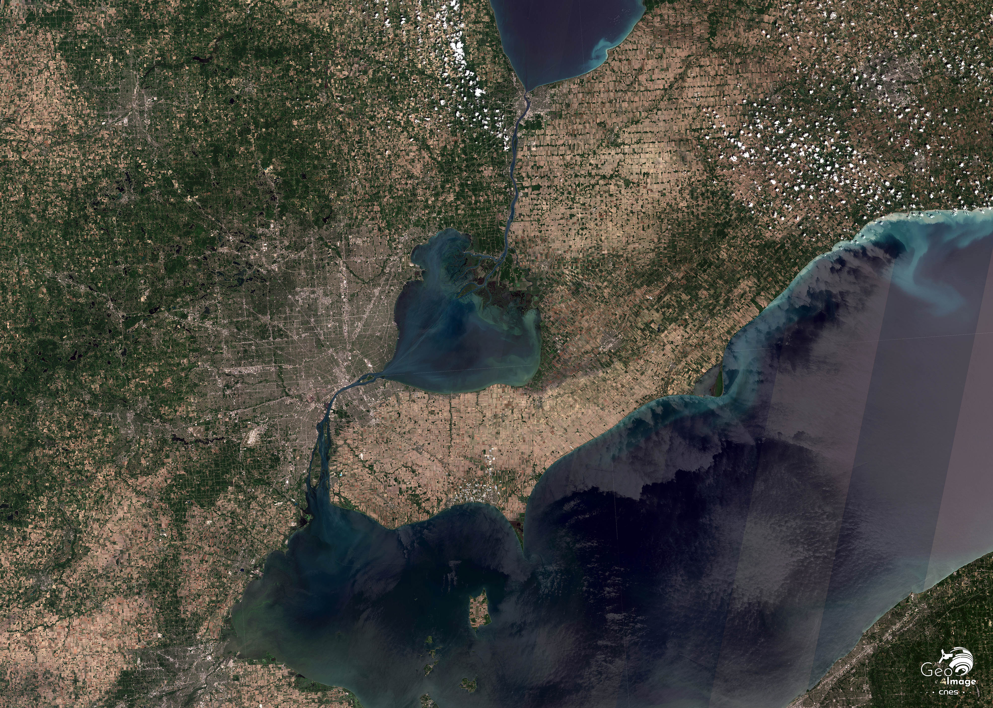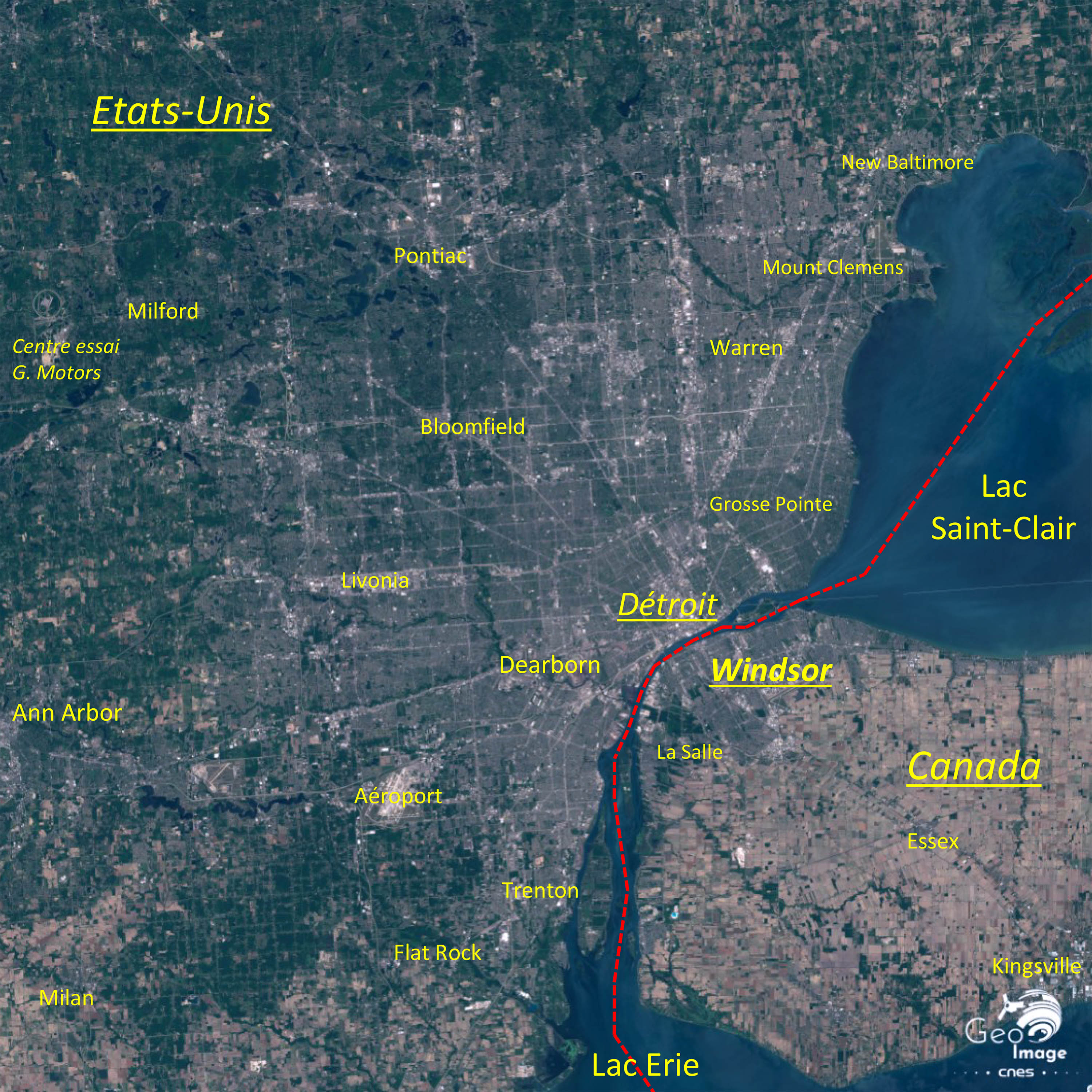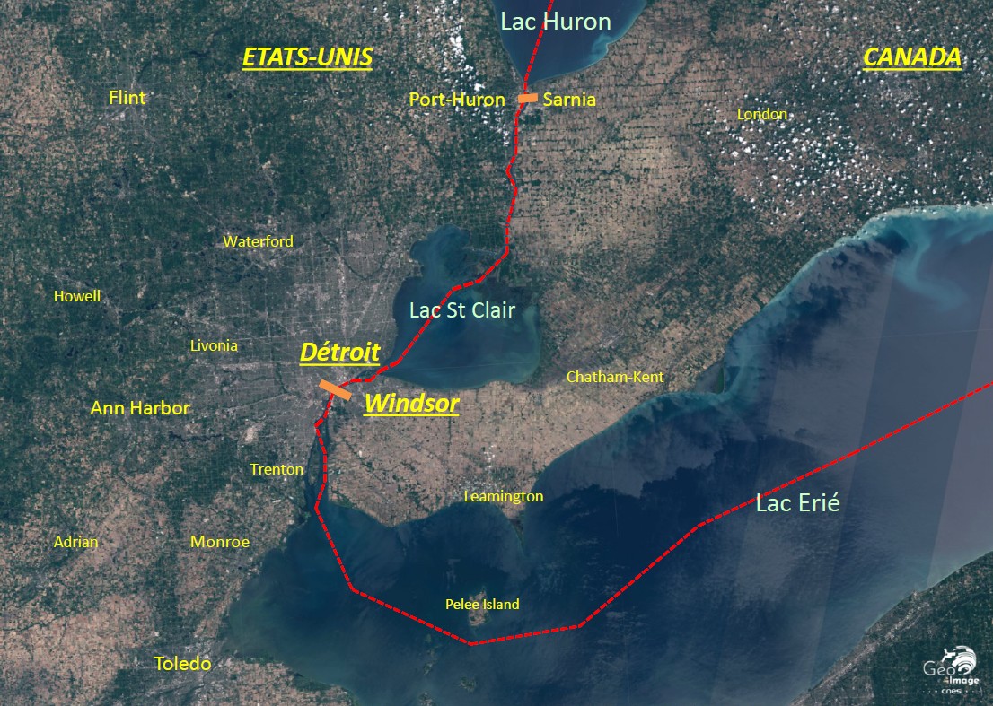 L’image générale couvre un ensemble de terres très planes, bordées au nord-est par le Lac Saint-Clair et au sud par le Lac Erie, reliés entre eux par la puissante Rivière Détroit. Nous sommes ici en Amérique du Nord, dans la région des Grands Lacs qui s’étend au Nord-Est entre les États-Unis et le Canada. Cette dyade frontalière est en tout point exceptionnelle à l’échelle du monde : sur 2200 km, c’est une frontière soit lacustre, soit fluviale ; de Grand Portage/ Thunder Bay à l’ouest à Cornwall sur le Saint-Laurent à l’est.