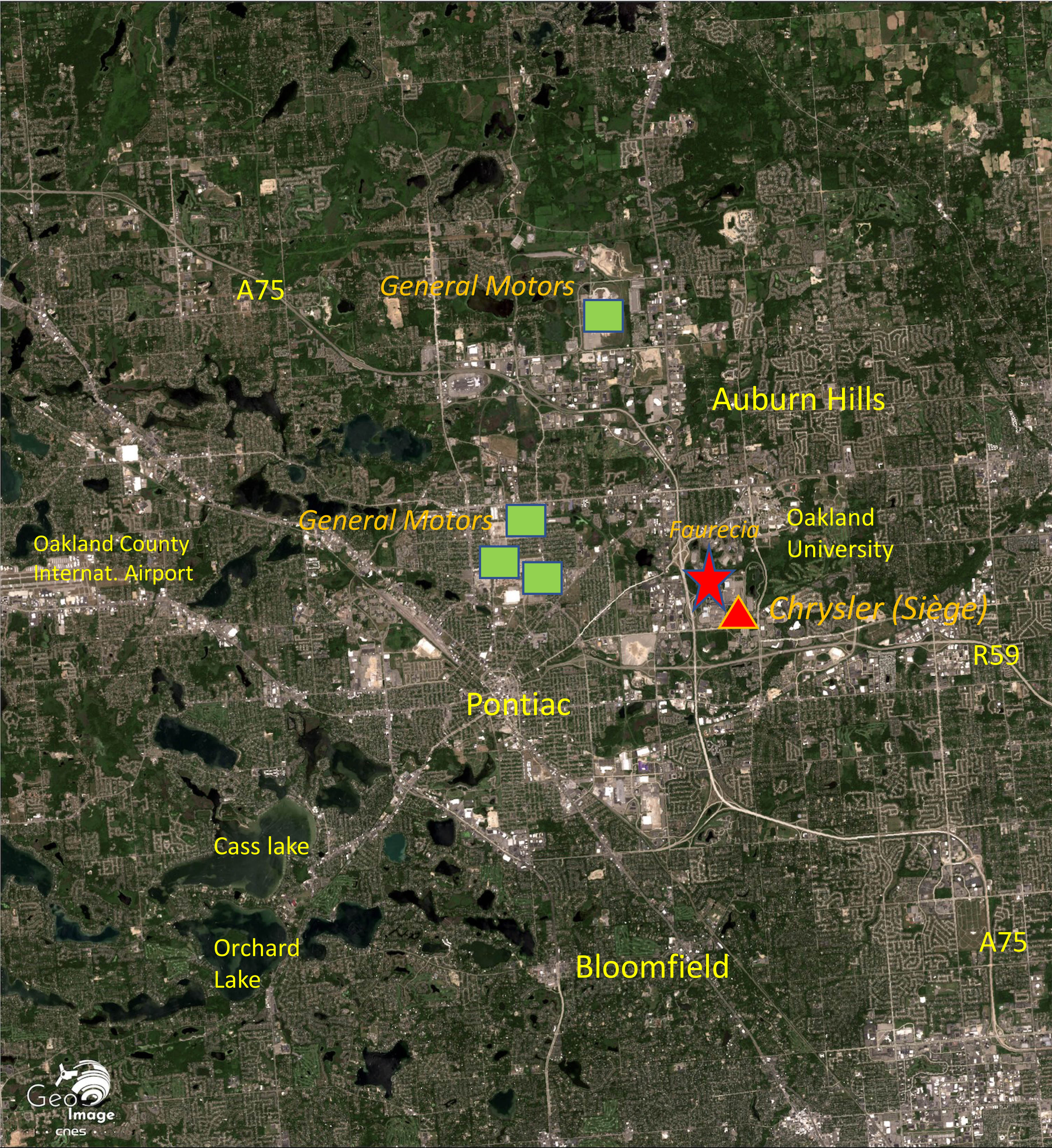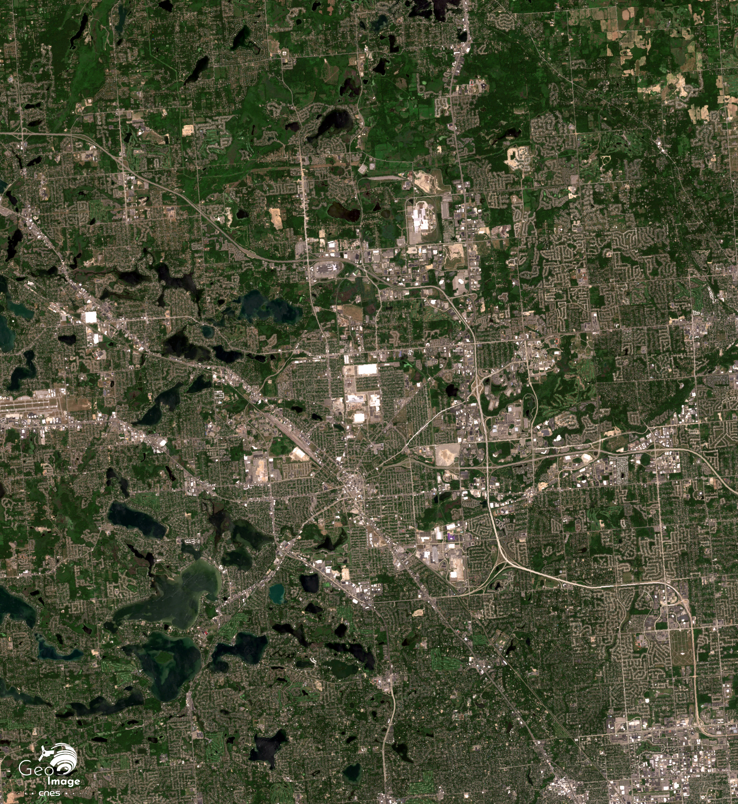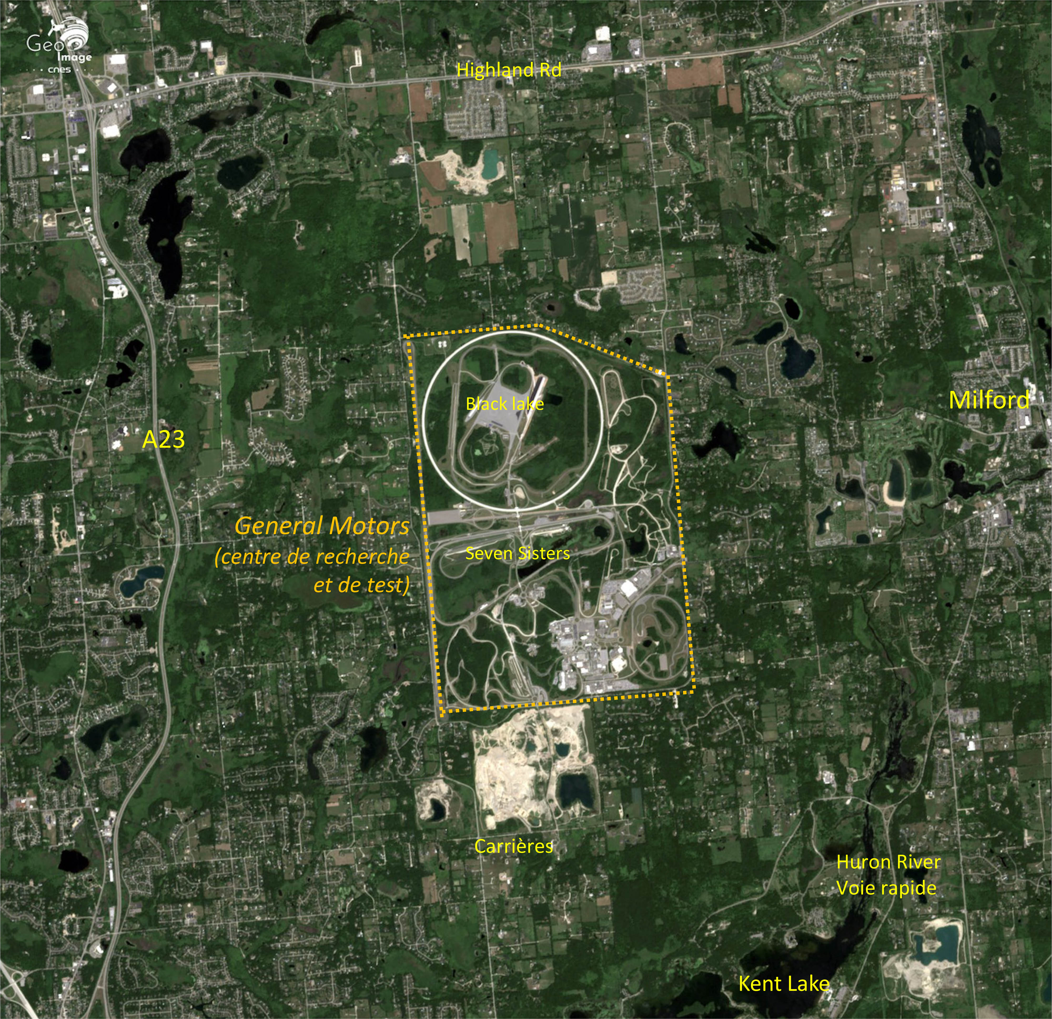 Nous sommes sur l’image à 45 km du centre de Détroit avec le pôle urbain constitué par Pontiac, ville qui donna son nom à une série automobile de renom, et Auburn Hills. La présence de nombreux lacs témoigne des importants héritages morphologiques glaciaires (lacs de surcreusement glaciaire quaternaire) dans cette région des Grands Lacs. Dans le comté d’Oakland, Auburn Hills et Pontiac constituent un important pôle automobile. On y trouve quatre sites de production de General Motors crées en 1924, 1926 et 1966.
