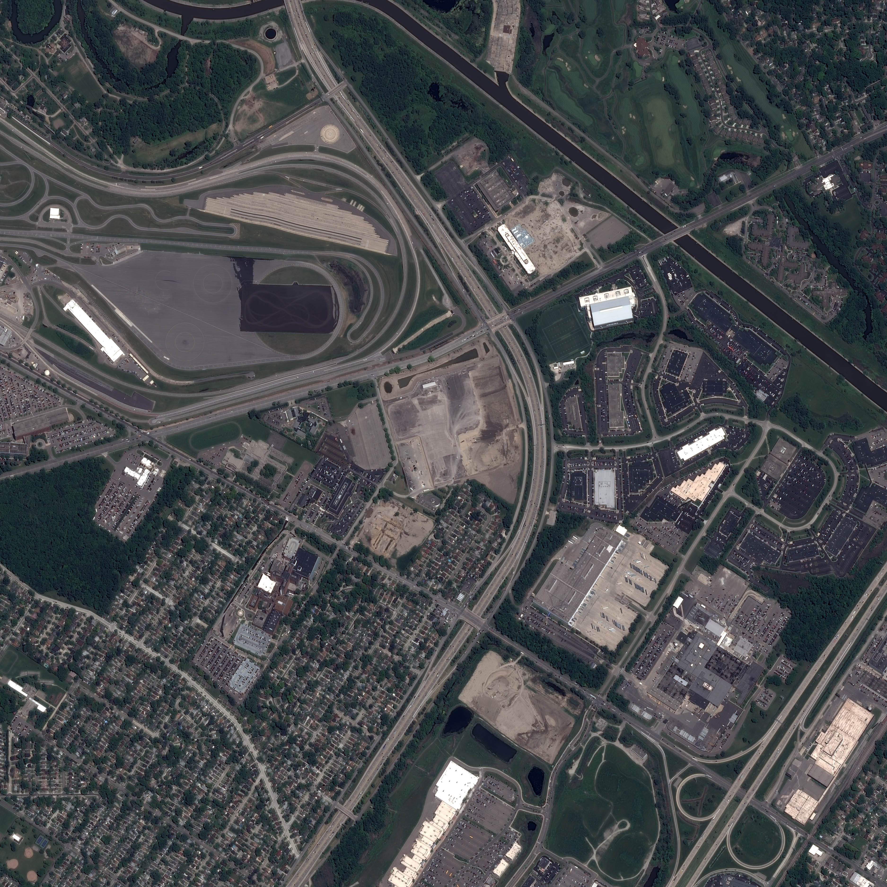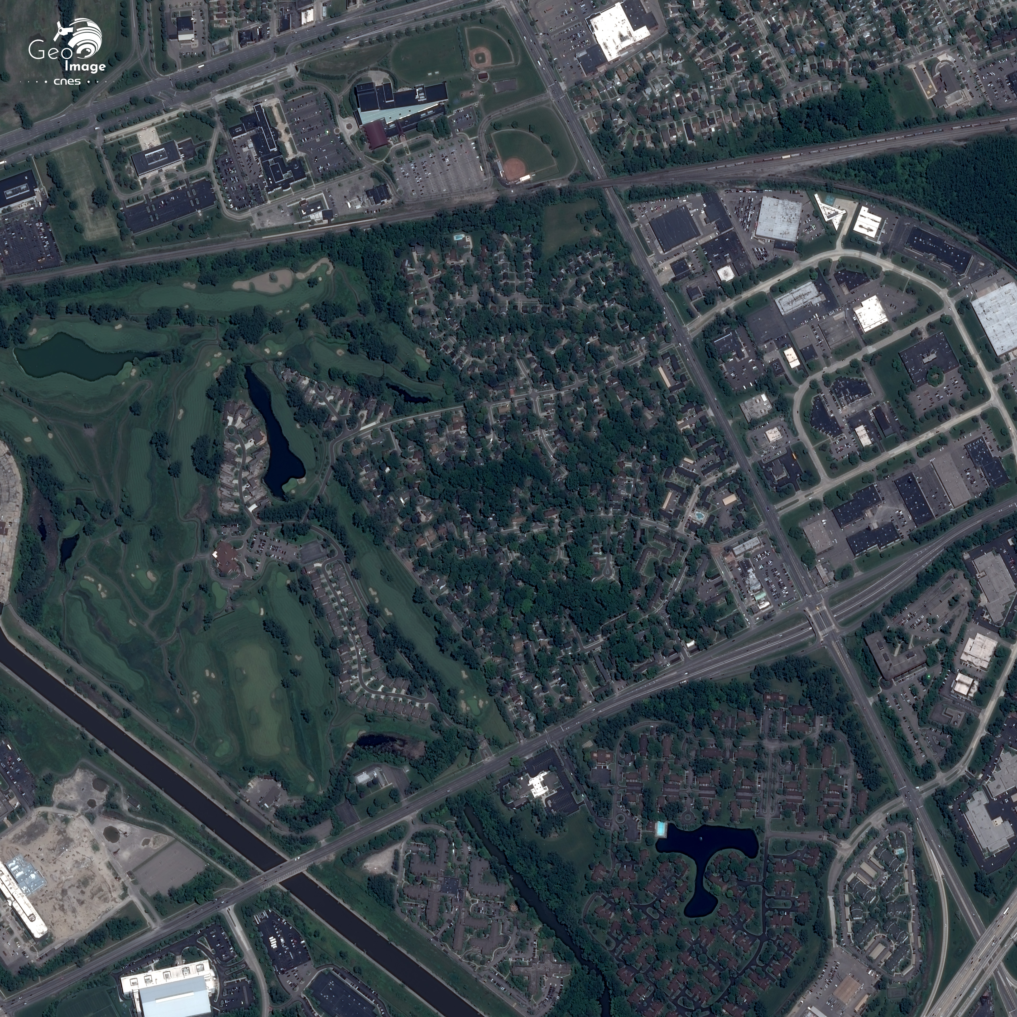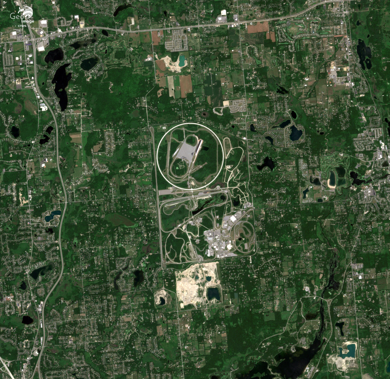 Nous sommes sur l’image à 45 km du centre de Détroit avec le pôle urbain constitué par Pontiac, ville qui donna son nom à une série automobile de renom, et Auburn Hills. La présence de nombreux lacs témoigne des importants héritages morphologiques glaciaires (lacs de surcreusement glaciaire quaternaire) dans cette région des Grands Lacs. Dans le comté d’Oakland, Auburn Hills et Pontiac constituent un important pôle automobile. On y trouve quatre sites de production de General Motors crées en 1924, 1926 et 1966.