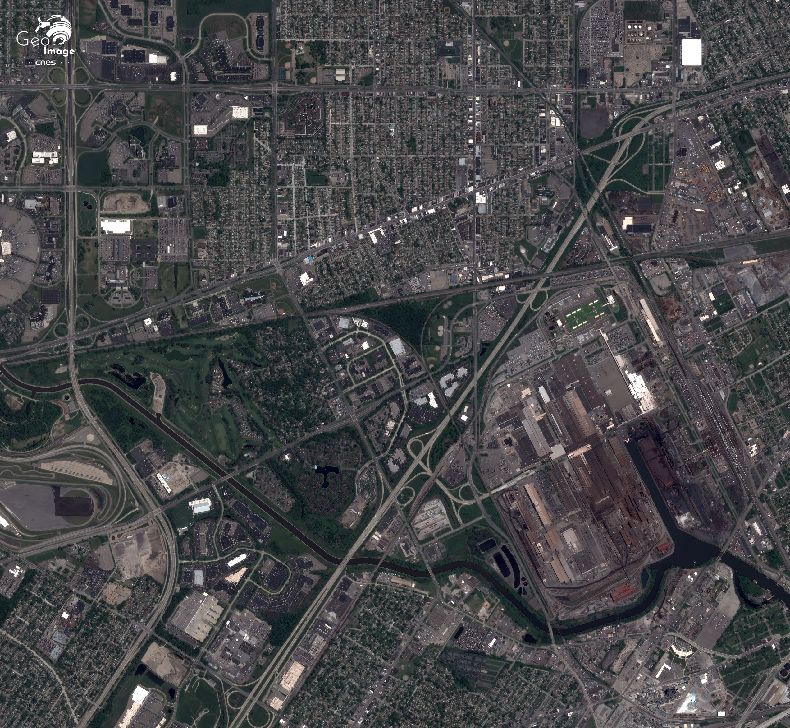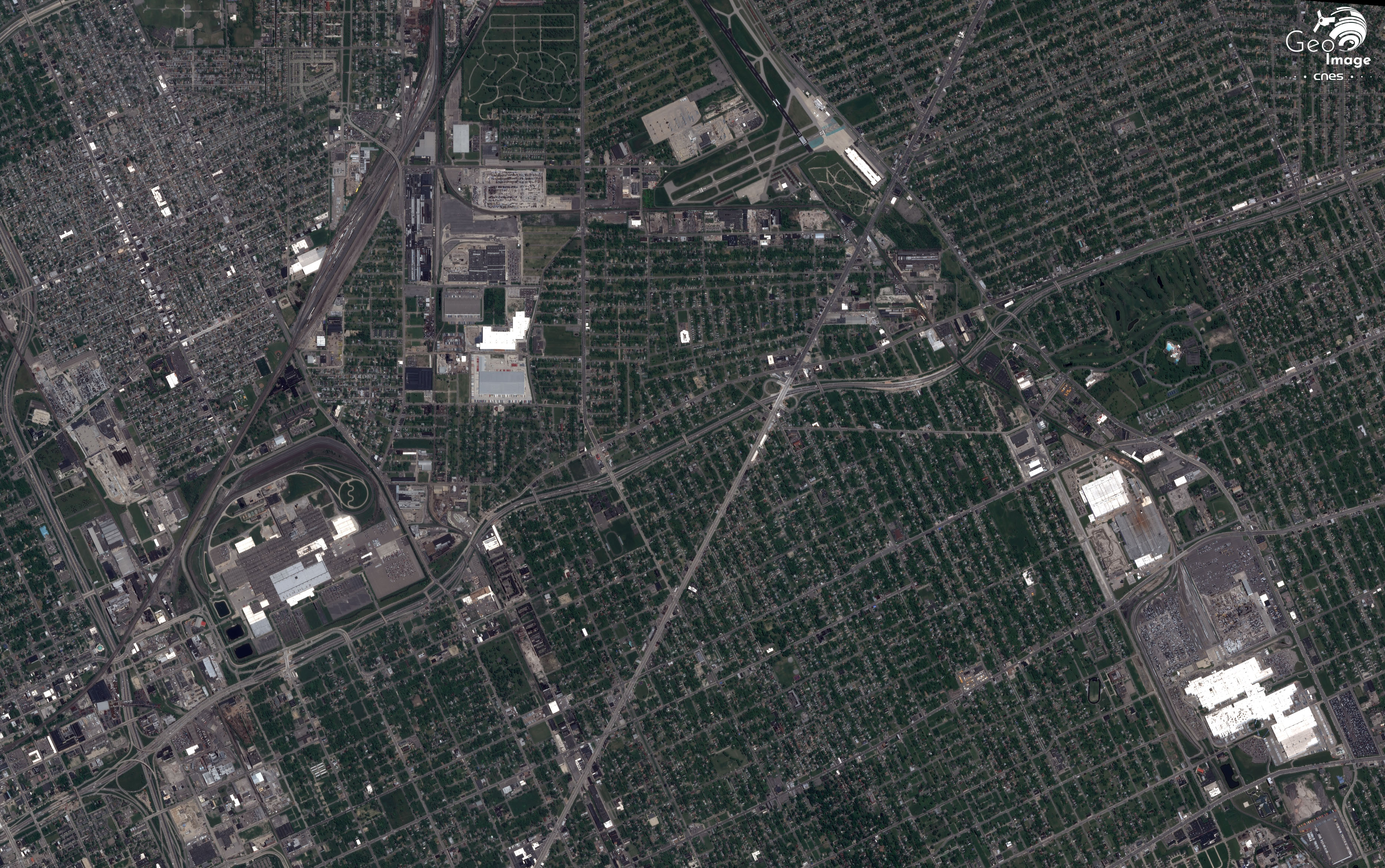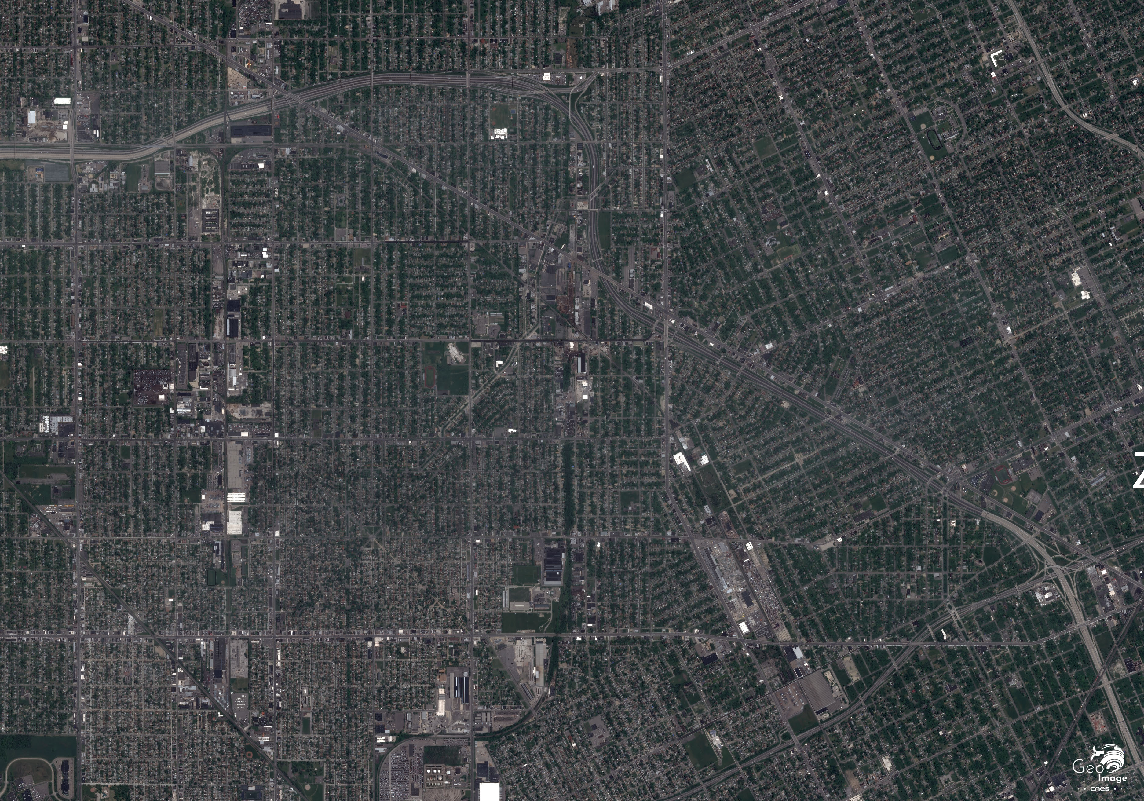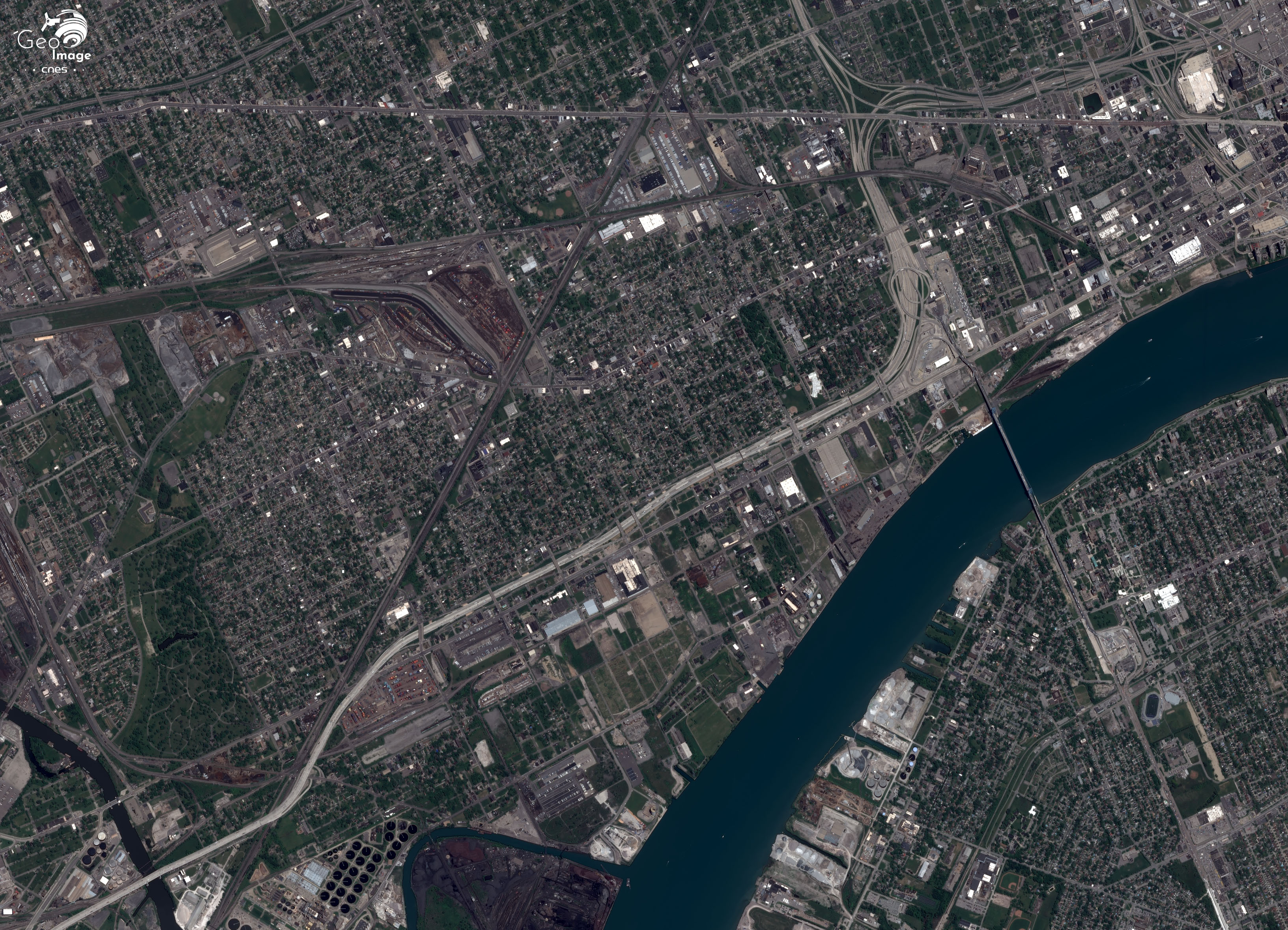 Cette image en haute définition prise par le satellite Pléiade couvre pour l’essentiel la commune de Détroit. Au nord-est se trouvent les minuscules enclaves des communes de Highland Park et d’Hamtramck, alors qu’au sud-ouest se trouvent les communes de Dearborn et River Rouge. Le dossier est complété par une image Sentinelle qui couvre l’aire métropolitaine de Détroit et son cadre régional afin de mobiliser les emboitements d’échelles pour mieux comprendre et analyser les différentes dynamiques territoriales.
