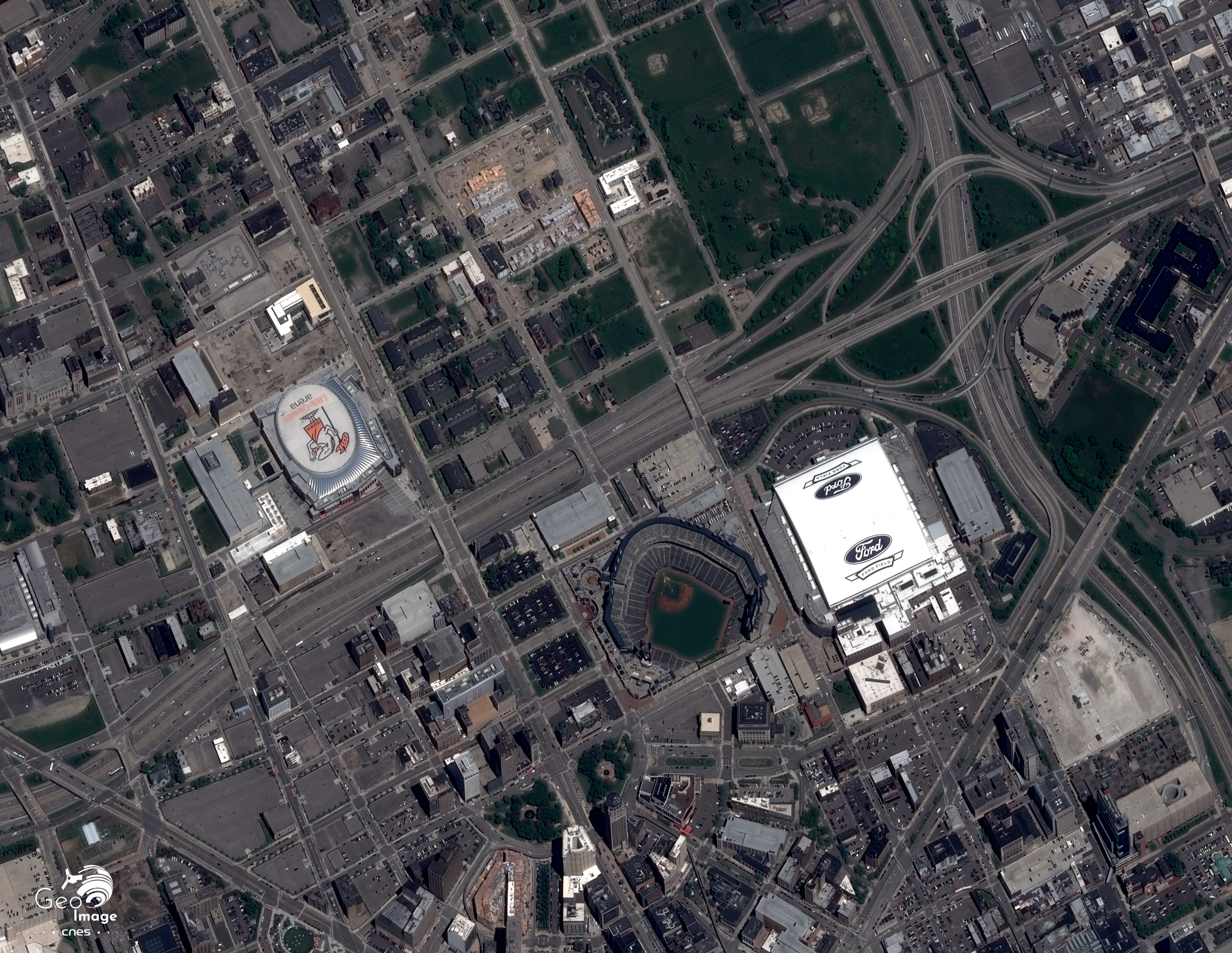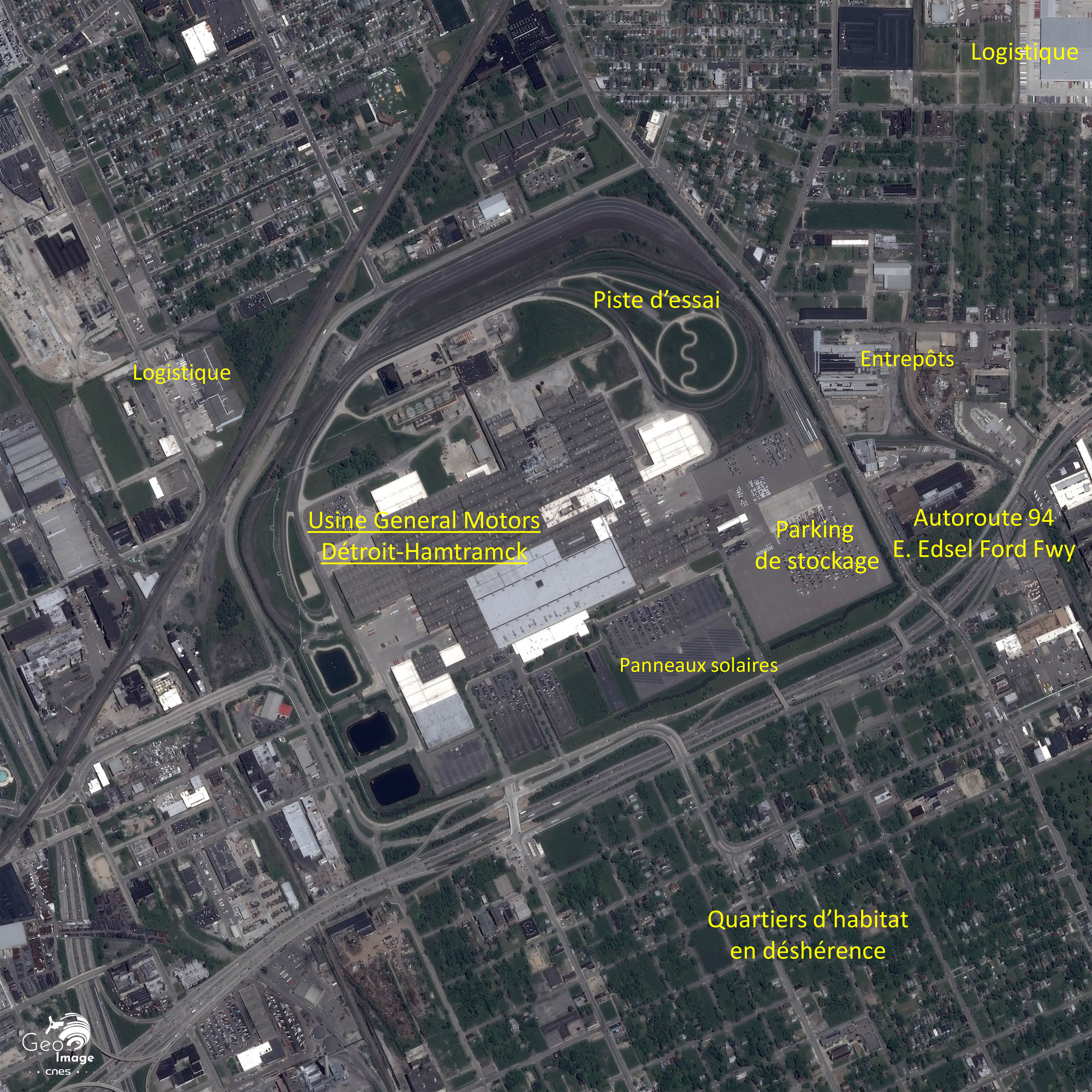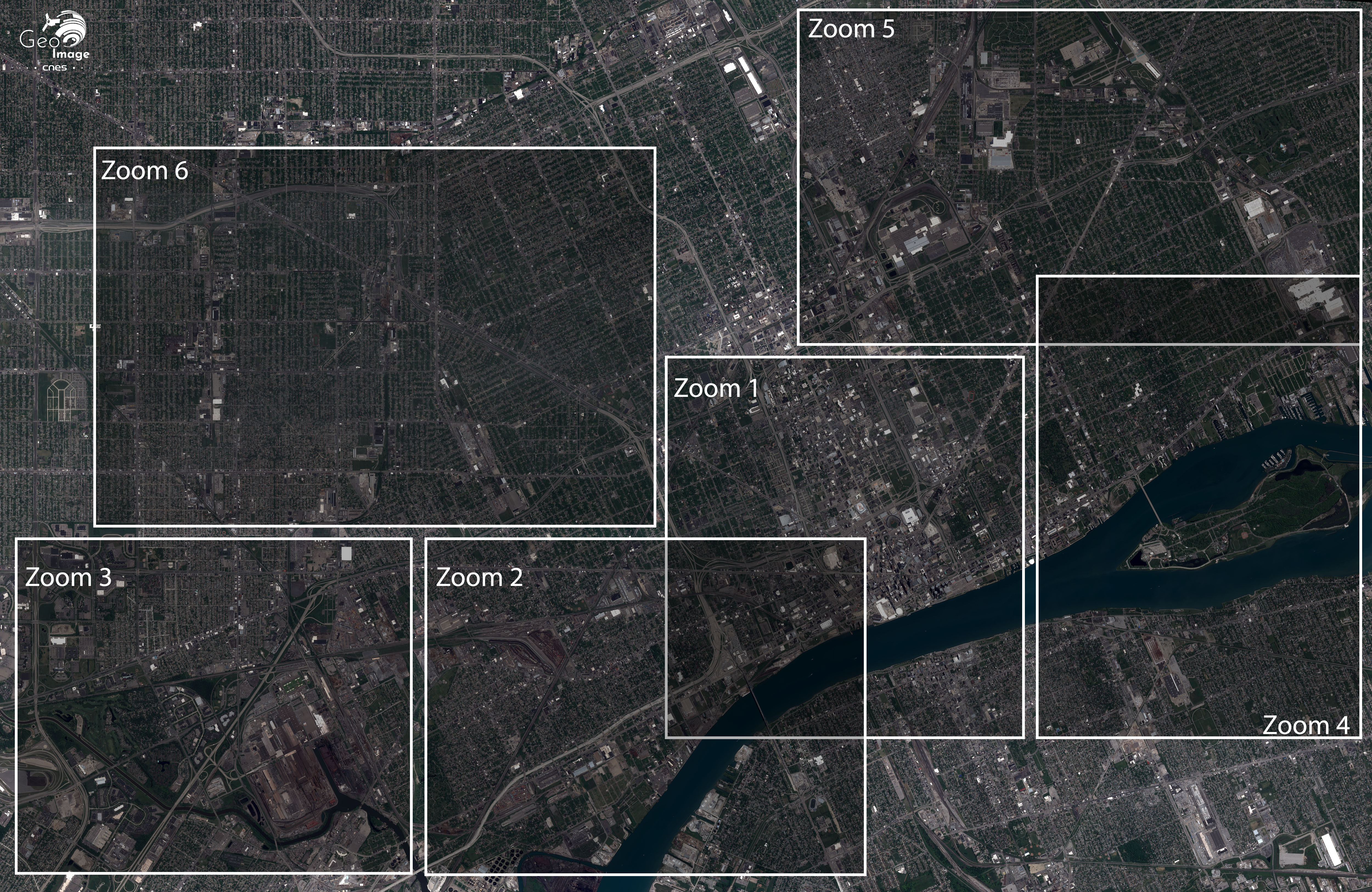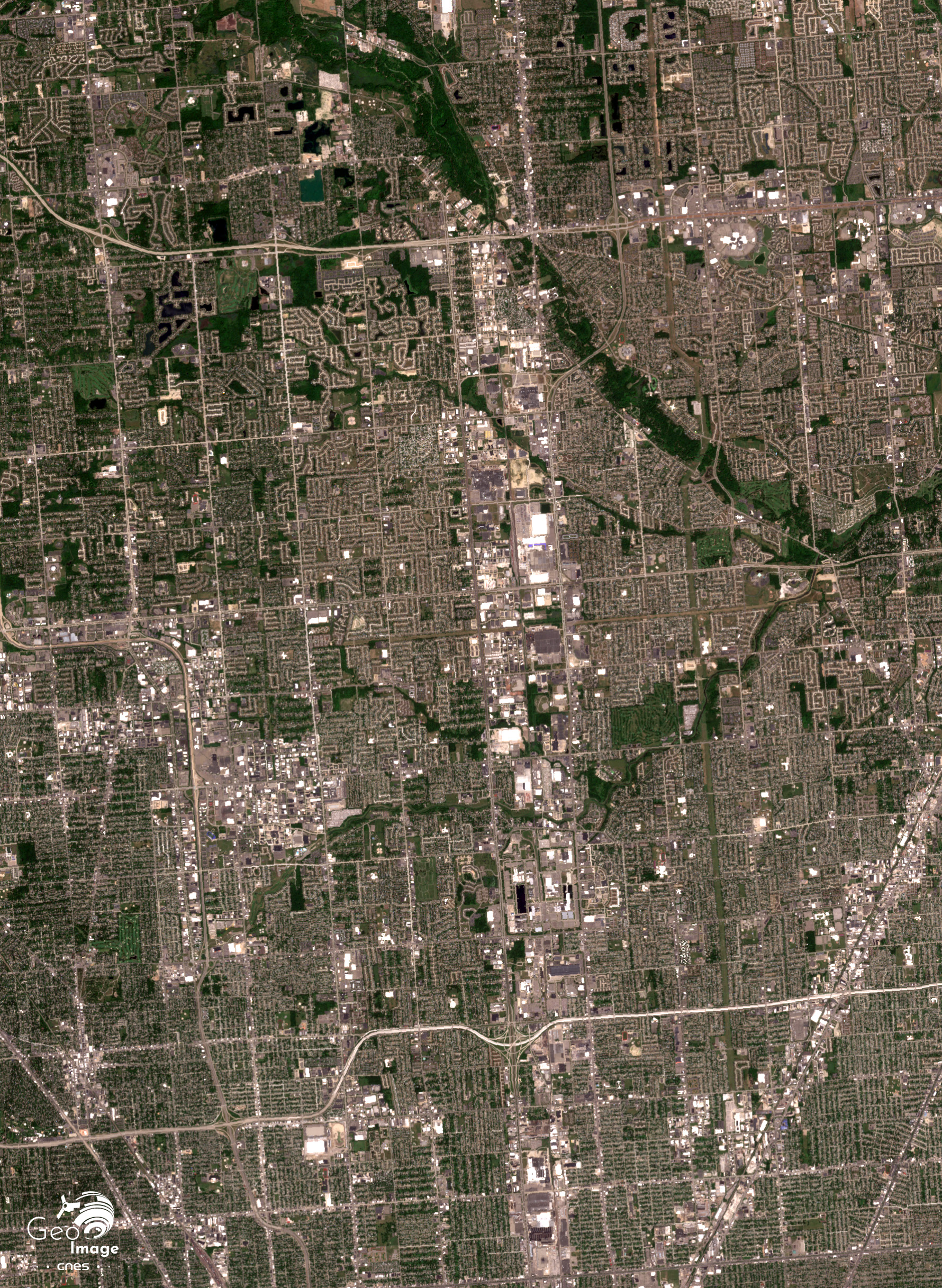 Cette image en haute définition prise par le satellite Pléiade couvre pour l’essentiel la commune de Détroit. Au nord-est se trouvent les minuscules enclaves des communes de Highland Park et d’Hamtramck, alors qu’au sud-ouest se trouvent les communes de Dearborn et River Rouge. Le dossier est complété par une image Sentinelle qui couvre l’aire métropolitaine de Détroit et son cadre régional afin de mobiliser les emboitements d’échelles pour mieux comprendre et analyser les différentes dynamiques territoriales.