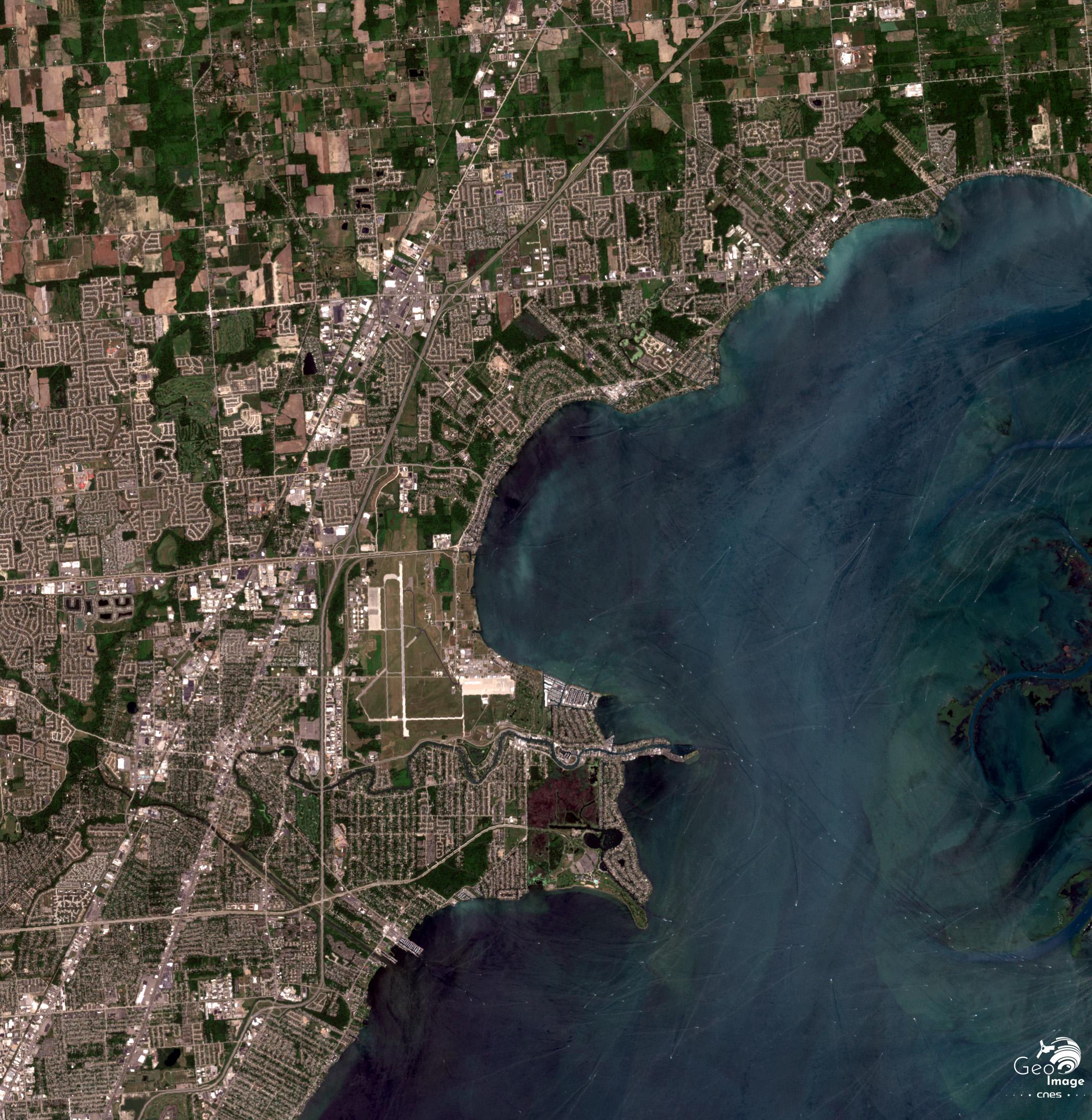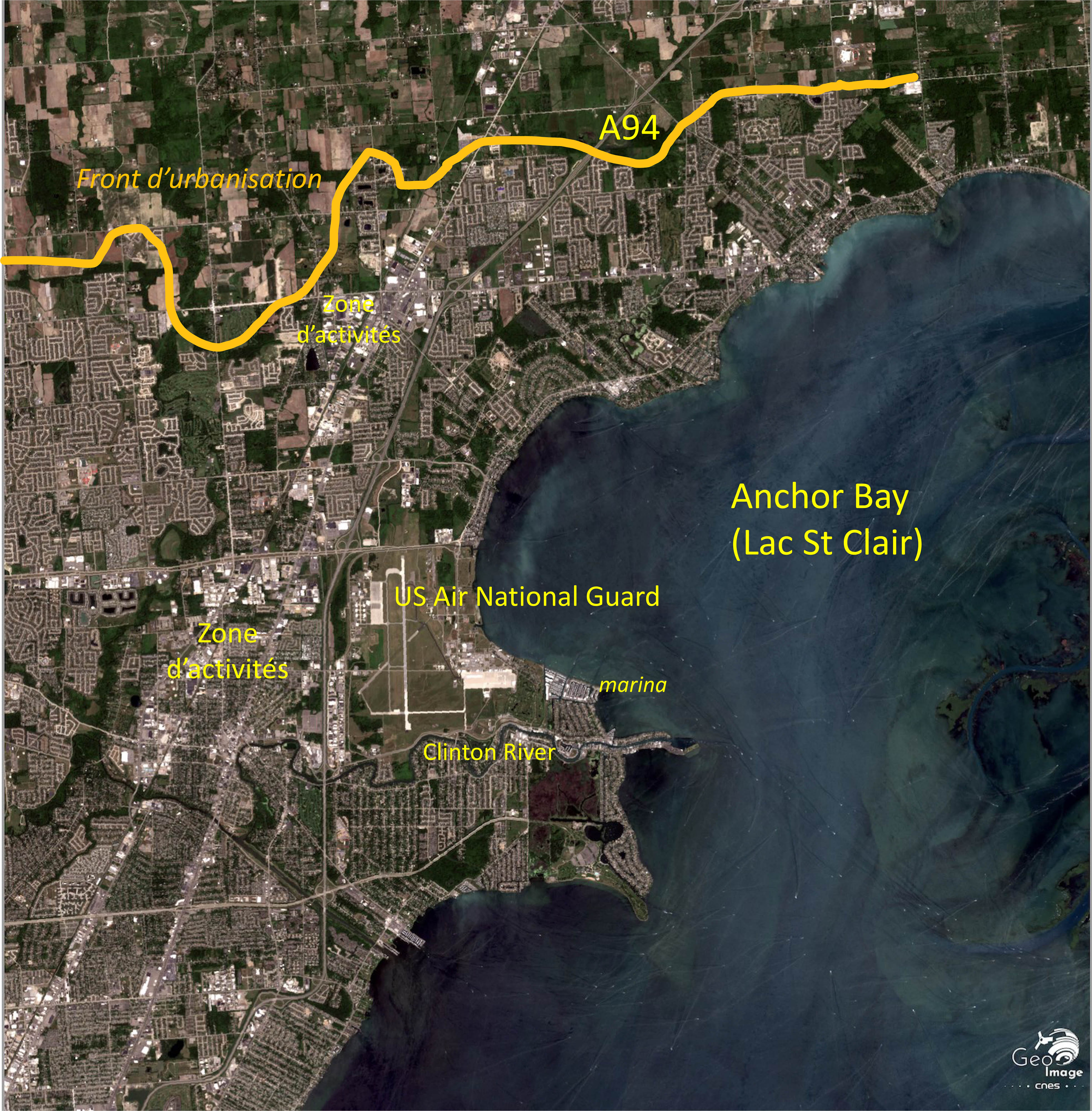 Cette image couvre le nord-est de l’agglomération de Détroit, qui s’étend le long du Lac St Clair traversé par la Detroit River, et la commune de Mount Clemens. Nous sommes ici sur les rives de l’Anchor Bay. La présence d’un aéroport militaire de l’US Air National Guard vient nous rappeler l’importance de la Garde nationale aux États-Unis et le fait que nous sommes dans une région frontalière avec le Canada. De la marina partent de nombreux esquifs à voile ou à moteurs, qui apparaissent comme une multitude de petits points blancs sur le lac.