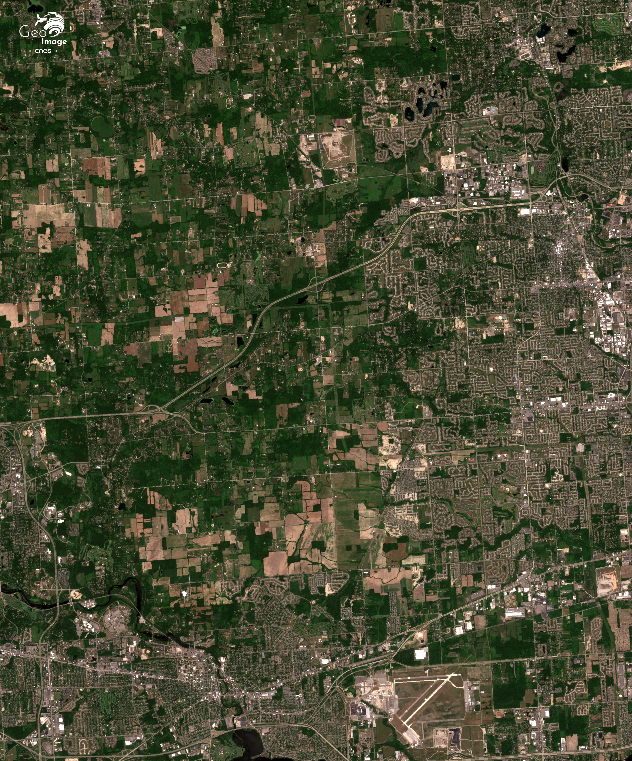 Cette image couvre un espace qui se trouve entre 30 et 40 km à l’ouest de Détroit. Au sud se trouve un axe majeur rejoignant Détroit à Ann Harbor, un important pôle urbain régional, capitale du comté de Wastesnaw, via Ypsilanti. La région accueille deux usines du groupe General Motors, une à Ypsilanti créé en 2008 près de l’aérodrome, l’autre à Belleville, créé en 1971, plus au sud-est (hors image).