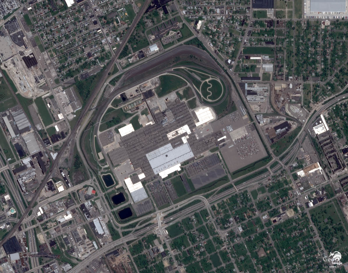 En dehors du siège social de General Motors dans le CBD, Détroit n’accueille plus que trois grandes usines automobiles sur son territoire. A l’est de l’image se trouvent les deux grandes usines de Chrysler/Stellantis : celle de Mack Avenue, ouverte en 1953, et qui emploie 4500 salariés ; celle de Jefferson North, ouverte en 1991, qui emploie 5000 salariés. Les images détaillées soulignent la taille considérable de ces usines et l’importance des productions d’automobiles qui y sont réalisées.