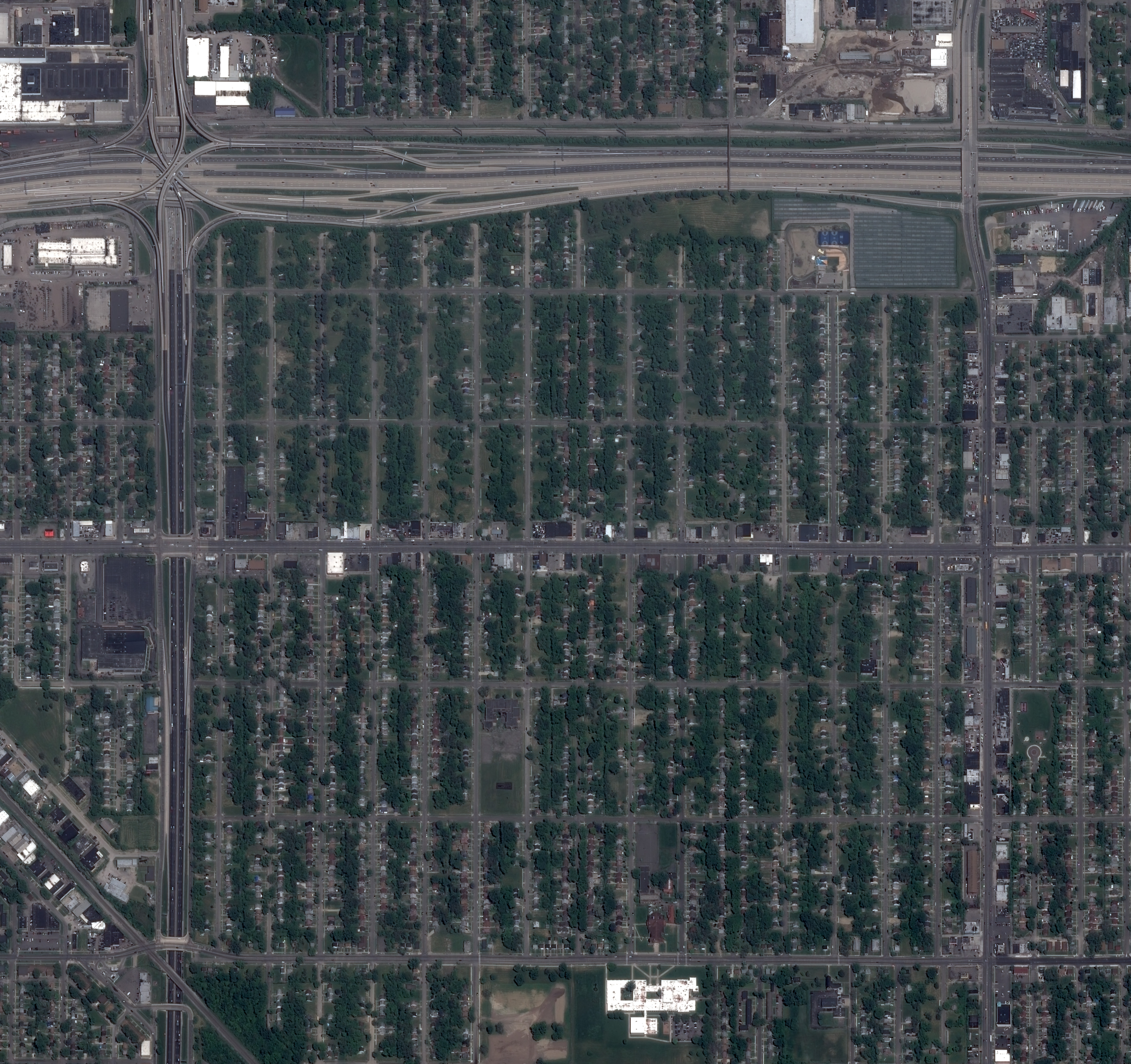 En dehors des zones d’activités ou logistiques polarisées par les grands axes autoroutiers, comme l’A75, ou ferroviaires, l’image témoigne de la profonde crise de l’espace urbain de Détroit. Les quartiers de Potetown East ou ceux traversés par la Gratiot Avenue présentent de nombreuses parcelles inoccupées ou sous-occupées du fait des opérations massives de destruction des maisons et pavillons abandonnées. Ce verdissement des images traduit la reconquête par la végétation des espaces libres. Il s’agit parfois d’îlots complets.