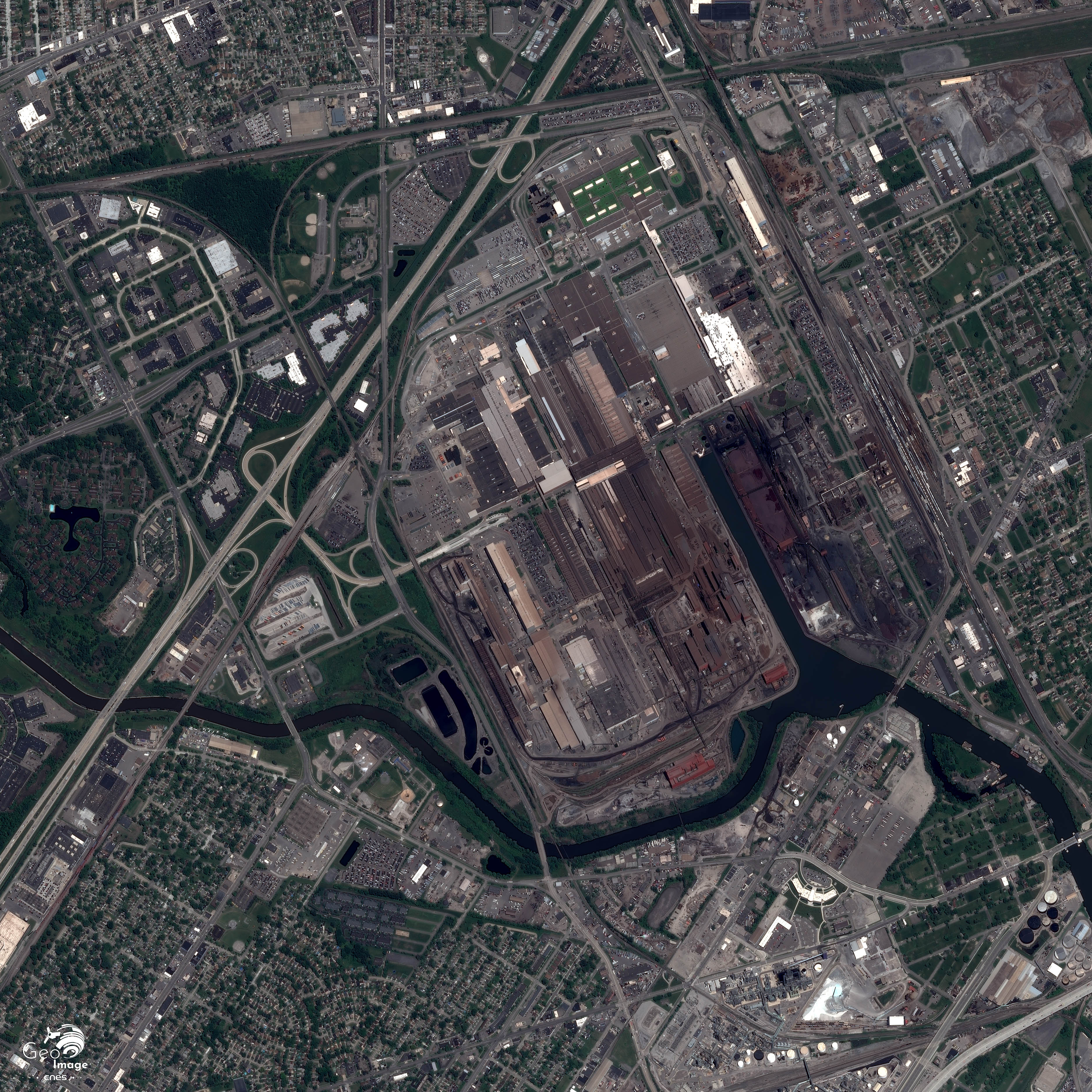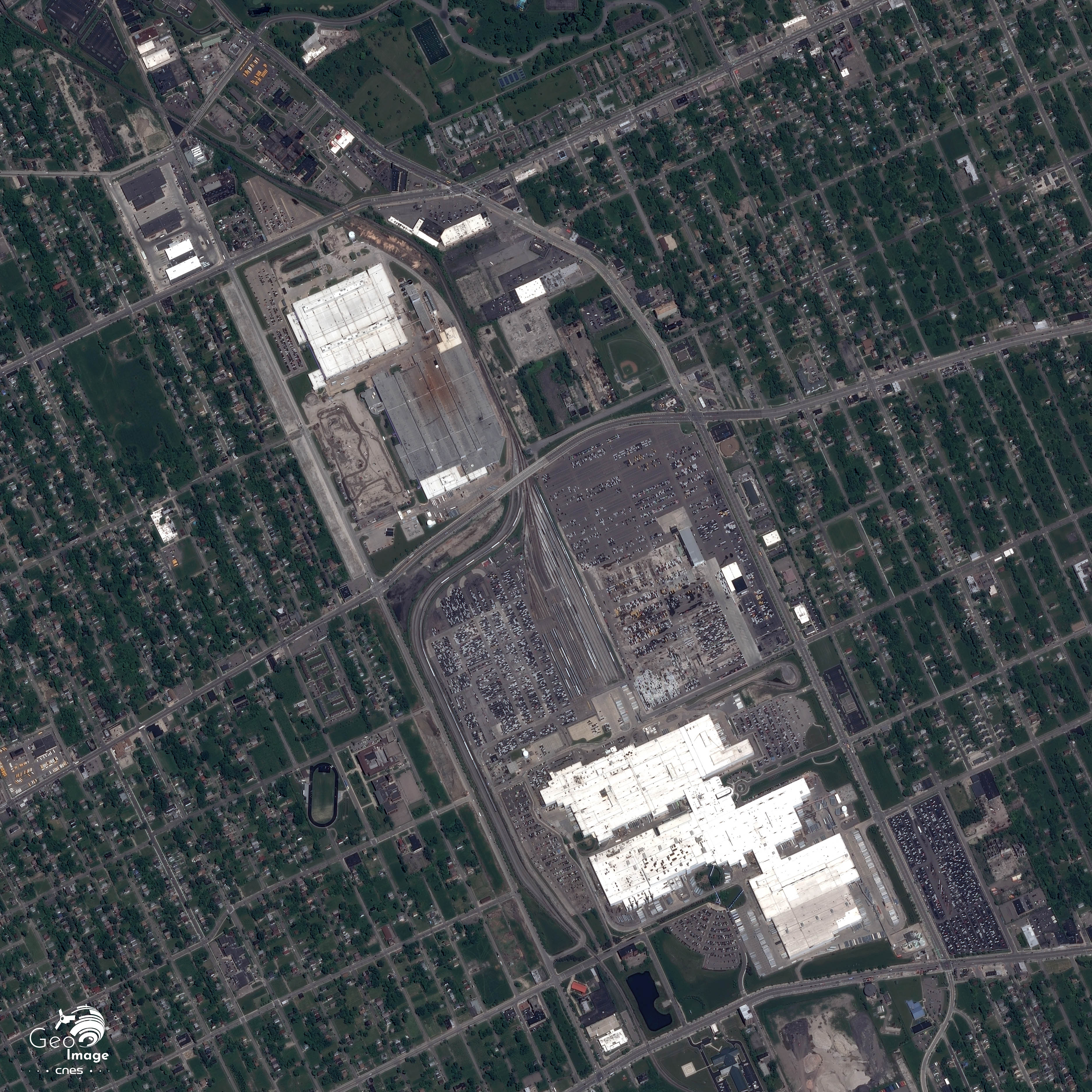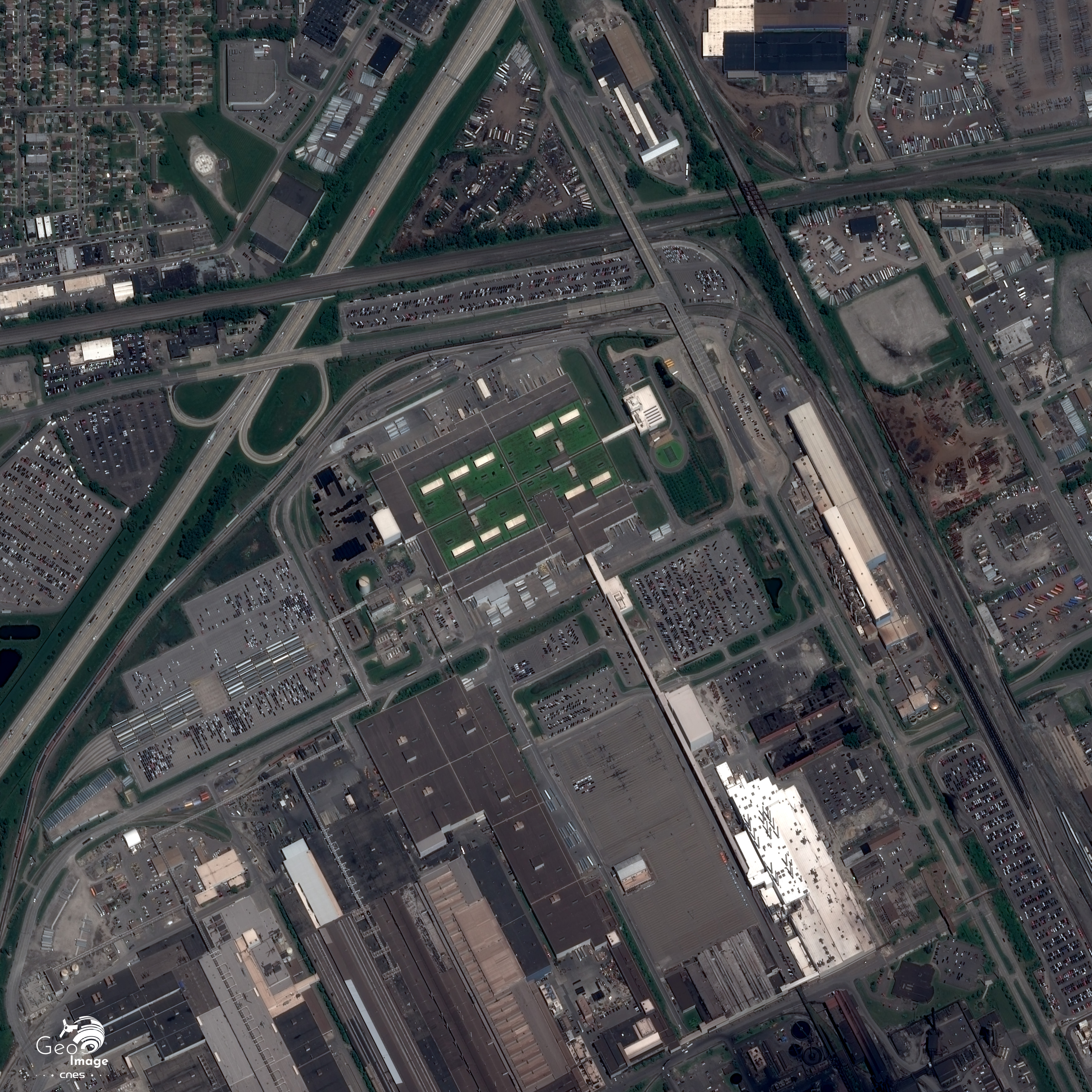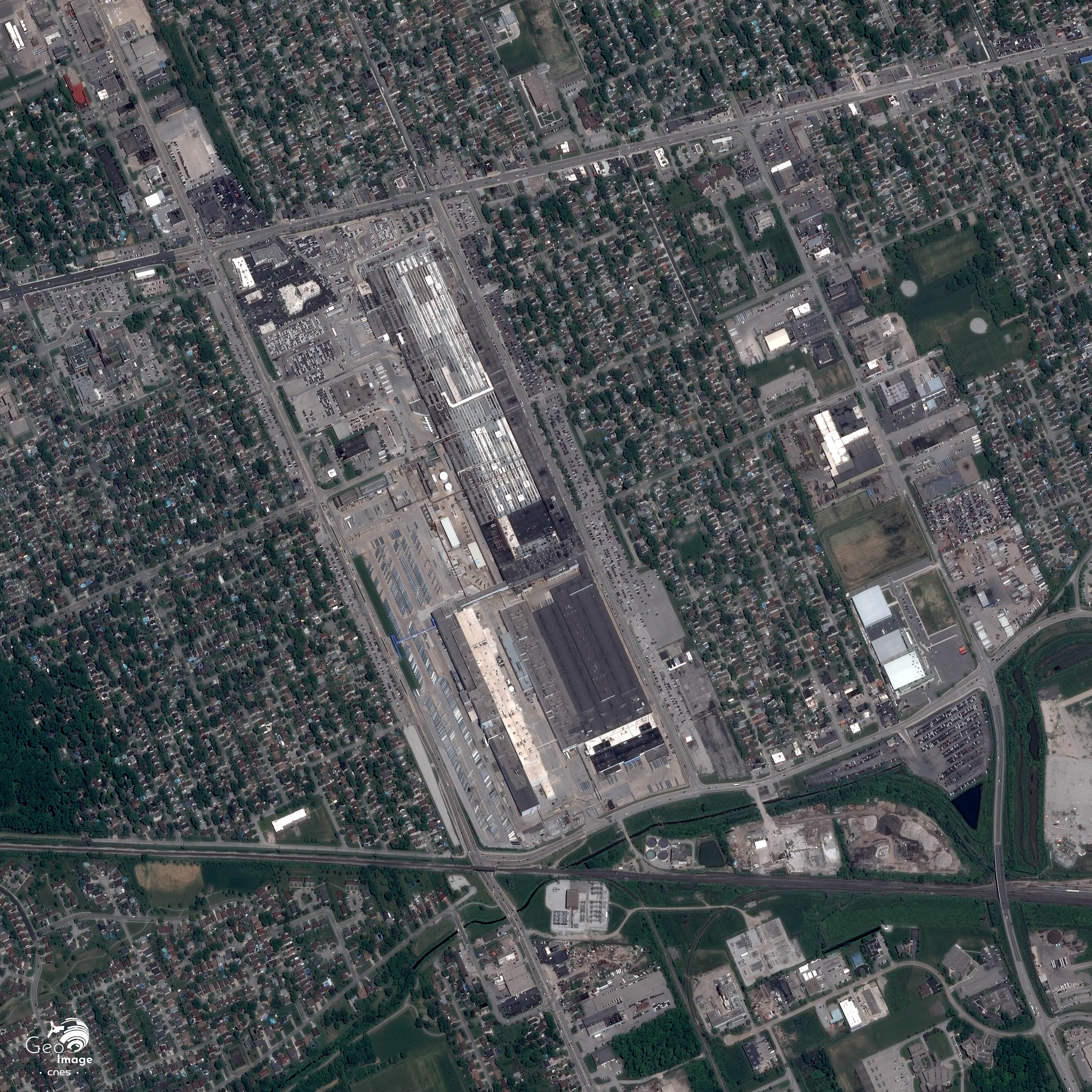 La première image couvre l’usine Ford d’East Windsor. Ouverte en 1923, c’est l’un des plus anciennes usines Ford ouverte à l’étranger dans le cadre de la mondialisation du groupe automobile. Cette usine de montage compte 650 salariés. Couvrant 149 acres, elle s’étend toute en longueur autour de deux ensembles, nord et sud, séparés par une importante voie ferrée. La partie nord, couverte de poussière brune, semble sous-employée avec un vaste terrain jointif qui ressemble à une vaste friche industrielle. Par contre la partie sud apparait plus récente, bien entretenue et en activité.