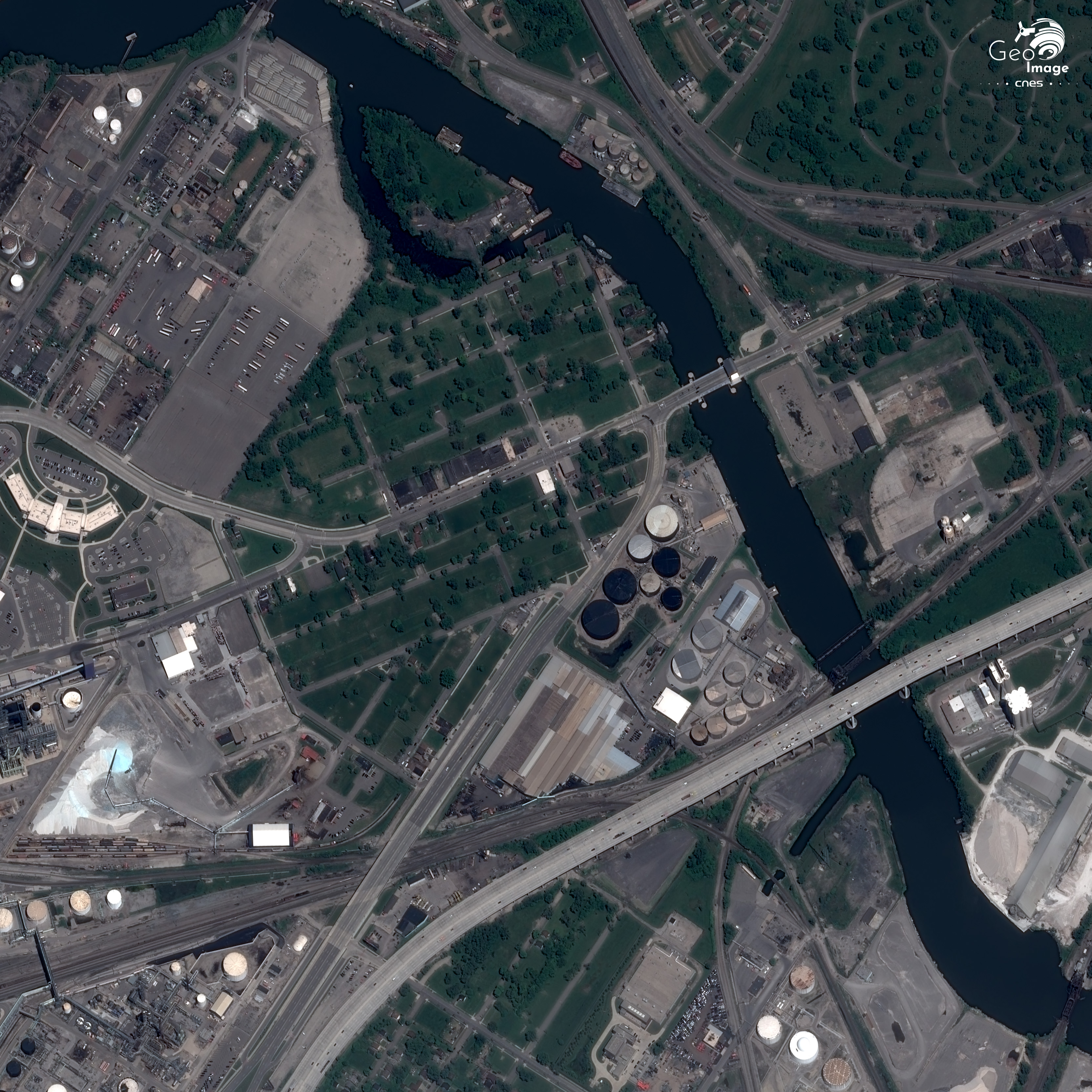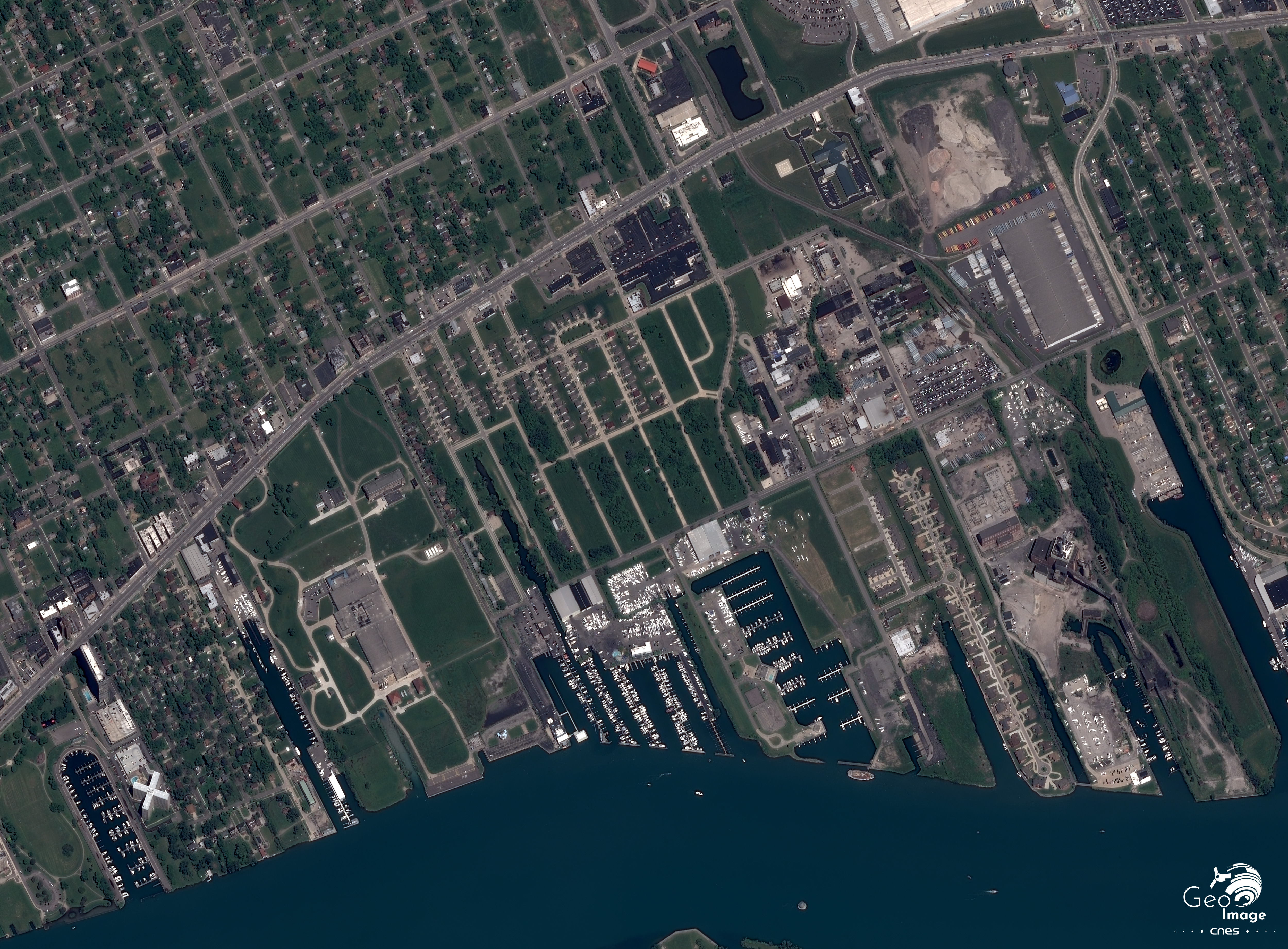 L’image est traversée par la puissante Rivière Détroit qui sert de frontière entre le Canada et les États-Unis. Nous sommes ici dans la région des Grands Lacs, entre le petit Lac Sainte-Claire (1.114 km2), le Lac Érié (25.700 km2). Les Grands Lacs constitue une véritable mer intérieure de 244 000 km2, presque la surface du Royaume-Uni, qui est navigable par des navires importants.