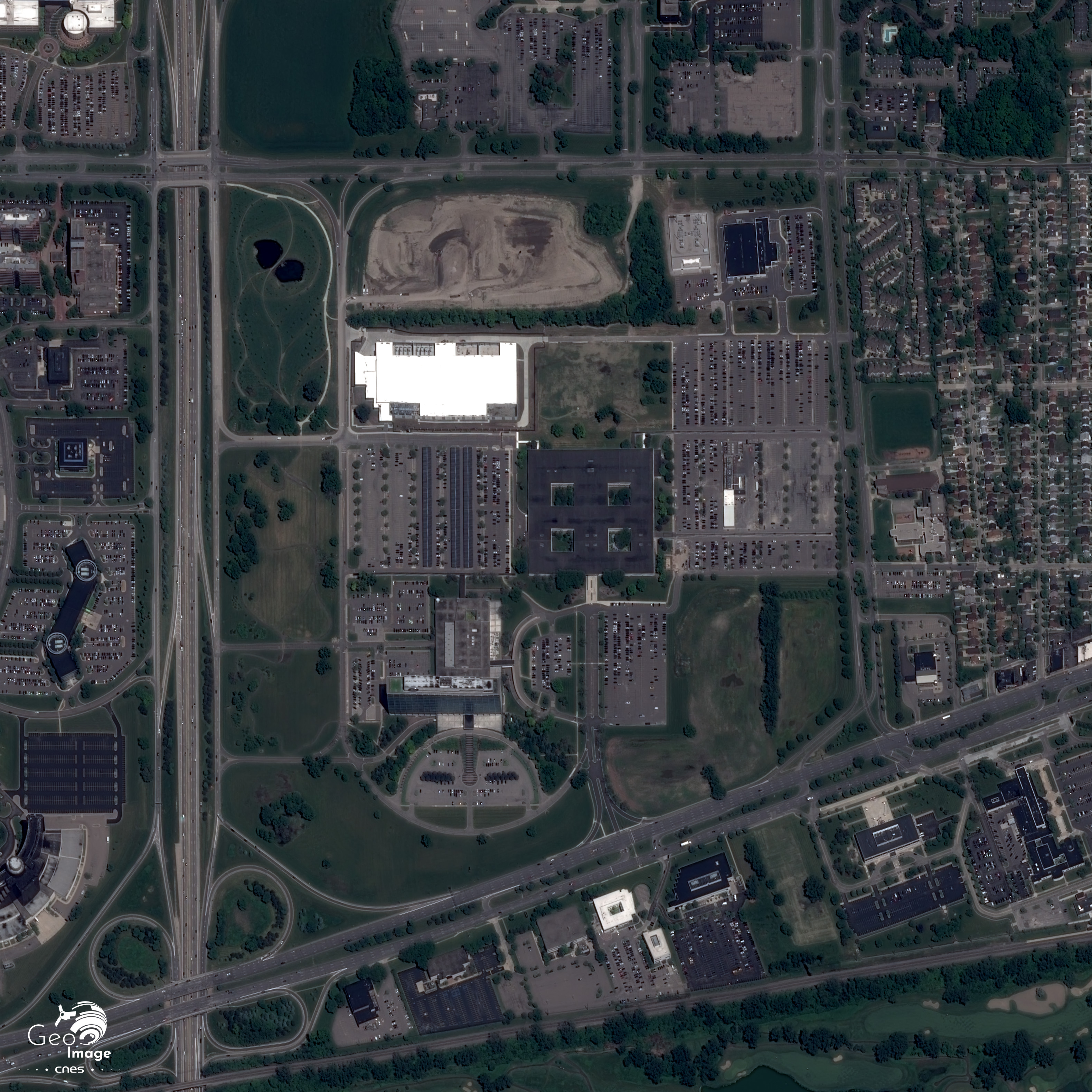Explosion des banlieues et nouveaux pôles périphériques. Les deux images Pléiade et Sentinelle témoignent des effets de l’étalement progressif de la ville qui se traduit par un étalement très large dans d’immenses banlieues, les sub-urbs. Ce processus a débouché sur la création en banlieues de pôles urbains secondaires plus ou moins proches du centre et qui vont progressivement prendre de plus en plus d’importance au plan démographique, économique et industriel : Dearborn à 10 km, Warren à 20 km, Sterling Heights à 26 km, Livonia à 25 km, aéroport à 26 km, Auburn Hills à 43 km, Milford à 60 km...