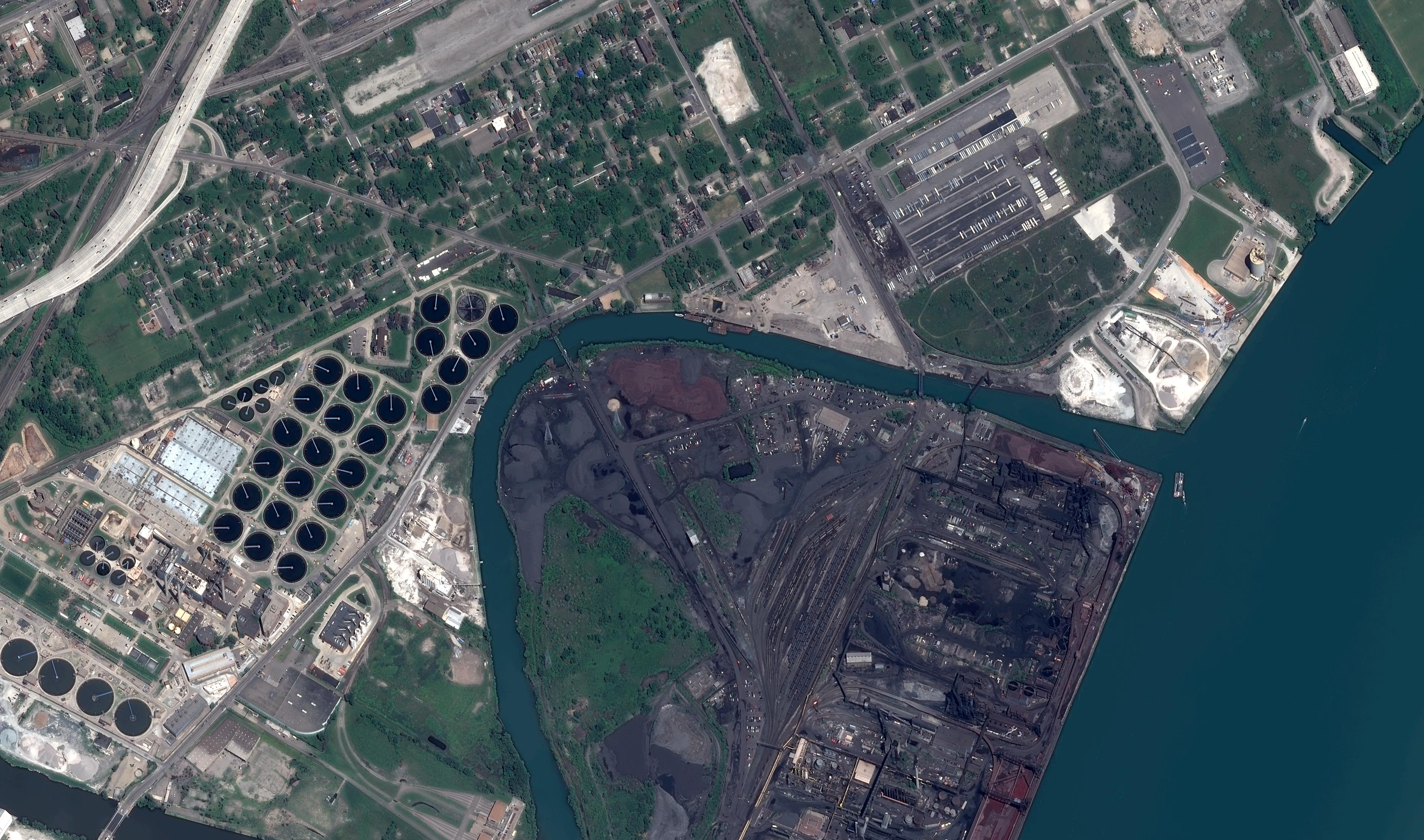 Ces images couvrent le front fluvial à l’aval du CBD. Côté canadien comme côté étasunien, les rives de la River Detroit accueillent d’importantes fonctions productives : usines (plastiques, traitement des eaux...), zones de dépôts (énergie, granulats pour le bâtiment...), entrepôts logistiques... Cet espace industrialo-portuaire, relativement répulsif, est séparé du reste de la ville par de grands axes, telle l’A75.
