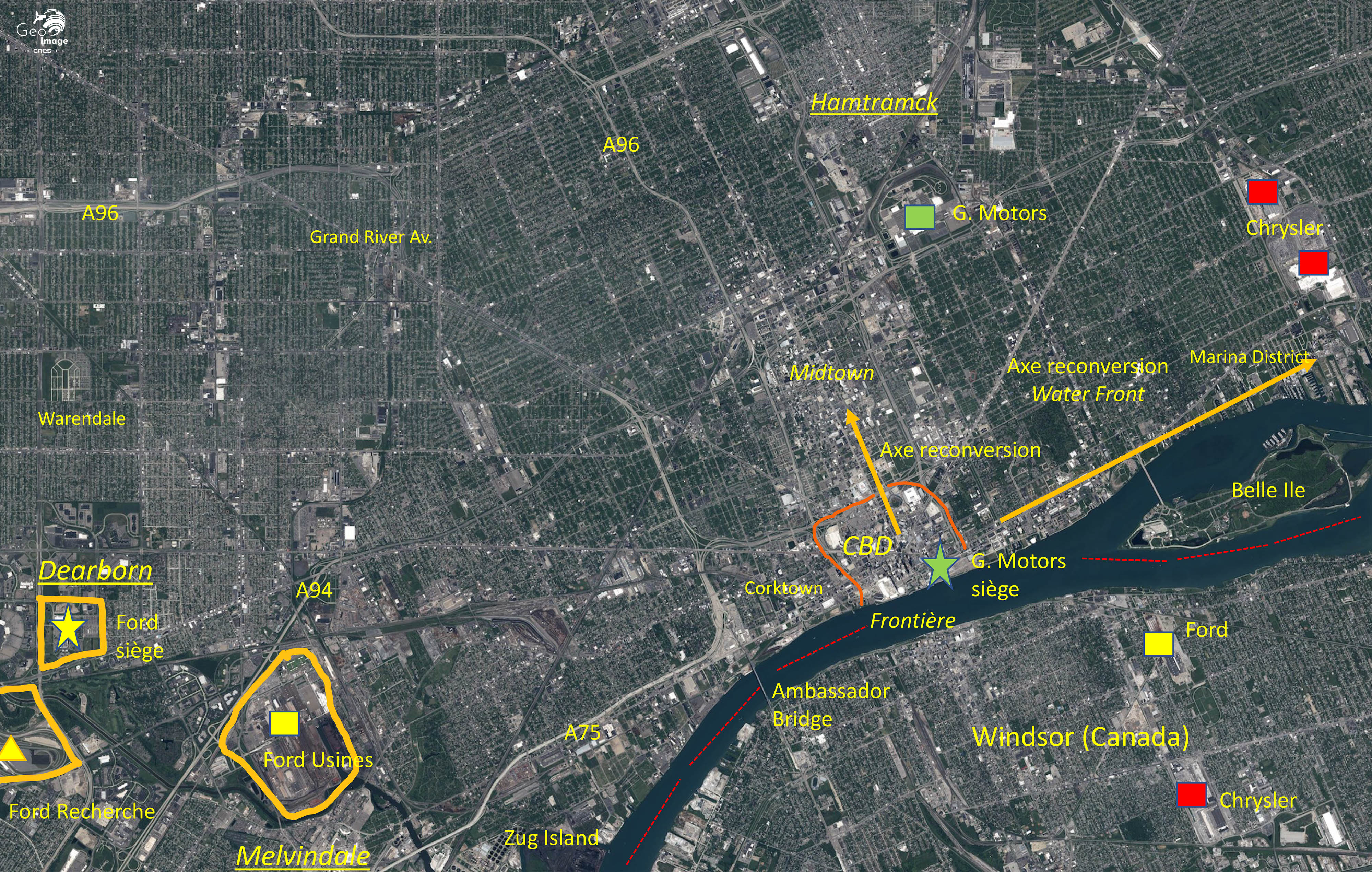 La ville-centre de Détroit s’est progressivement vidée de sa substance du fait de la multiplication des fermetures ou départ de sites et des suppressions massives d’emplois : elle ne compte plus que 17 500 salariés, soit 15 % des emplois régionaux. On y trouve le siège social de General Motors le long de la Detroit River et deux importantes usines de montage de Chrysler, alors que l’avenir de l’immense site d’Hamtramck demeure très incertain (reconversion vers l’électrique ?). Cette rétraction spatiale de l’appareil productif de toute la filière a produit de très nombreuses friches industrielles, bien visibles sur les images, et dont la reconversion est des plus problématique.