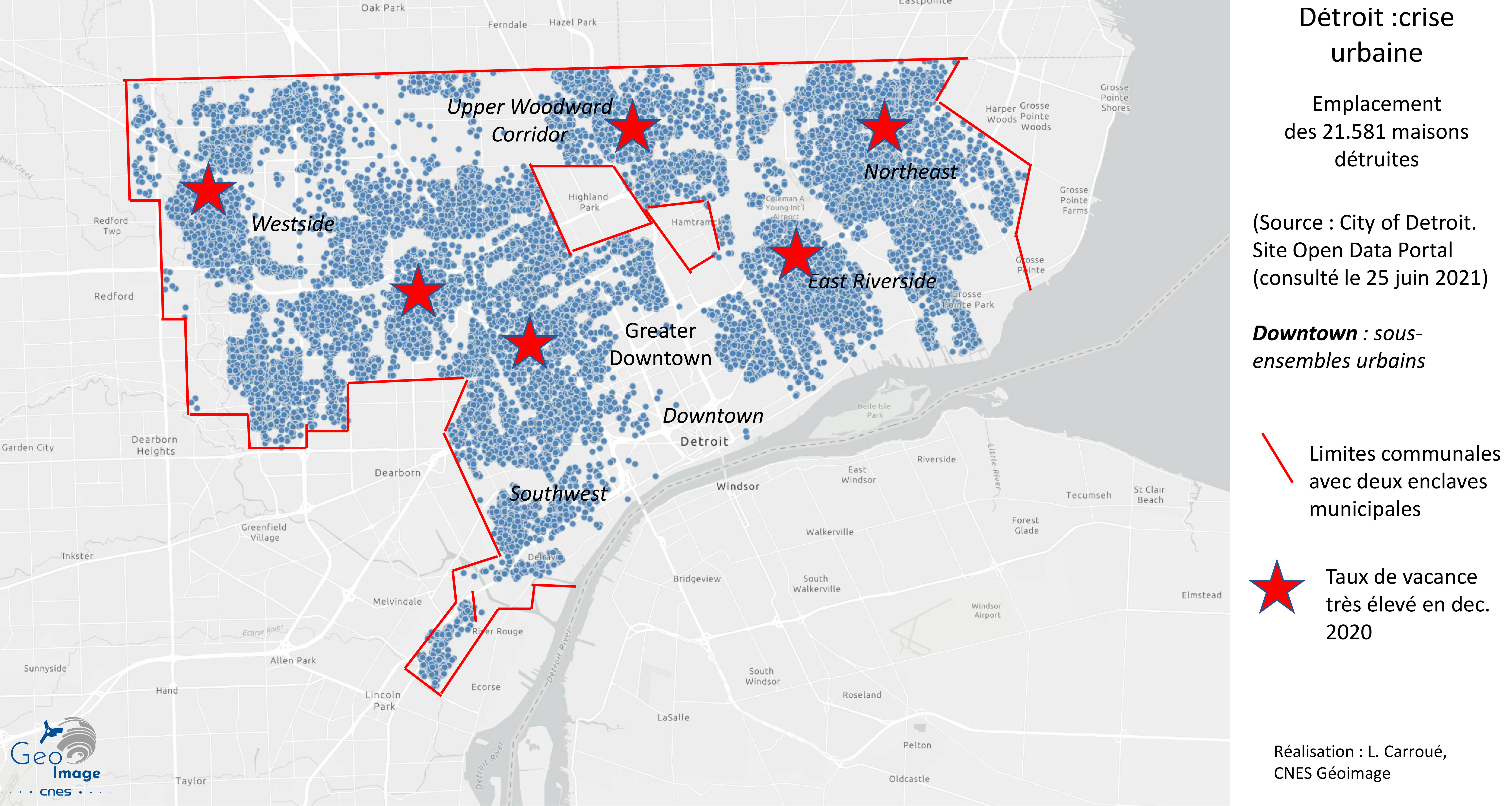 Ville de 670 000 habitants dans une grande région métropolitaine de 6,3 millions d’habitants, Détroit fut le berceau de l’industrie automobile. Cette Motor City des Grands Lacs dominée par les Big Three - Ford, General Motors et Chrysler - traverse depuis les années 1970 une crise systémique, à la fois économique, industrielle, sociale et urbaine. Les processus de hiérarchisation, de ségrégation fonctionnelle et raciale et d’évitement ont débouché sur un effondrement de sa population, de son tissu productif et de son cadre urbain, la transformant en une icône des « Shrinking Cities ». Face à l’abandon de dizaines de milliers de pavillons sur 65 % de son territoire communal, les destructions massives ont créé un espace-mosaïque singulier alors que l’initiative privée réinvestit quelques sites privilégiés (CBD, Midtown, rives fluviales).