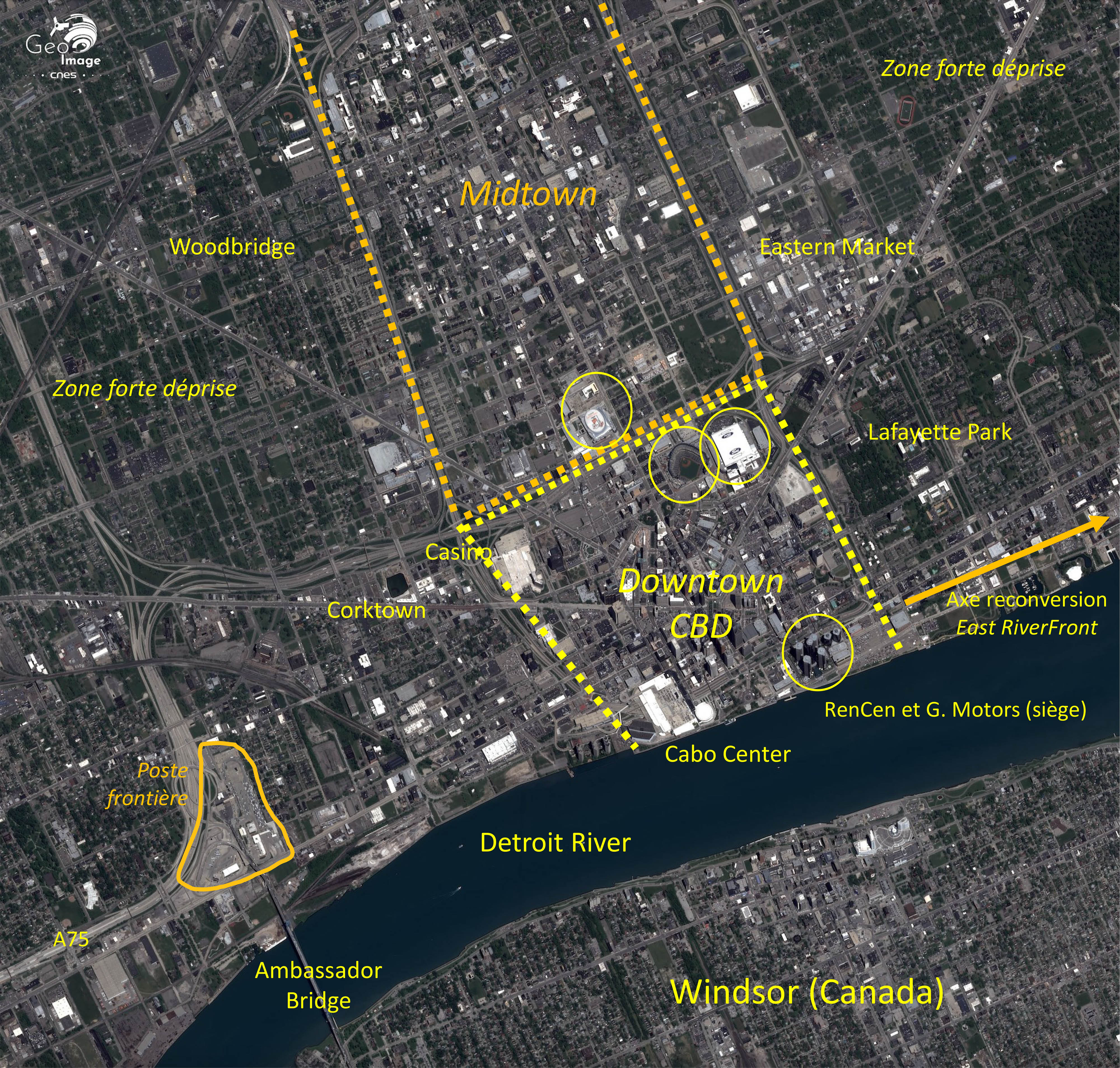 La centralité du pouvoir économique : le CBD. Le second facteur d’organisation s’articule à l’exercice du pouvoir économique et financier symbolisé par l’importance du quartier des affaires, ou Central Business District. Posé sur la rive droite du fleuve, la Rivière Détroit, qui relie le Lac Saint-Clair au Lac Erié, face à la rive canadienne et à la ville jumelle de Windsor, il accueille les plus hautes tours. Elles dessinent ainsi comme dans chaque grande métropole une skyline, à chaque fois singulière. Ce CBD accueille à Détroit le siège de General Motors, les institutions financières, les grands hôtels, les grands administrations fédérales....